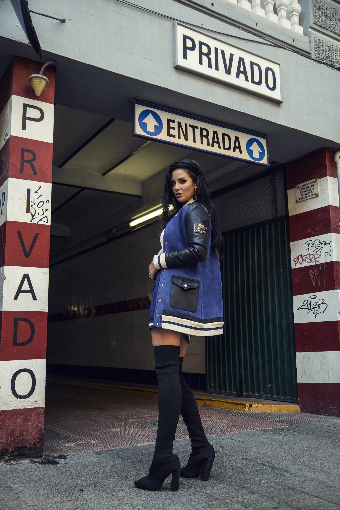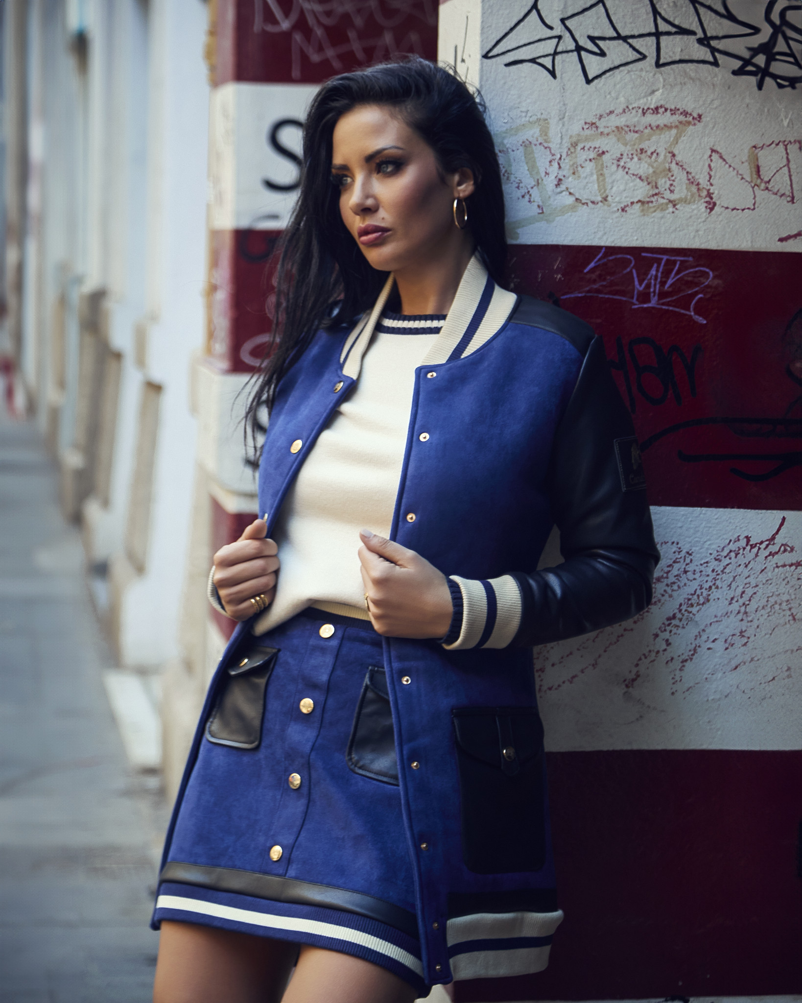 Chaqueta azul klein de antelina, estilo universitaria, con borreguito sintético en interior. Mangas y hombros con detalles de eco piel en negro. Cierre central con botones delanteros en dorado. Doble bolsillo frontal de eco piel con solapa y botón dorado. Puños y bajo y cuello en goma con franjas beige. Parte trasera lisa.