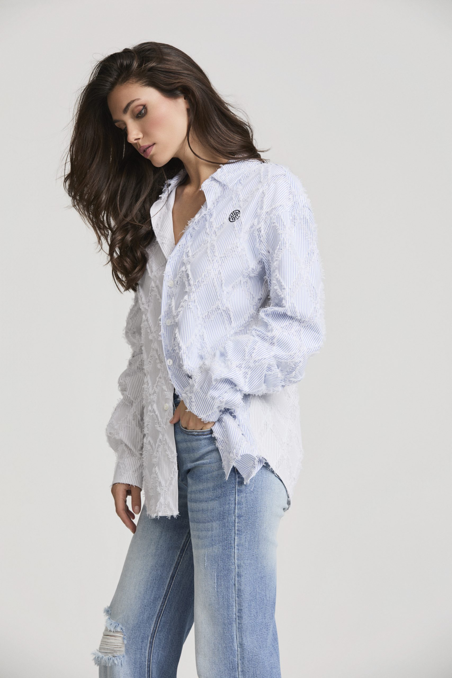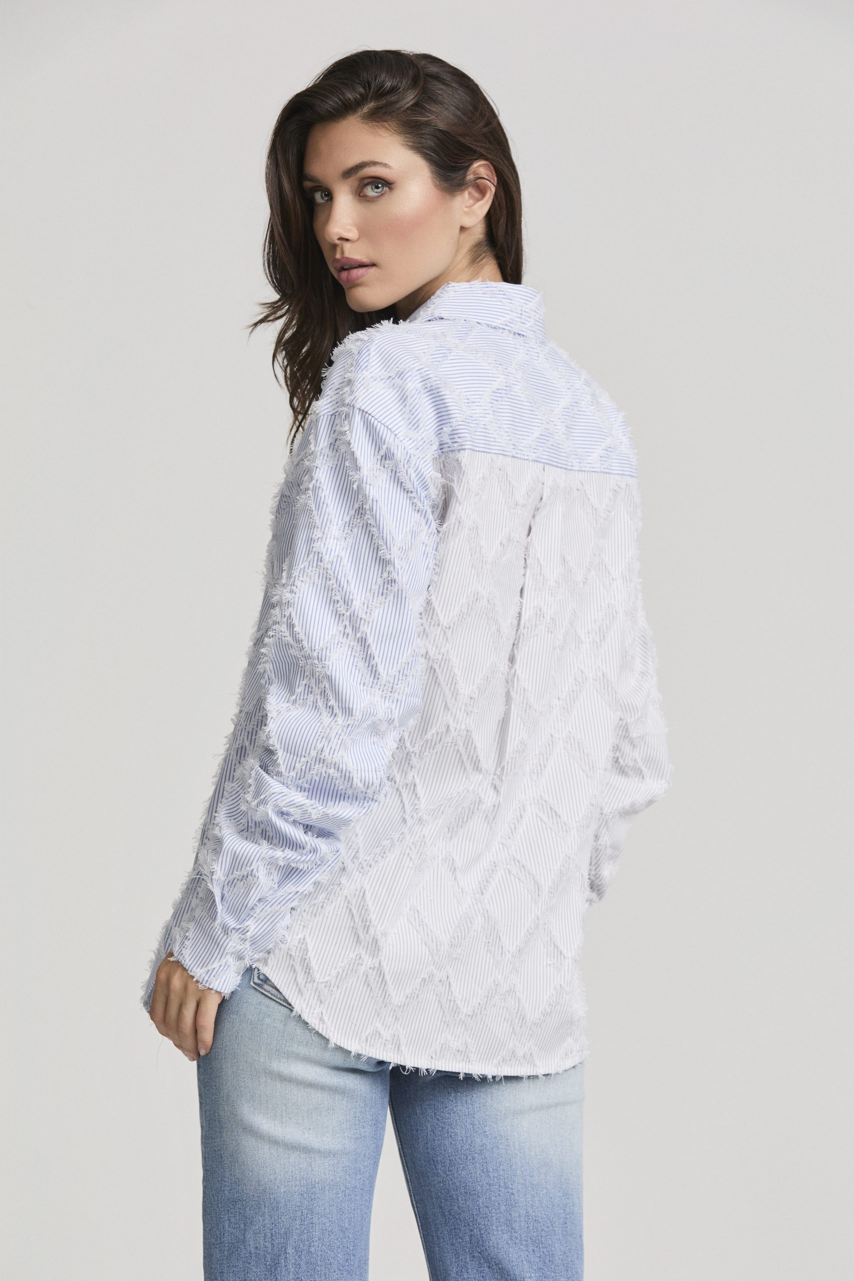 Reinventa tu estilo con esta camisa única que fusiona dos versiones del clásico estampado de rayas en una sola prenda. Confeccionada en algodón suave y ligero, destaca por su textura artesanal en forma de rombos deshilachados, que le aporta un toque exclusivo y contemporáneo.