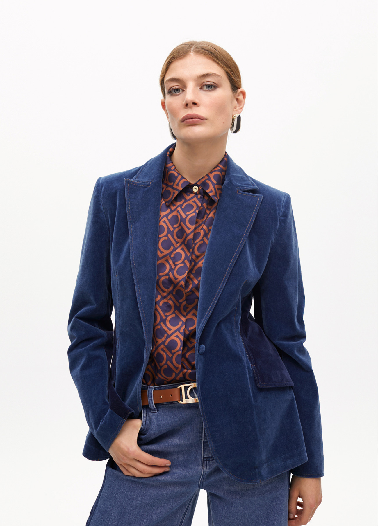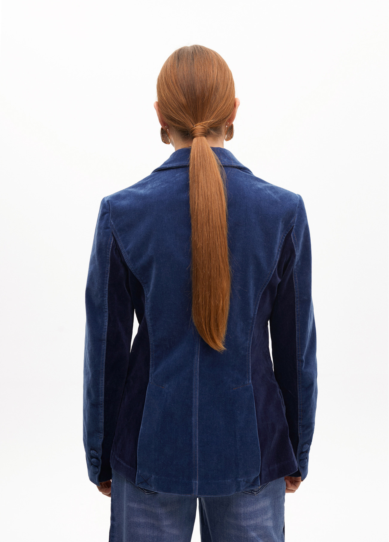 Americana entallada de denim con acabado en terciopelo suave. Presenta detalles en los laterales que realzan la figura. Cierre de botón frontal y solapa clásica. Perfecta para un look sofisticado y moderno.