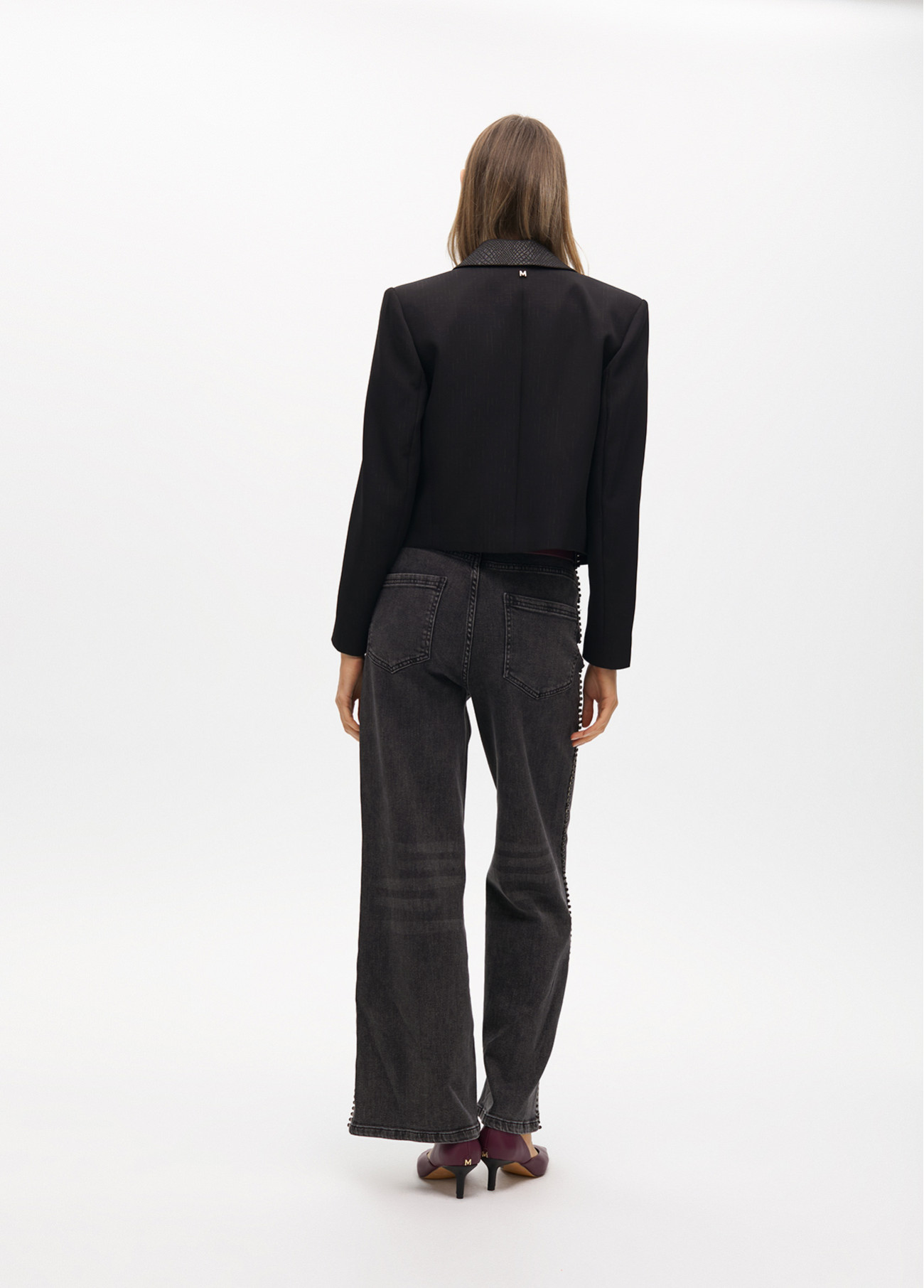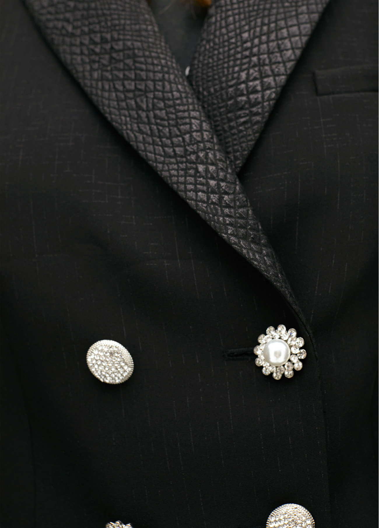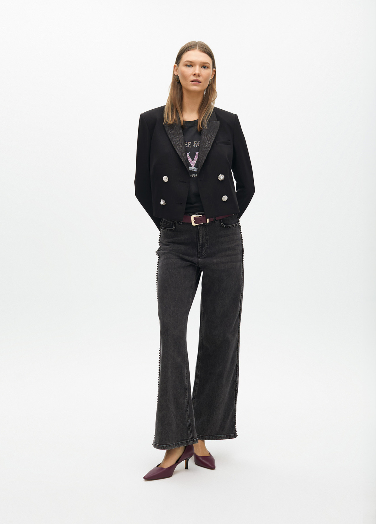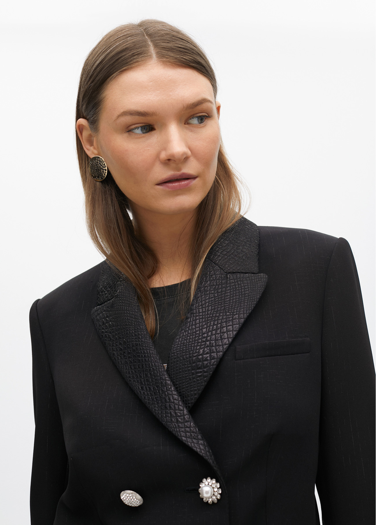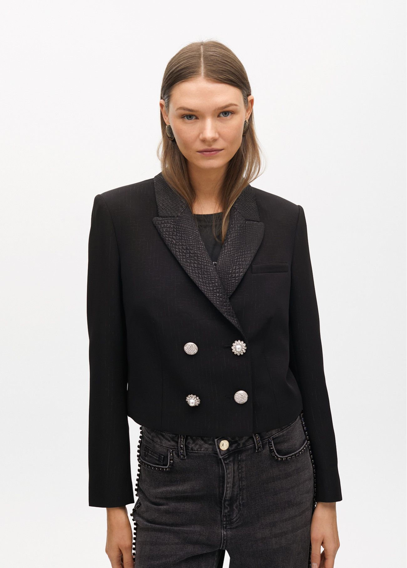 Elegante americana corta con solapa de animal print y botones joya. Diseñada en tejido de alta calidad, proporciona un ajuste perfecto. Ideal para un look sofisticado gracias a sus detalles exclusivos.