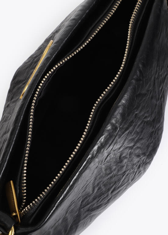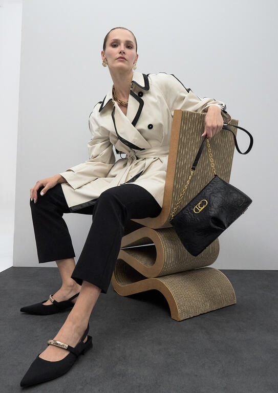 Bandolera pequeña en color negro, confeccionada en material texturizado con cierre de cremallera. Detalle de cadena dorada y logotipo metálico en el frente. Compacta pero espaciosa, perfecta para llevar lo esencial con estilo.