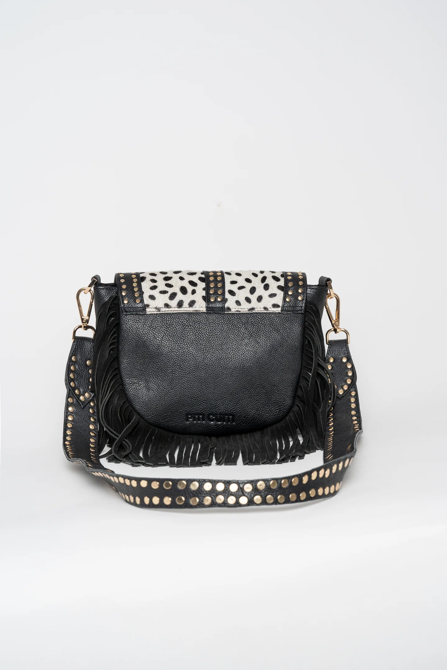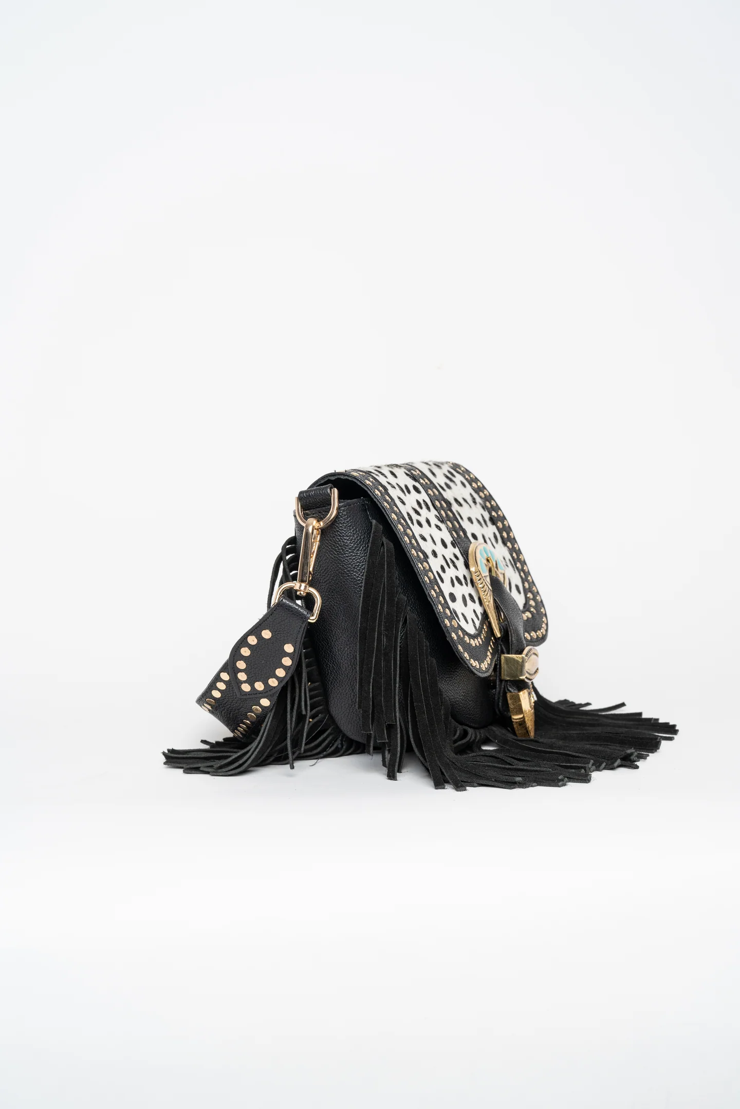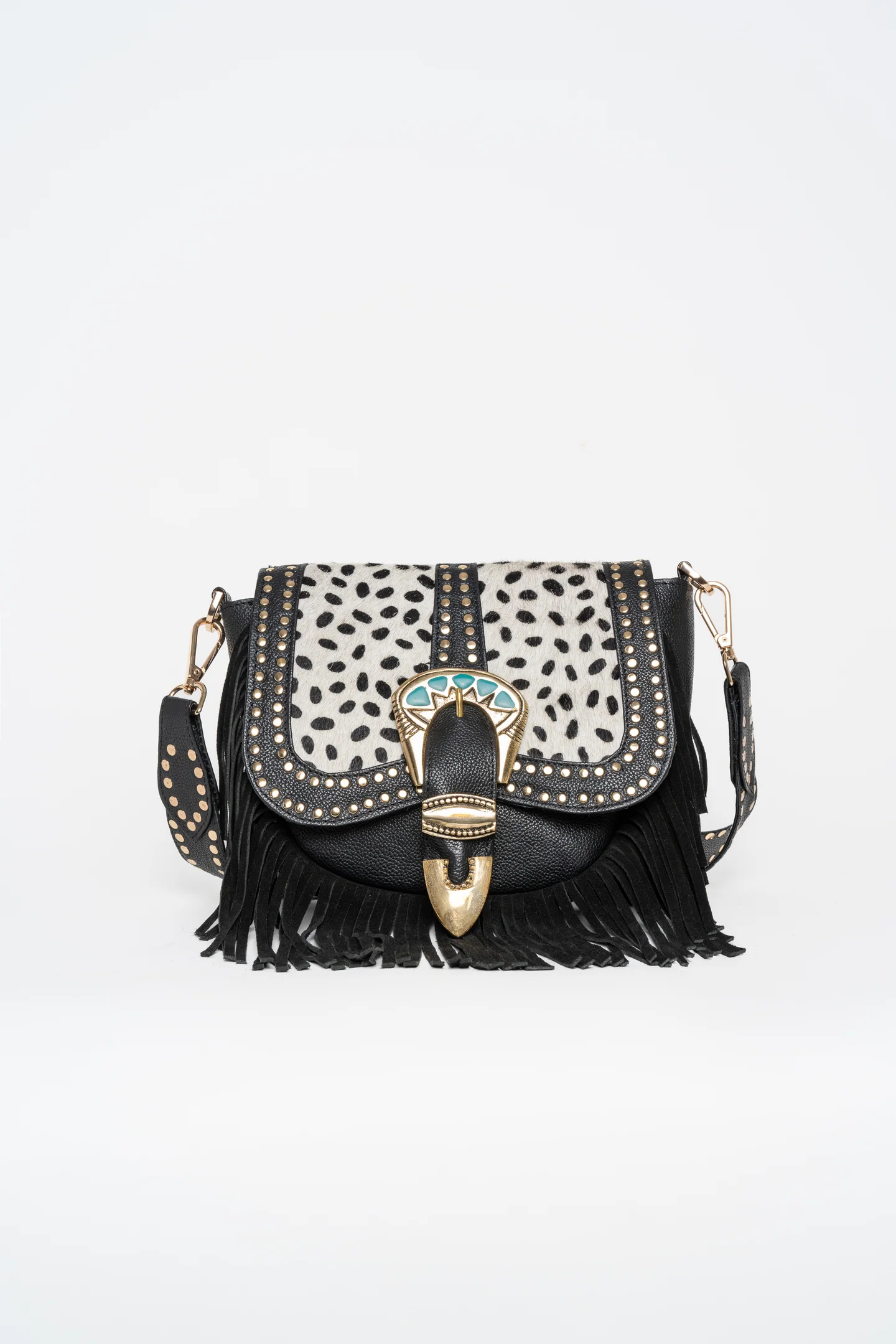 Bolso tipo bandolera con flecos y hebilla metalica en frente.