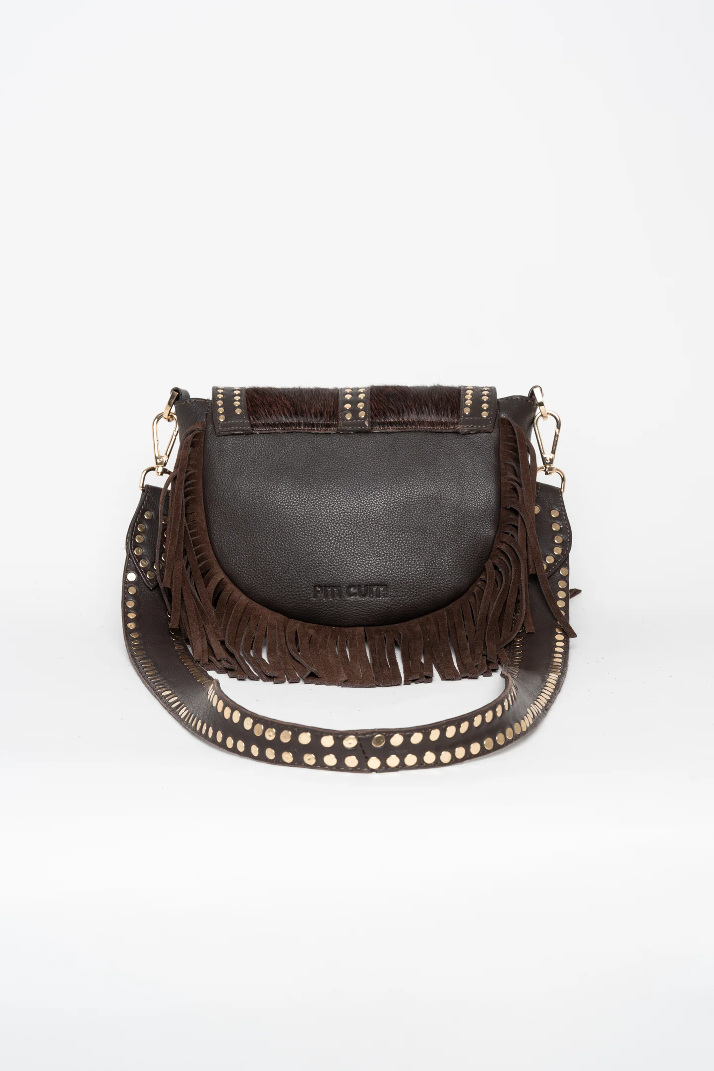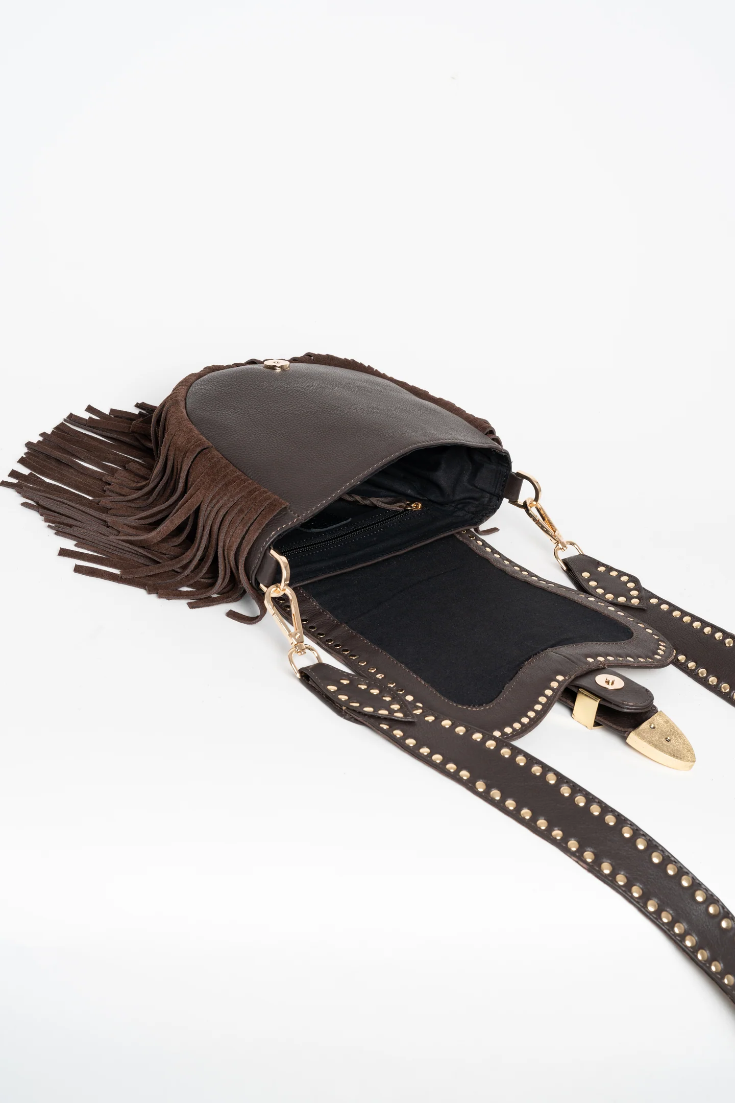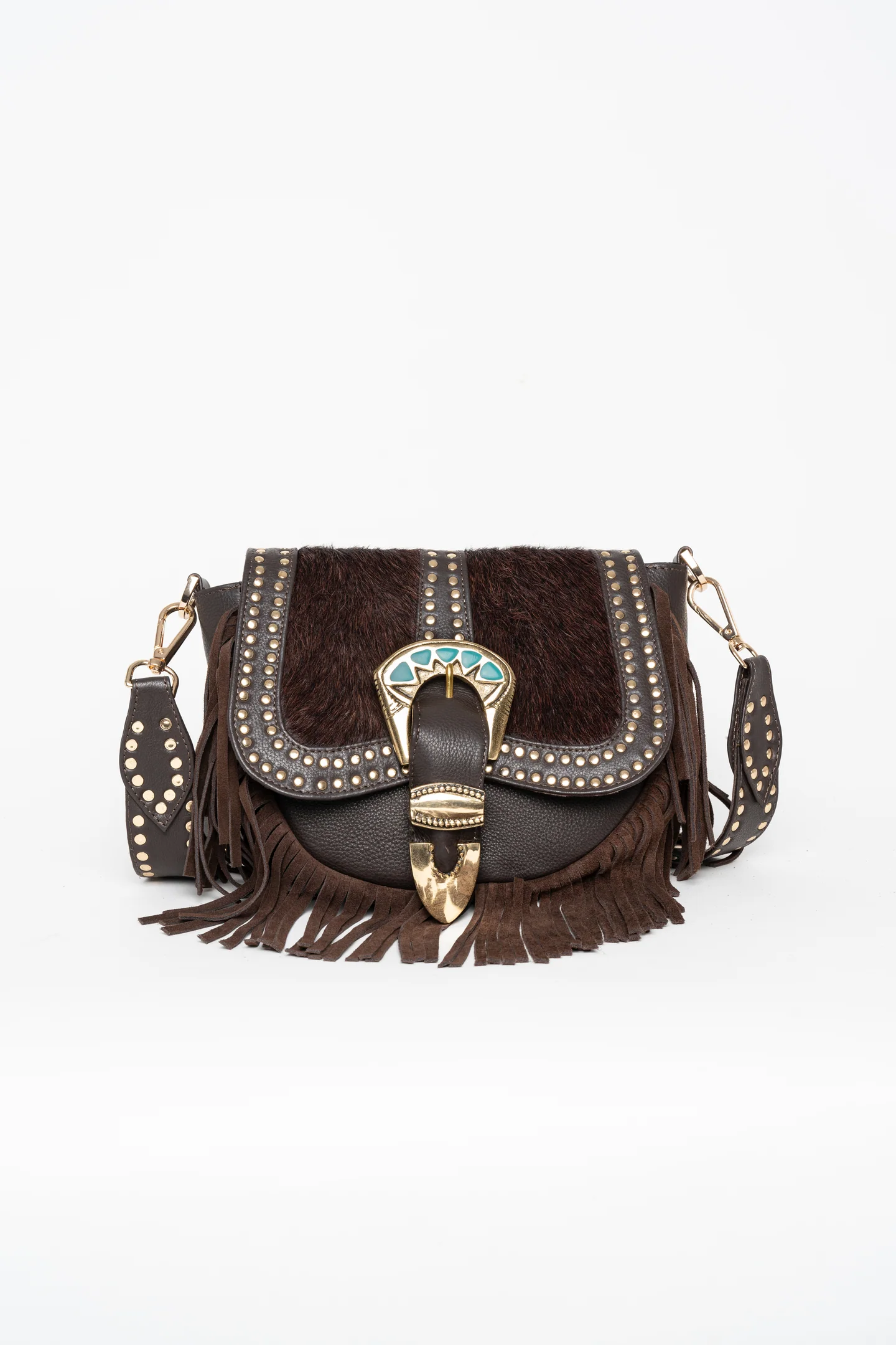 Bolso tipo bandolera con flecos y hebilla metalica en frente.