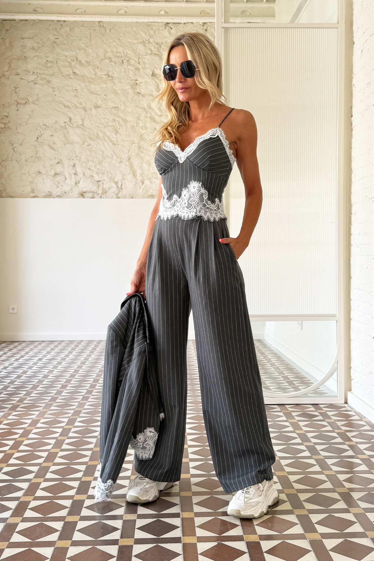 Blazer corta, en color gris con raya diplomática. En la parte de las mangas y en la parte baja de la blazer lleva encaje en color blanco. Se cierra con botón personalizado a la altura de la cintura.