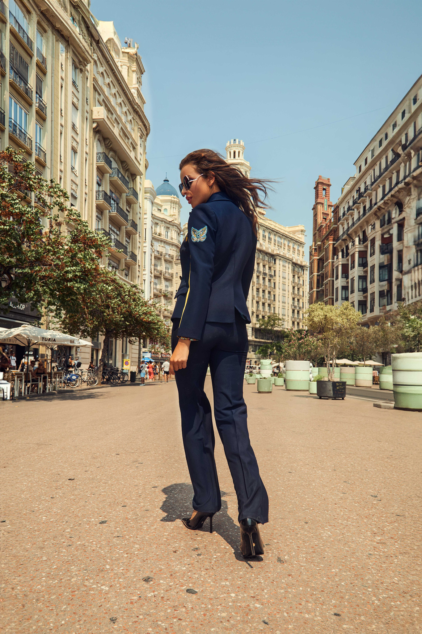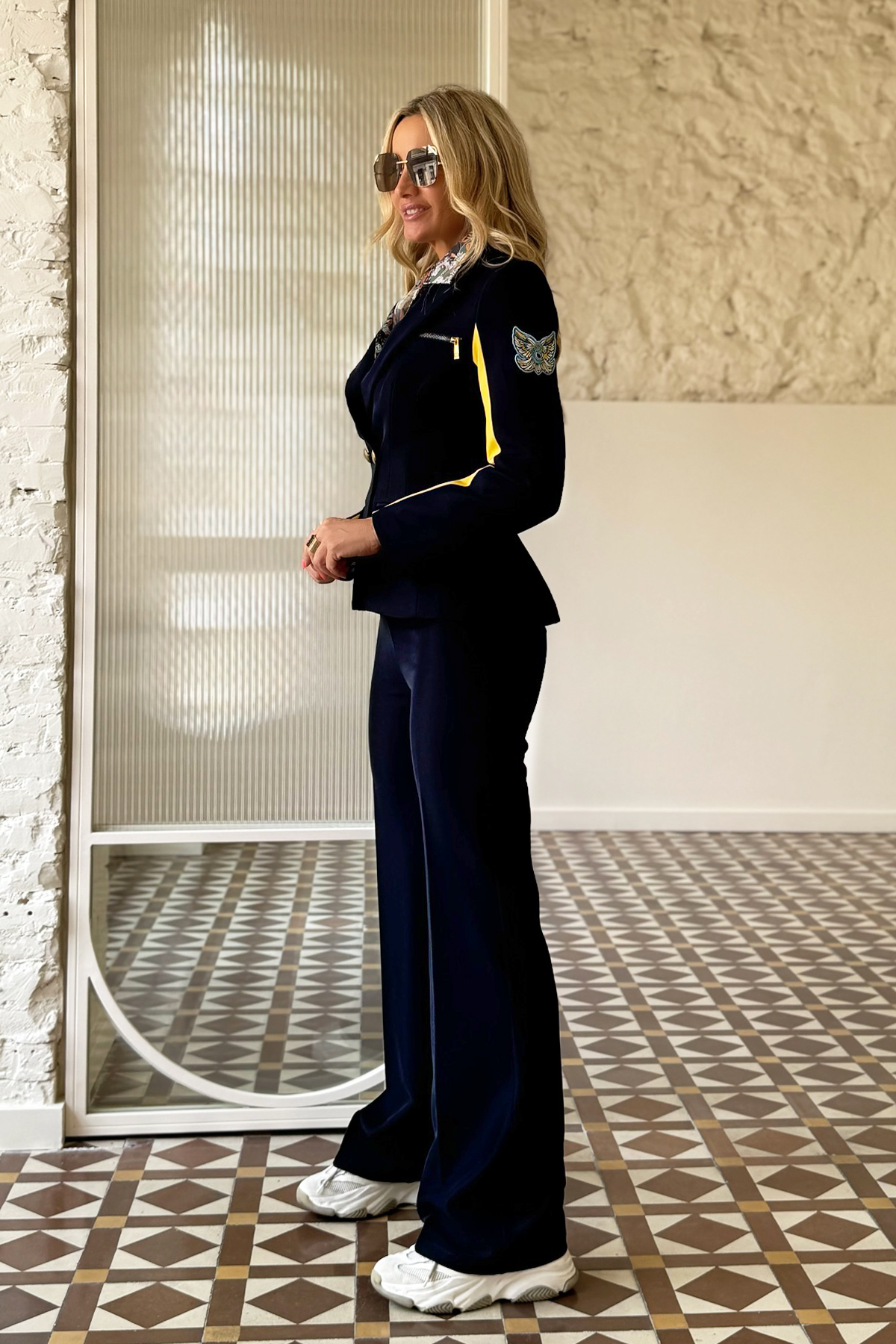 Blazer entallada, de color azul, con detalles en amarillo. Se cierra con botones dorados personalizados en la parte delantera. En uno de los brazos lleva bordado de la marca. Lleva bolsillos en la parte delantera.