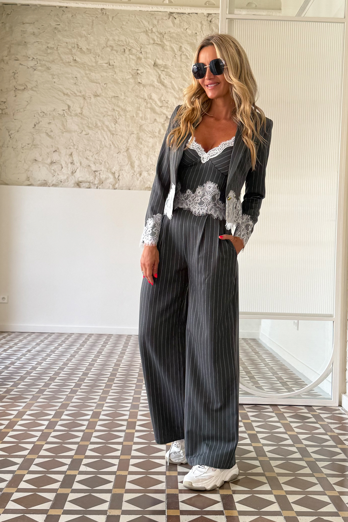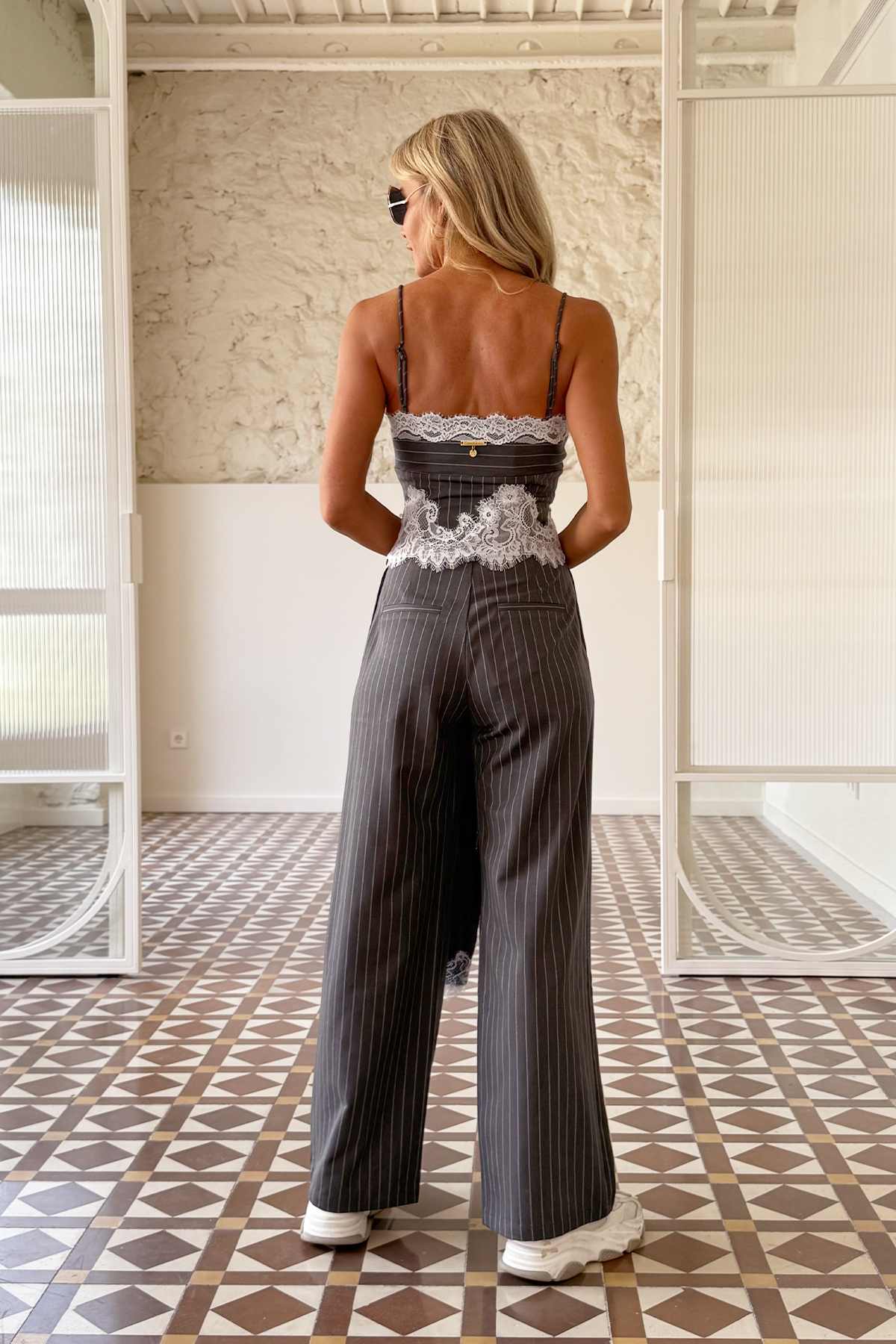 Blusa corta, en color gris con raya diplomática, escote de pico y tirante fino regulable. En la parte del pecho y la parte baja lleva encaje en color blanco. Se cierra con cremallera invisible lateral.