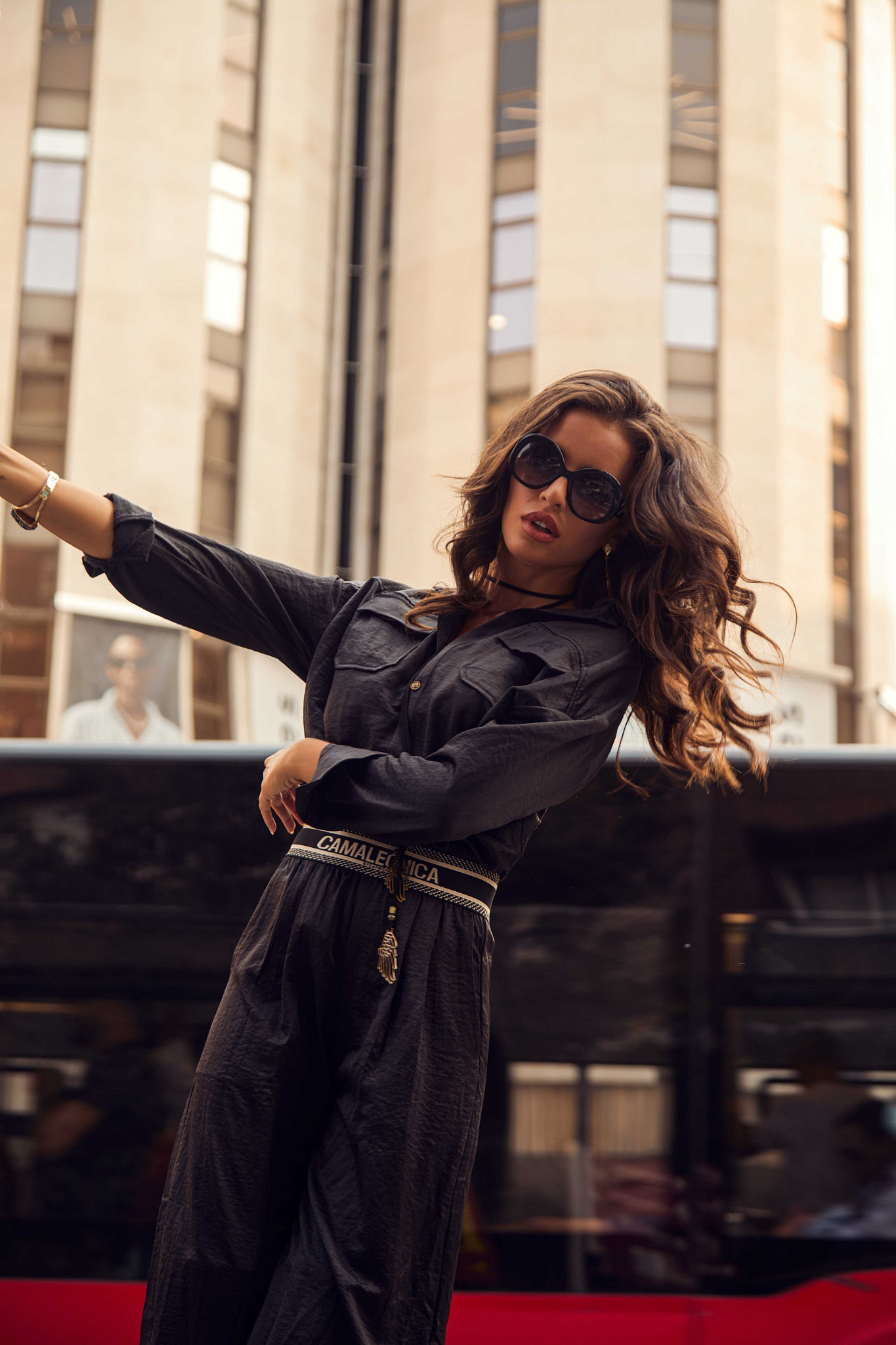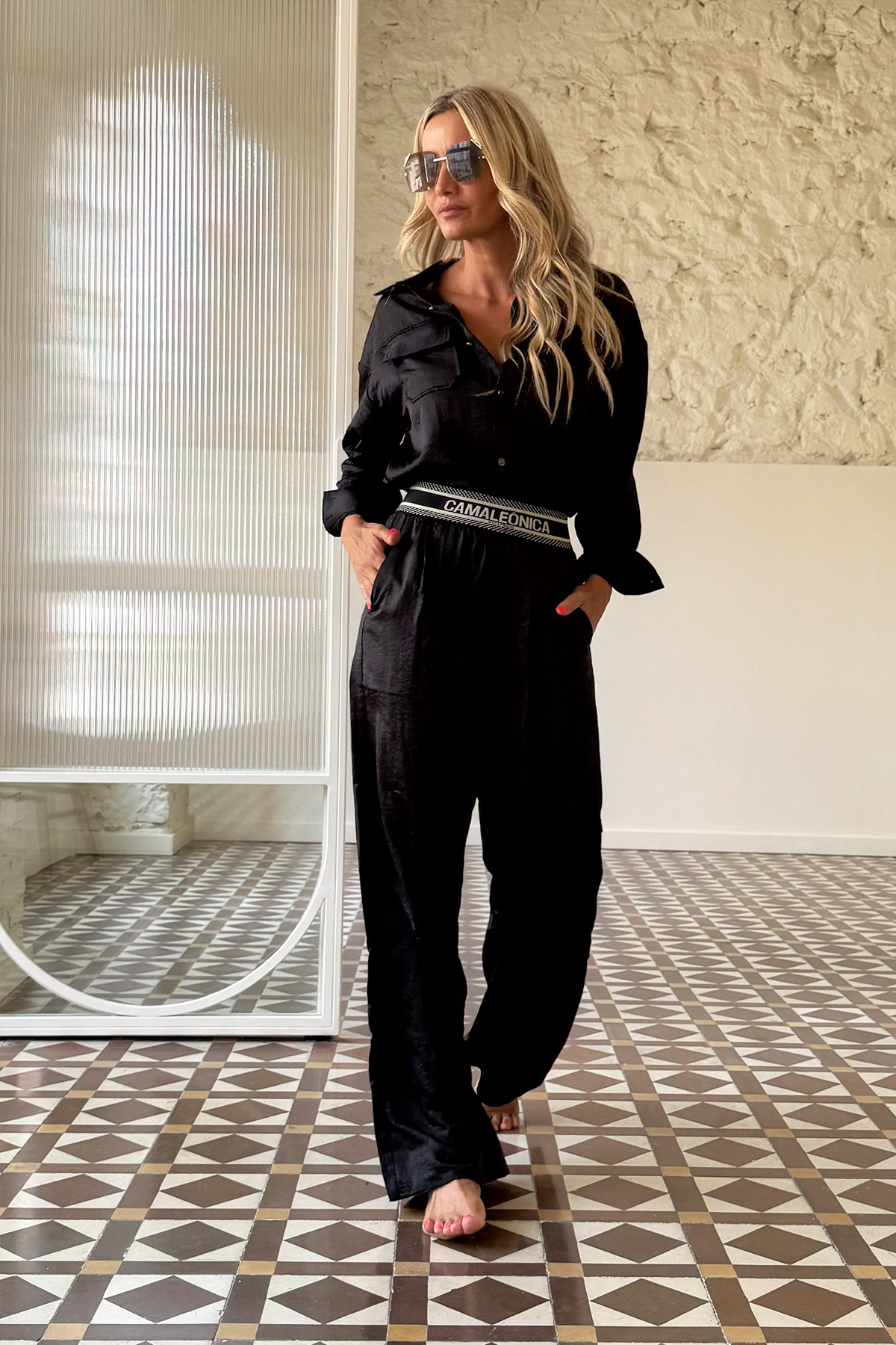 Blusa fluida en color negro, de tejido satinado. Lleva bolsillos en el pecho, con el logo de la marca bordado. Se cierra con botones en color ocre en la parte delantera y en los puños.