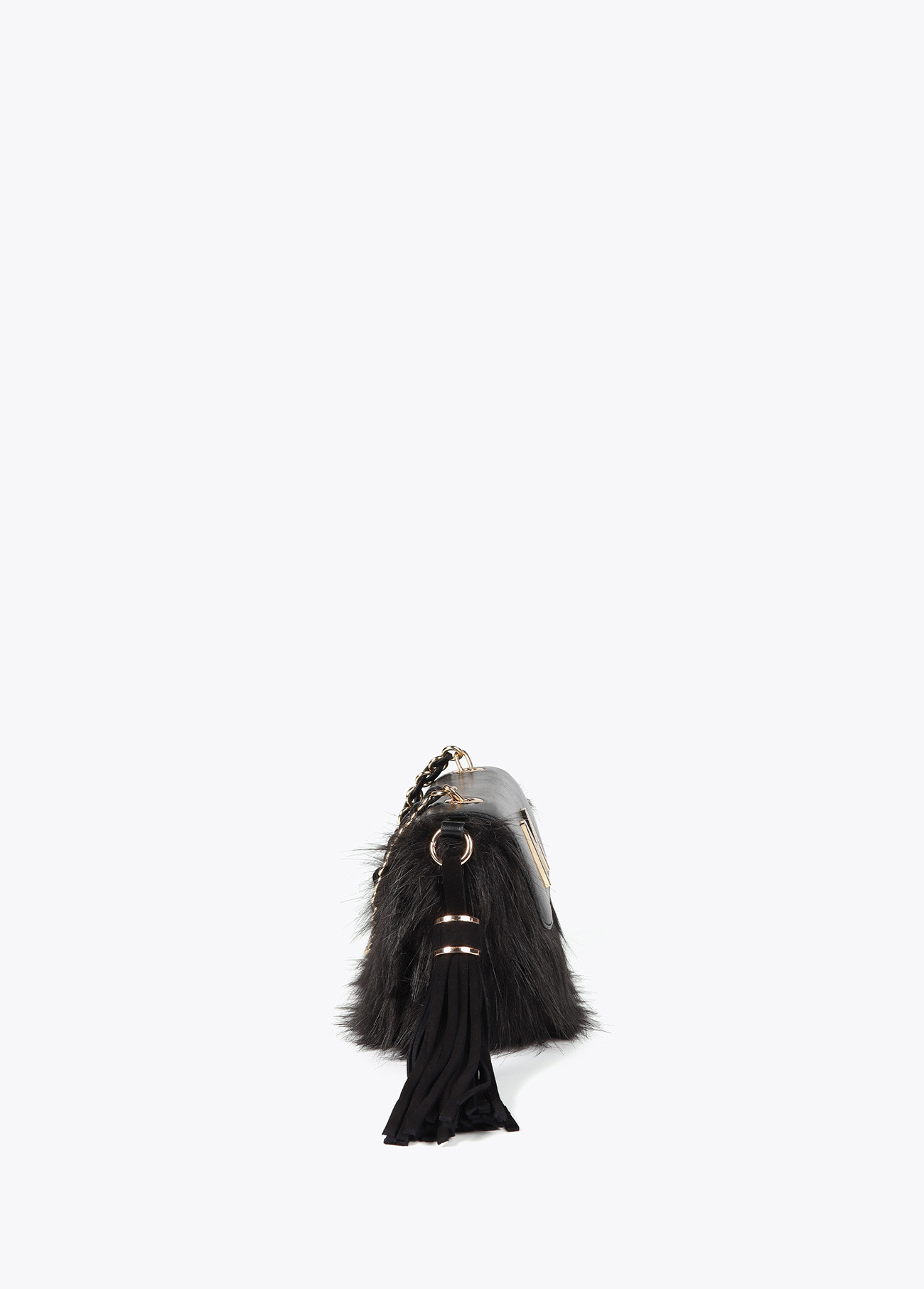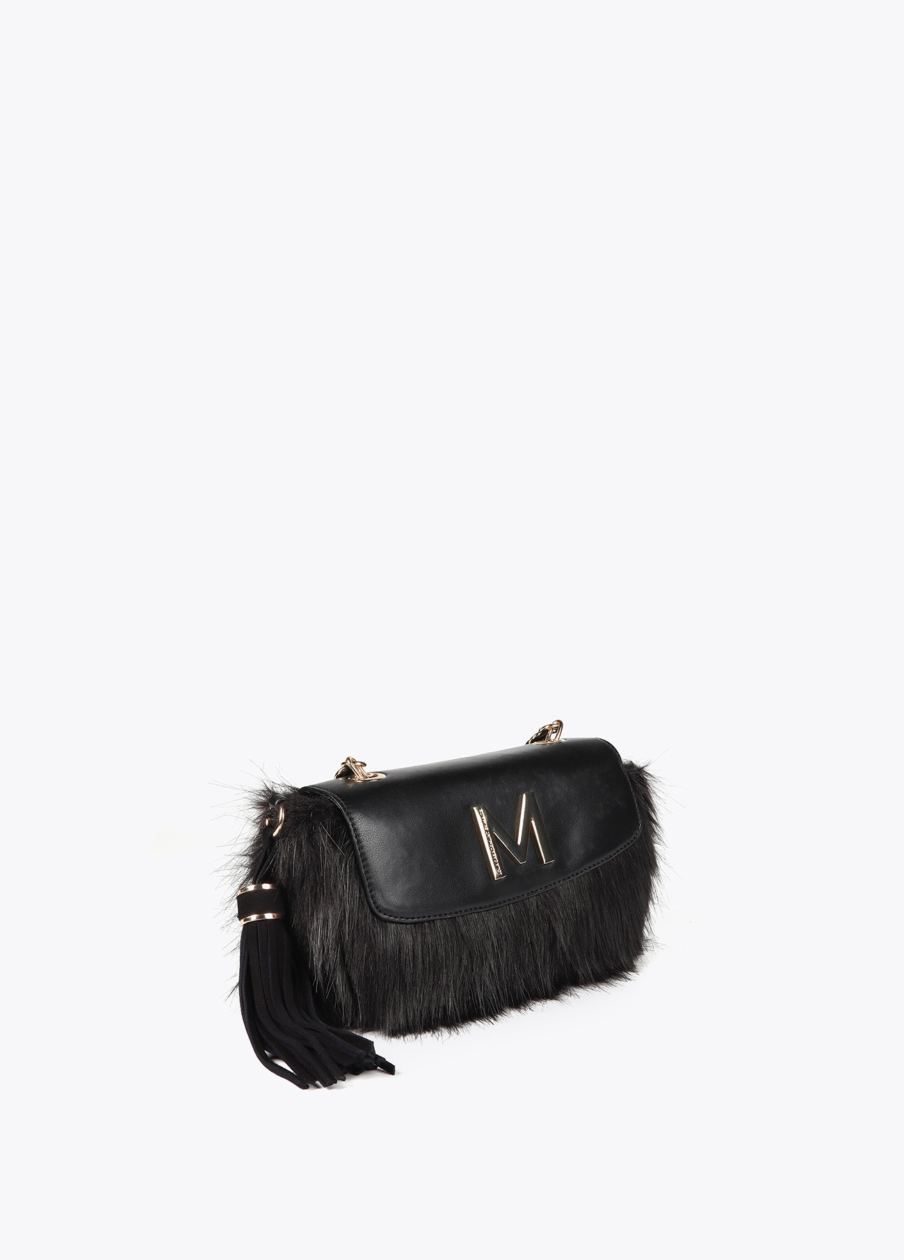 Bandolera sofisticada con solapa efecto piel y detalle de pelo. Cadena dorada combinada y cierre magnético. Incluye logotipo metálico en la solapa. Interior con compartimentos y un bolsillo con cremallera.