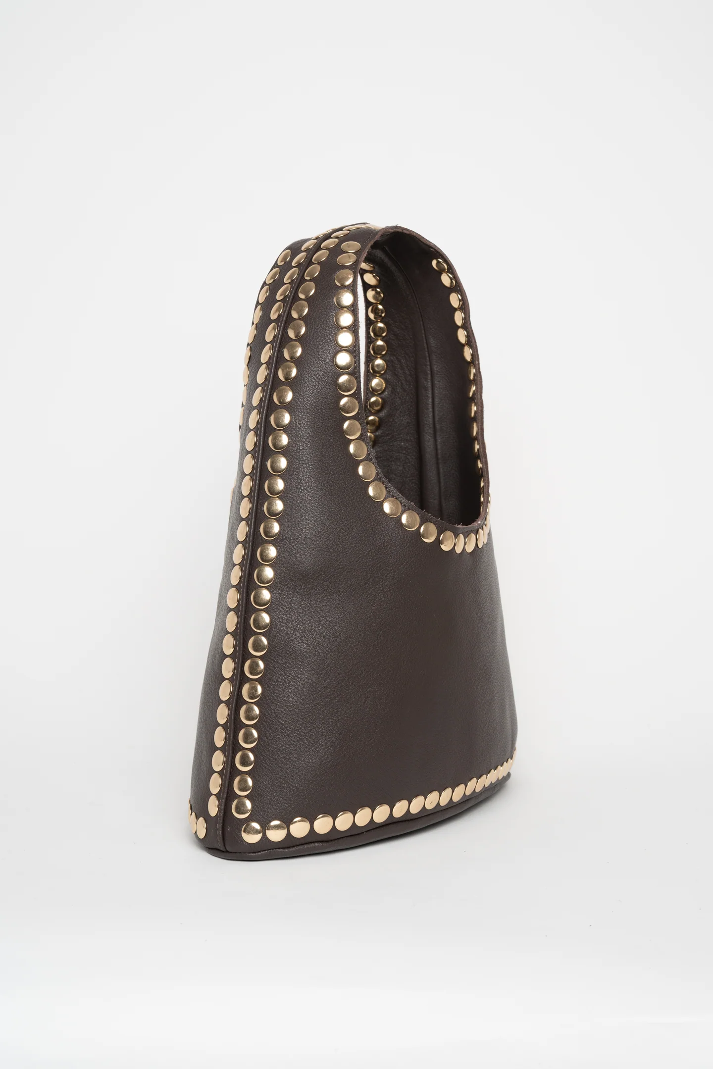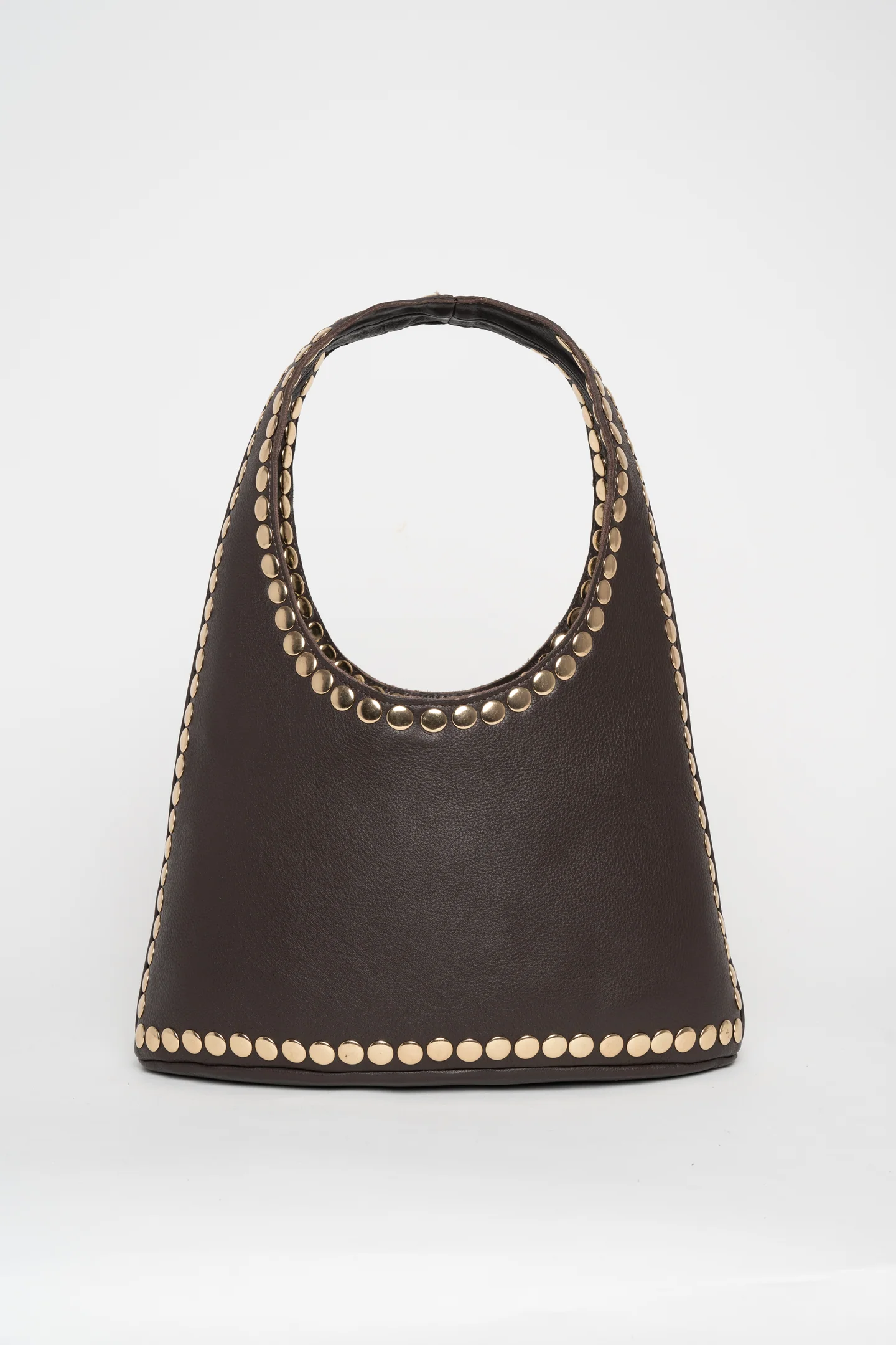 Bolso de piel con tachuelas y asa para llevar al hombro o de mano.