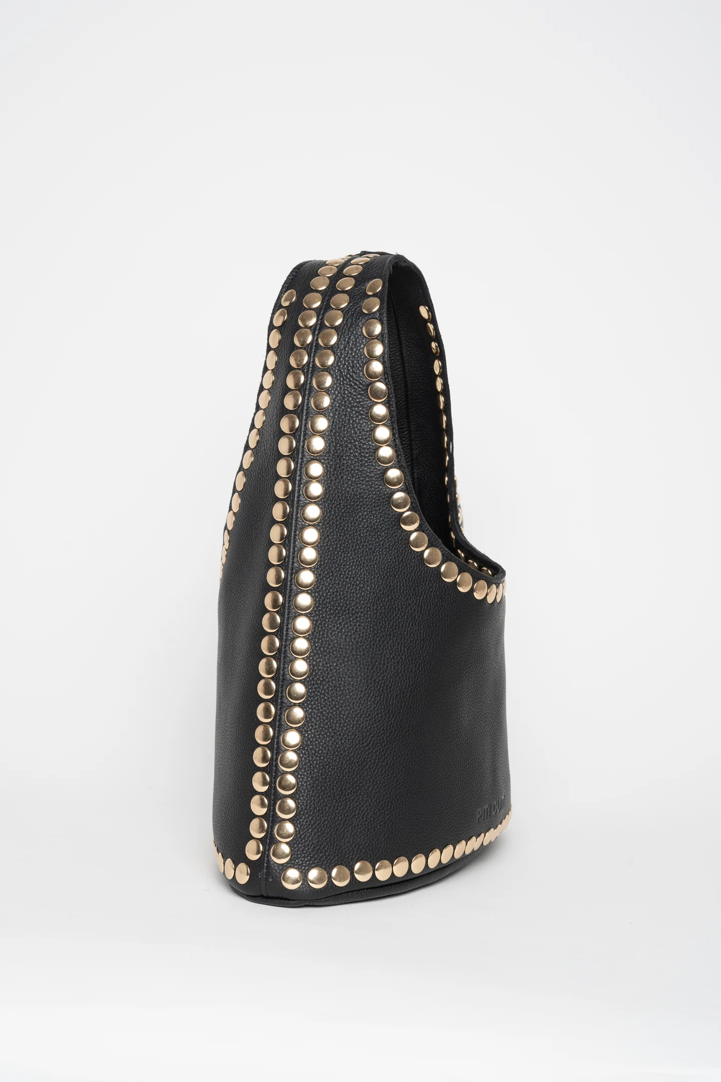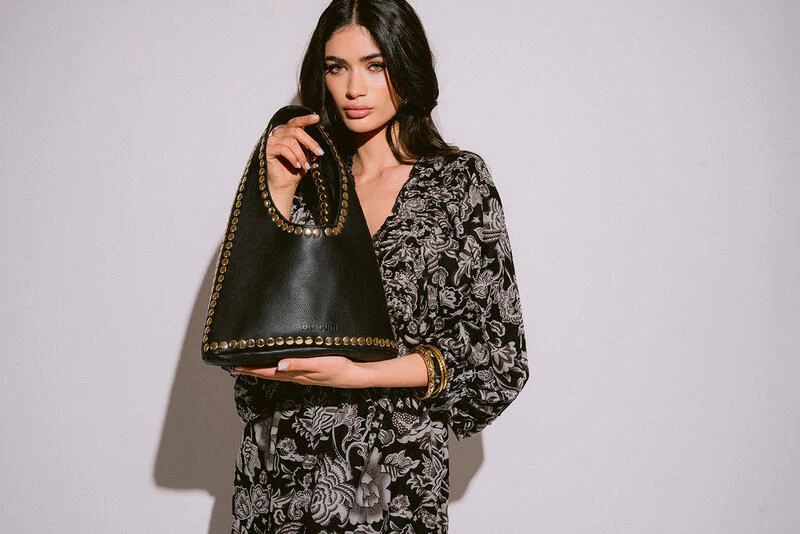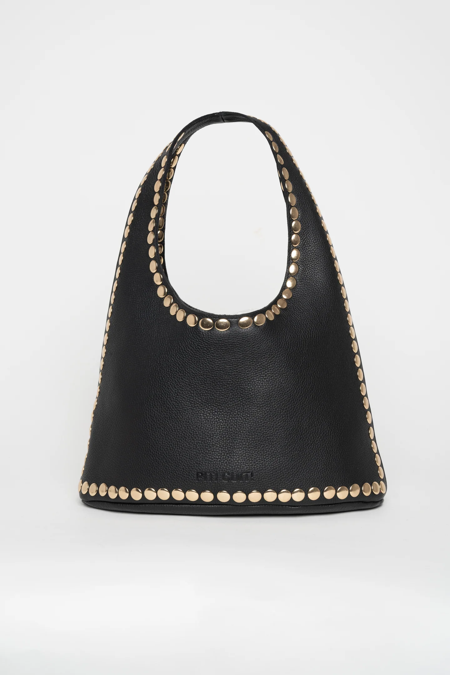 Bolso de piel con tachuelas y asa para llevar al hombro o de mano.
