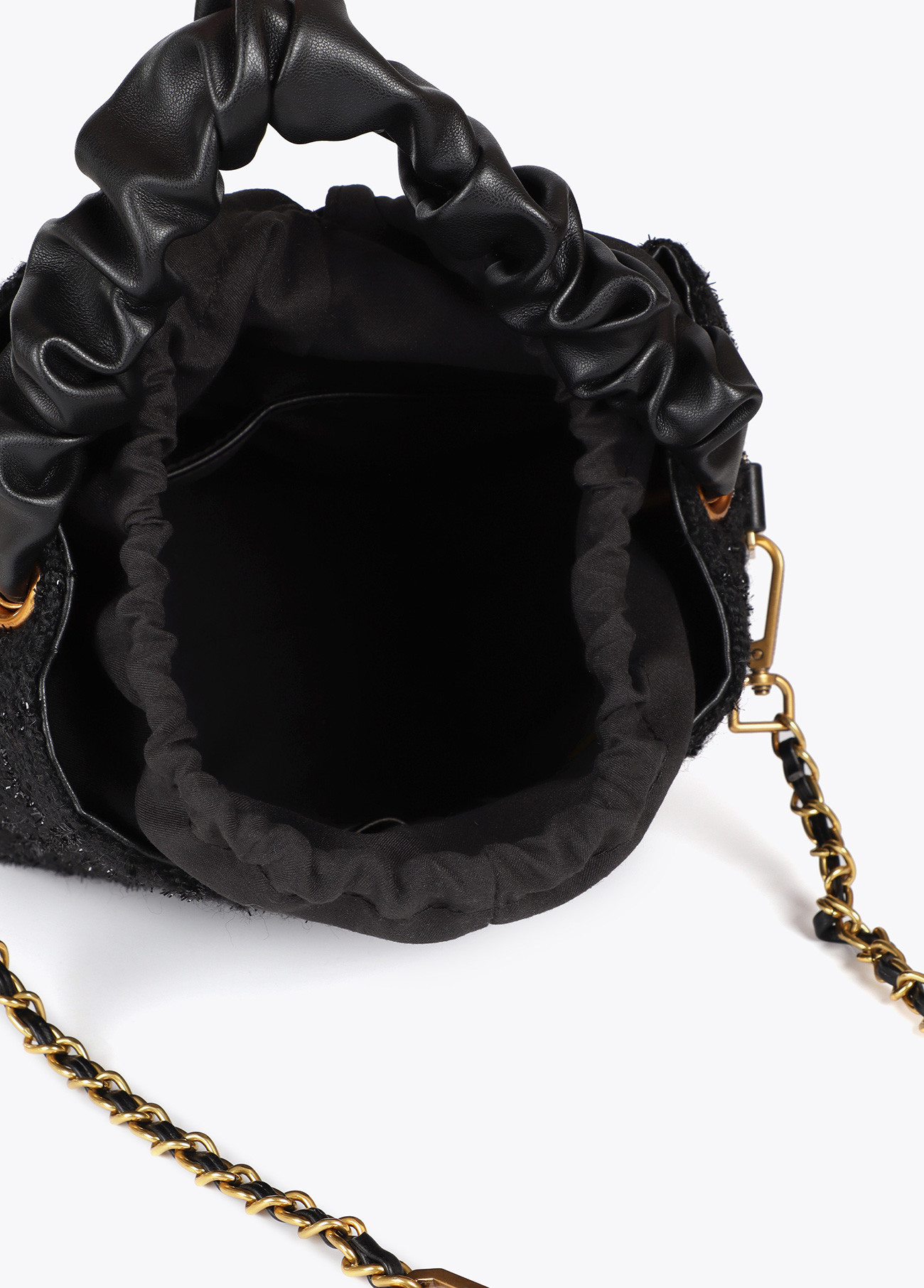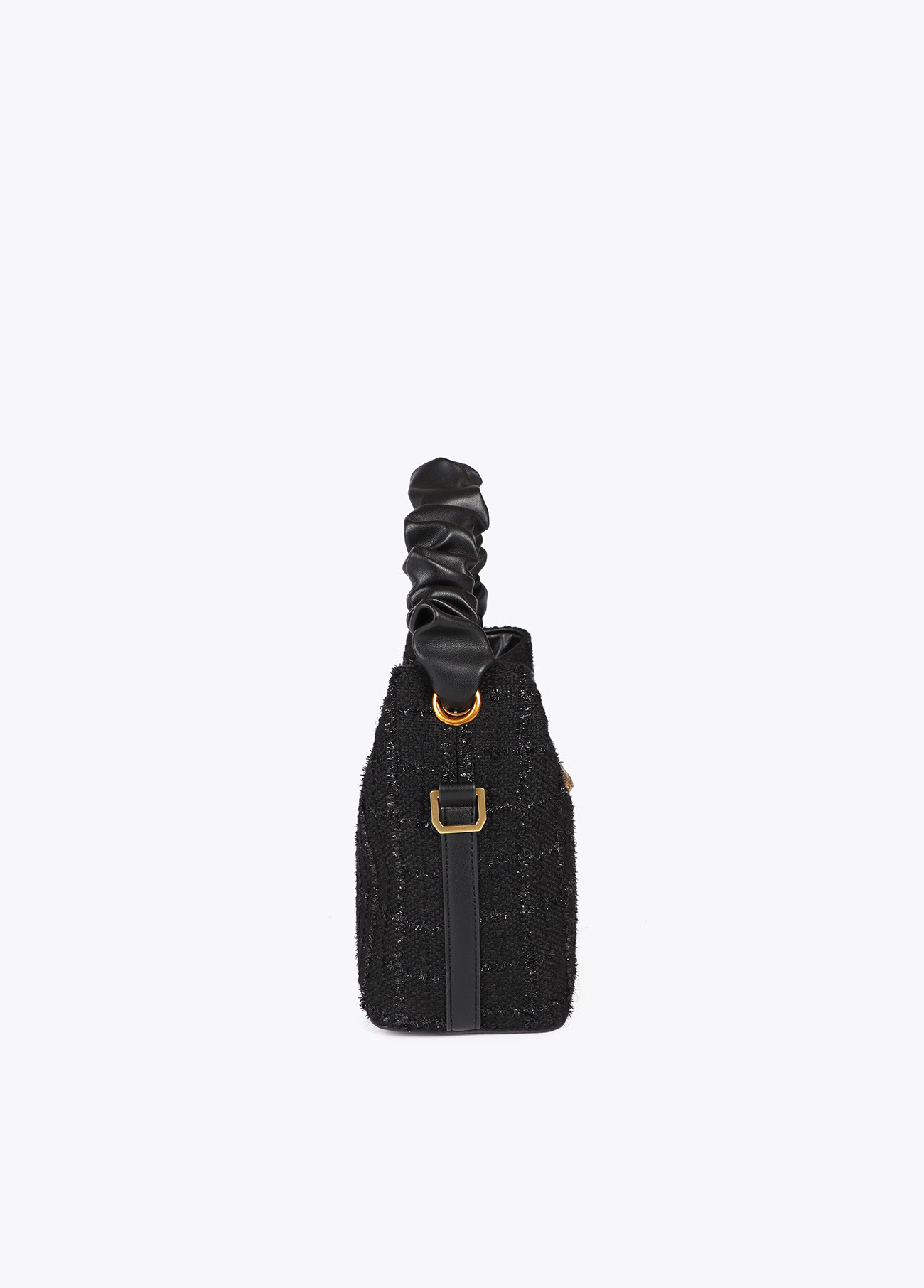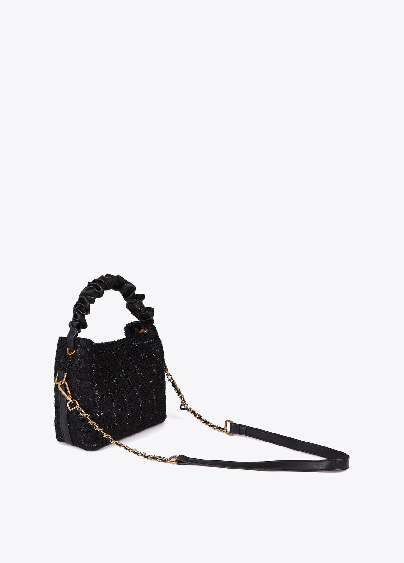 Bolso pequeño de tweed con asa fruncida en material sintético. Presenta un elegante logo LC en forma de leopardo dorado. Integra cadena desmontable y cierre seguro. Diseño compacto y sofisticado para completar cualquier look.