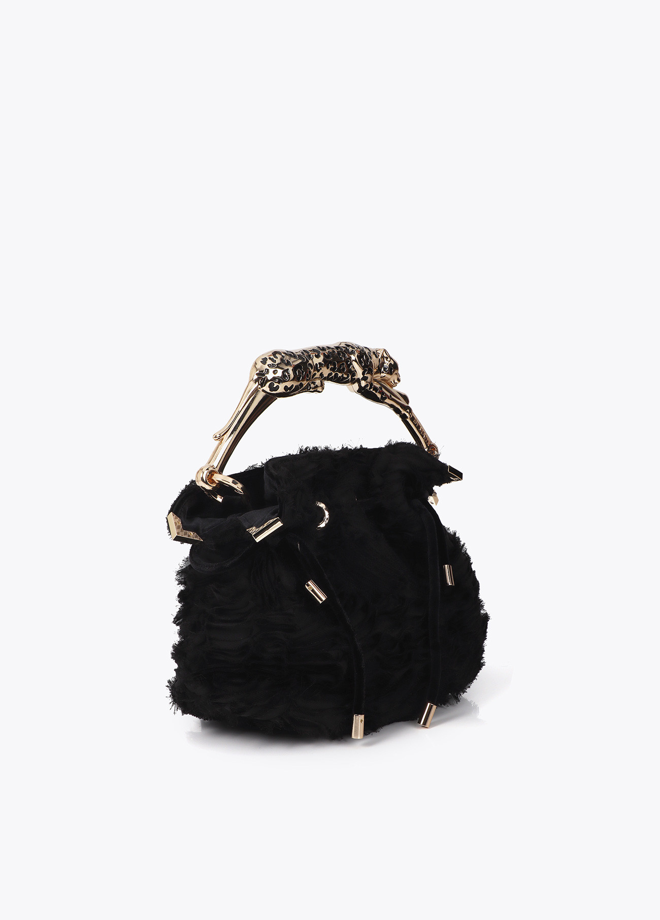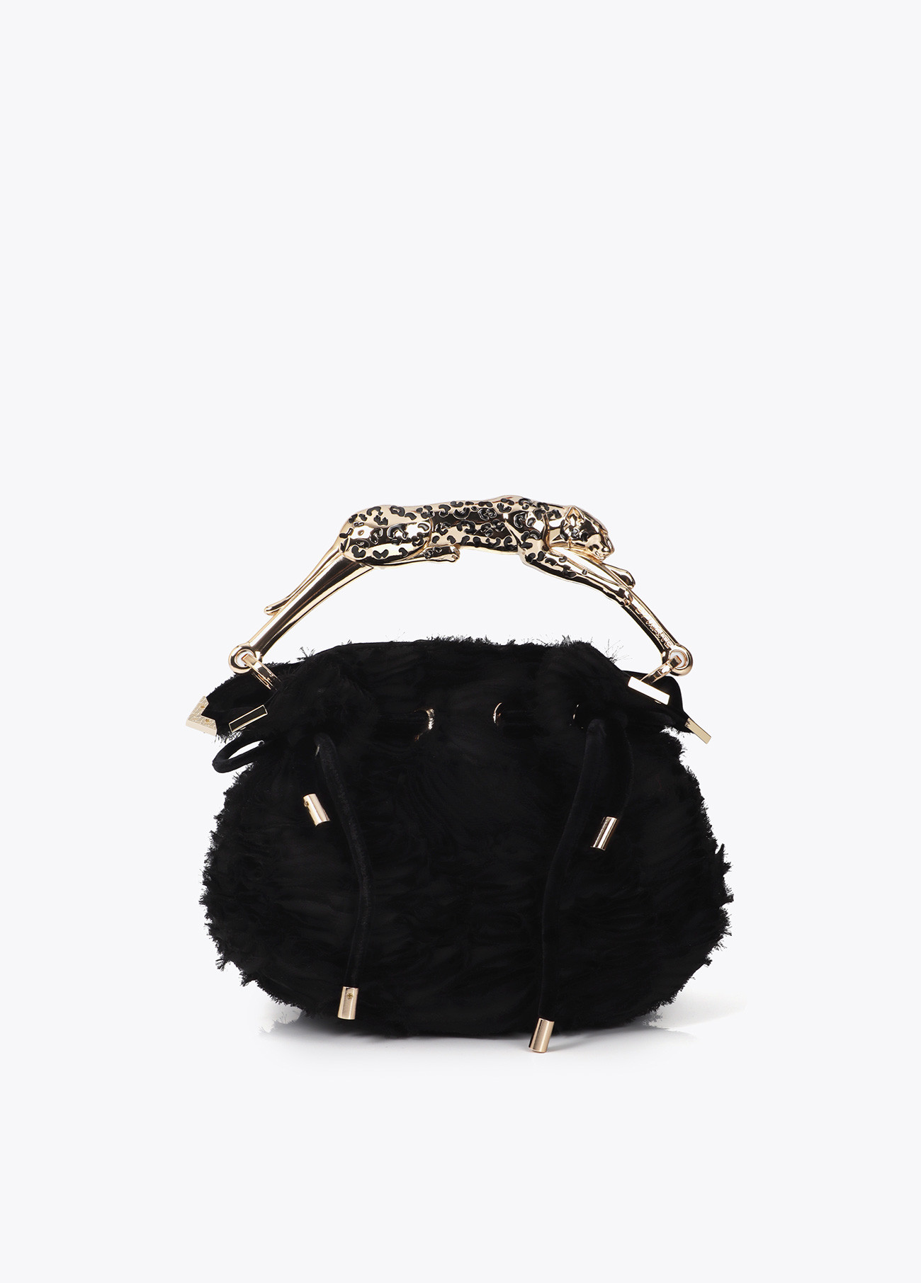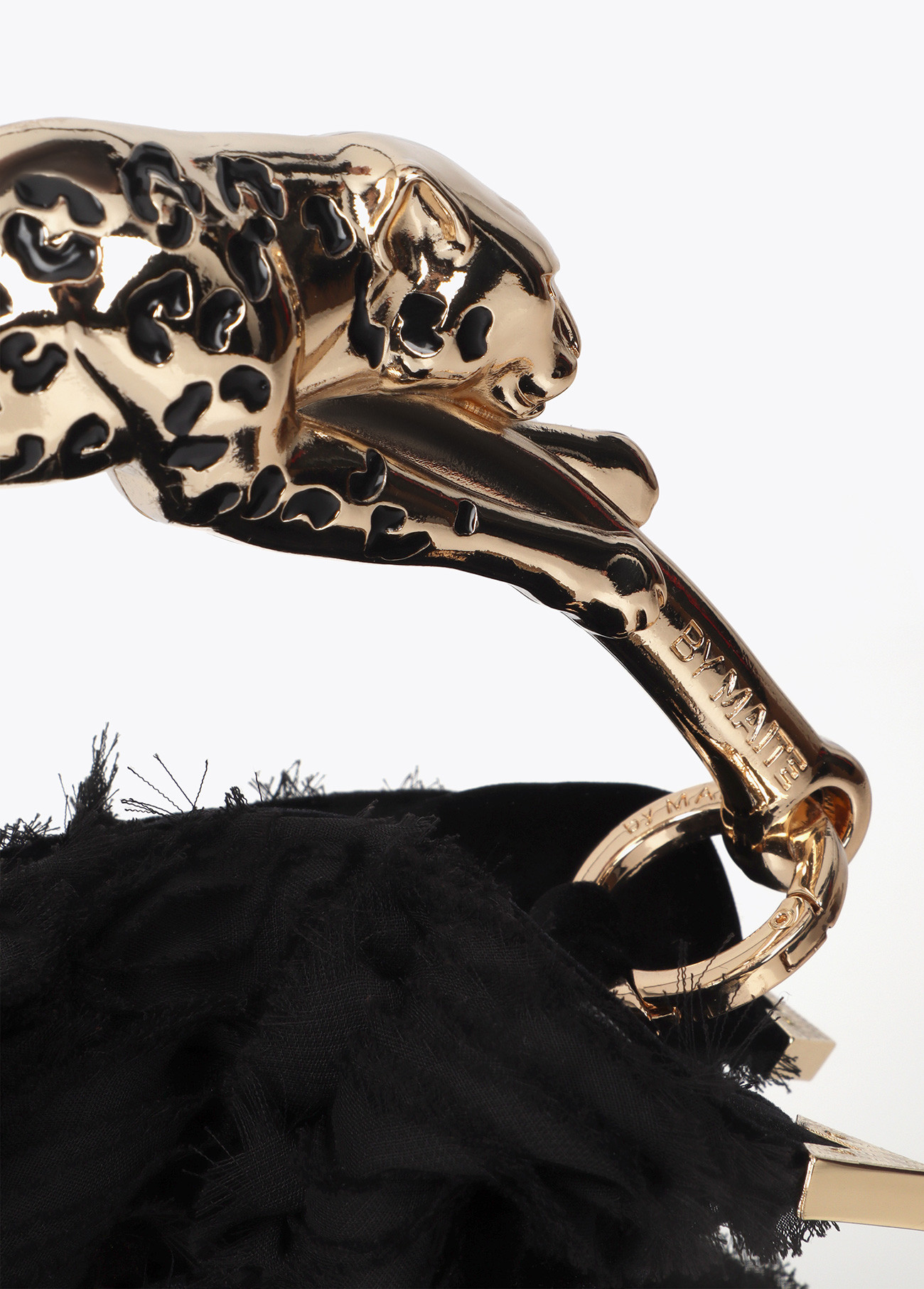 Elegante bolso tejido con diseño de fantasía y rosetones. Destaca por su asa metálica en forma de leopardo. Incluye cadena dorada desmontable. Un accesorio único que combina textura y sofisticación.