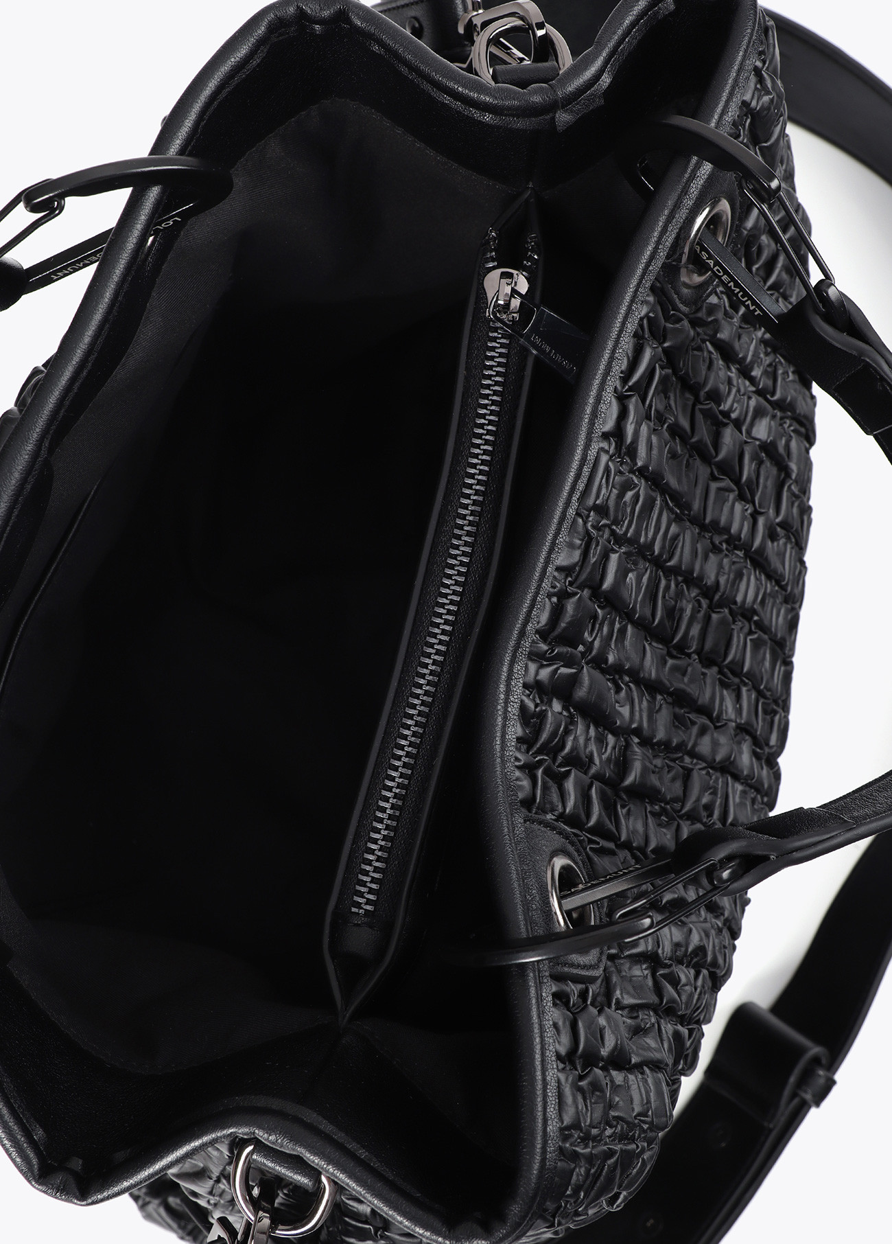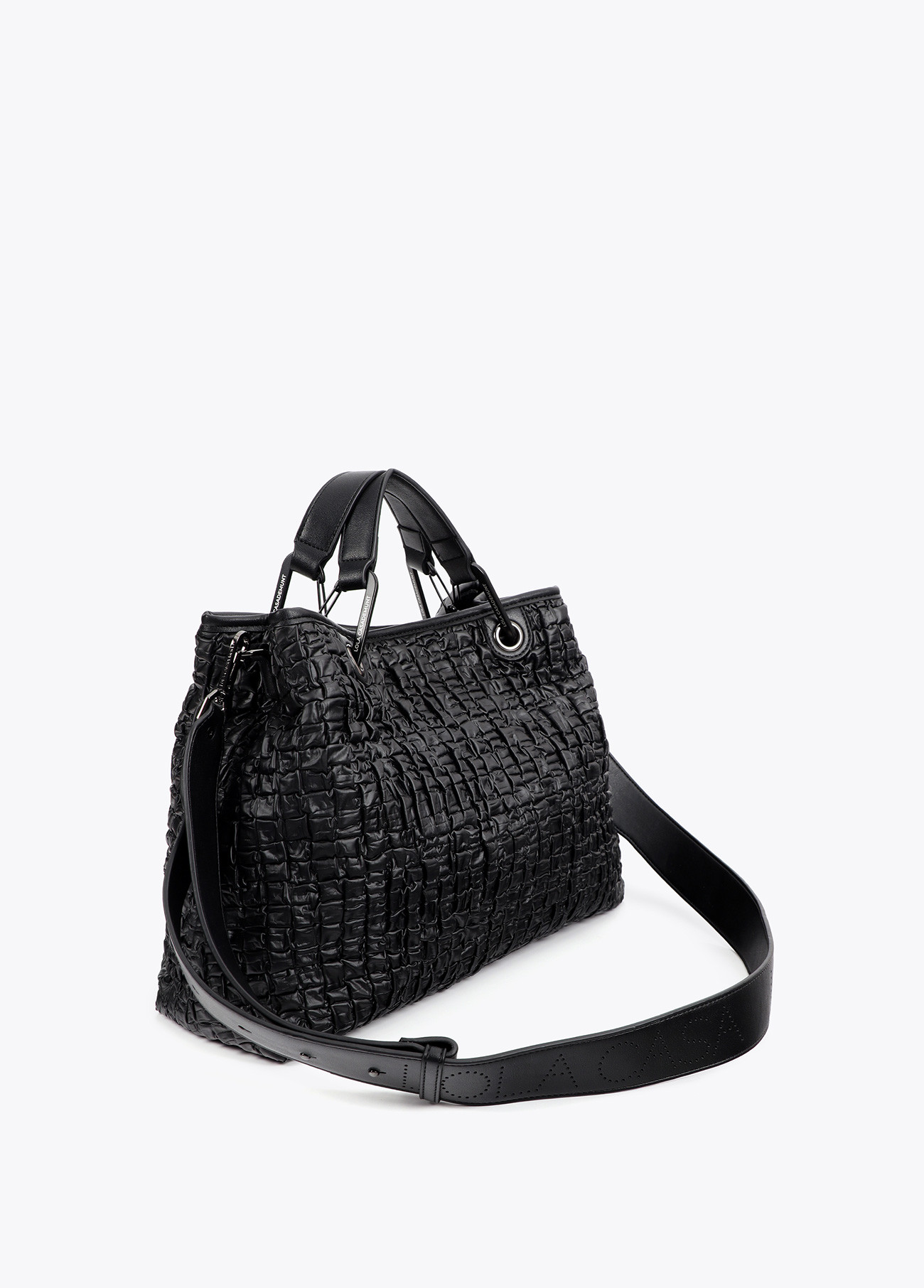 Bolso acolchado con efecto piel fruncida y acabados de alta calidad. Incluye dos asas de mano y correa ajustable para el hombro. Logo distintivo en el frontal. Interior espacioso con cierre de cremallera para mayor seguridad.