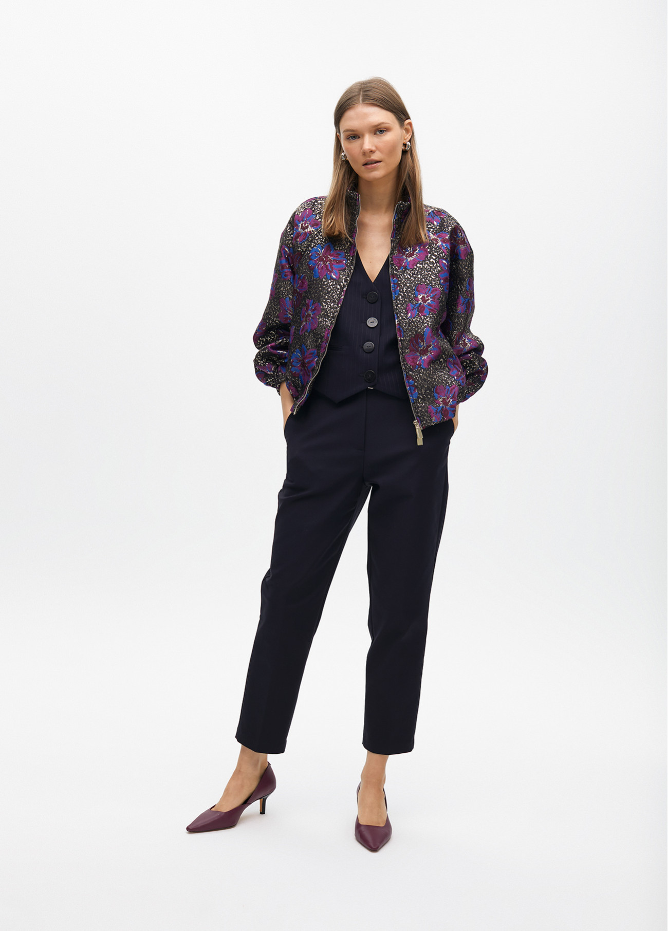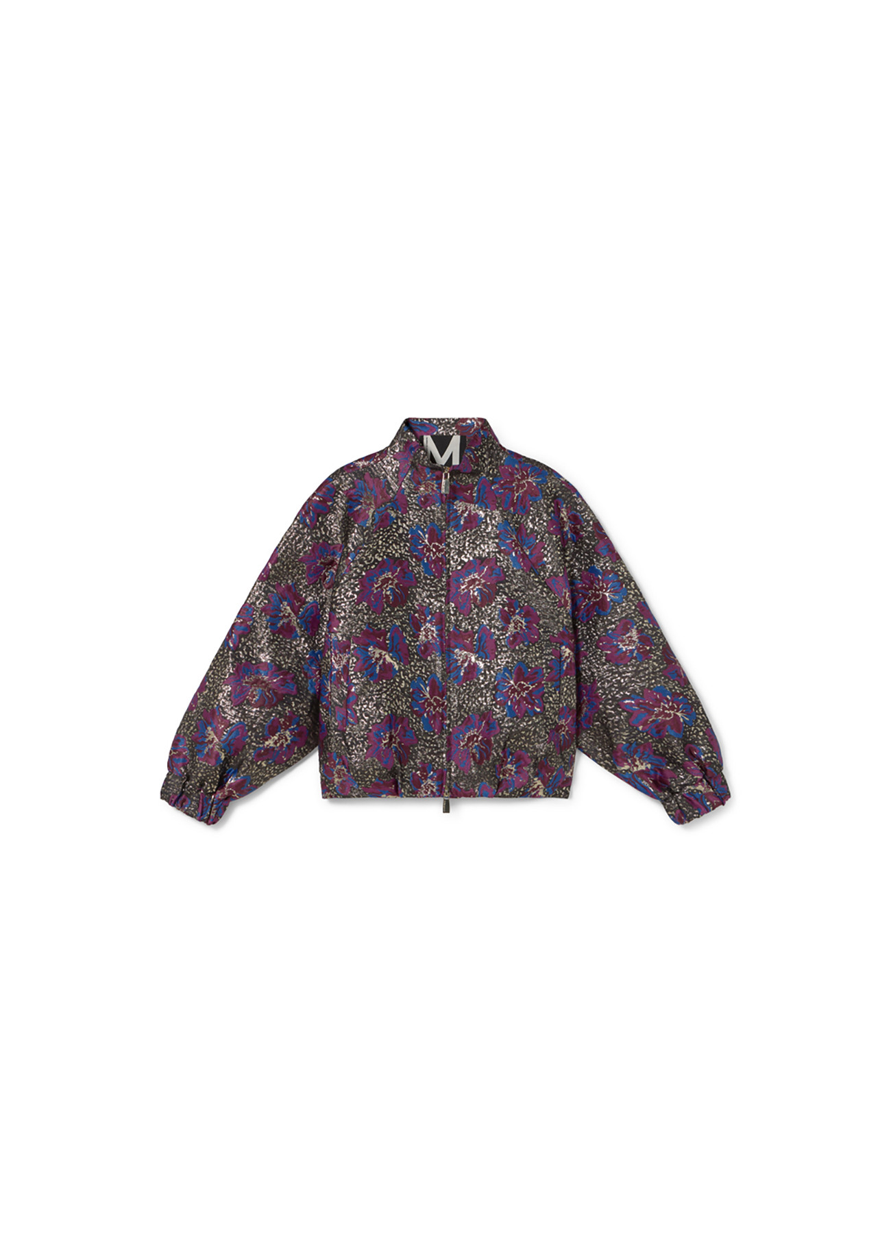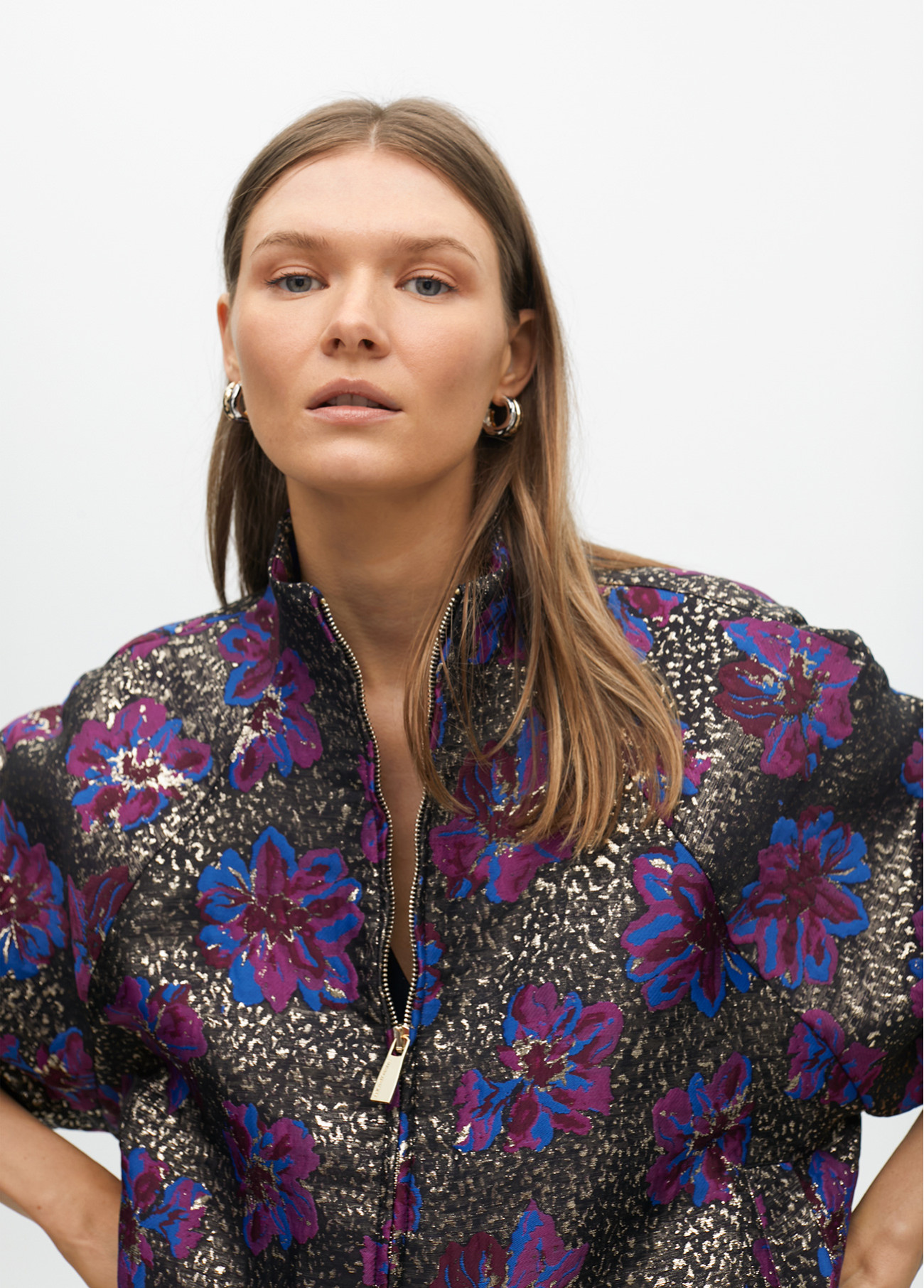 Bomber en tejido jaquard con estampado floral metalizado. Cierre de cremallera y cuello elevado. Mangas largas con puños elásticos, ideal para un toque chic y moderno.