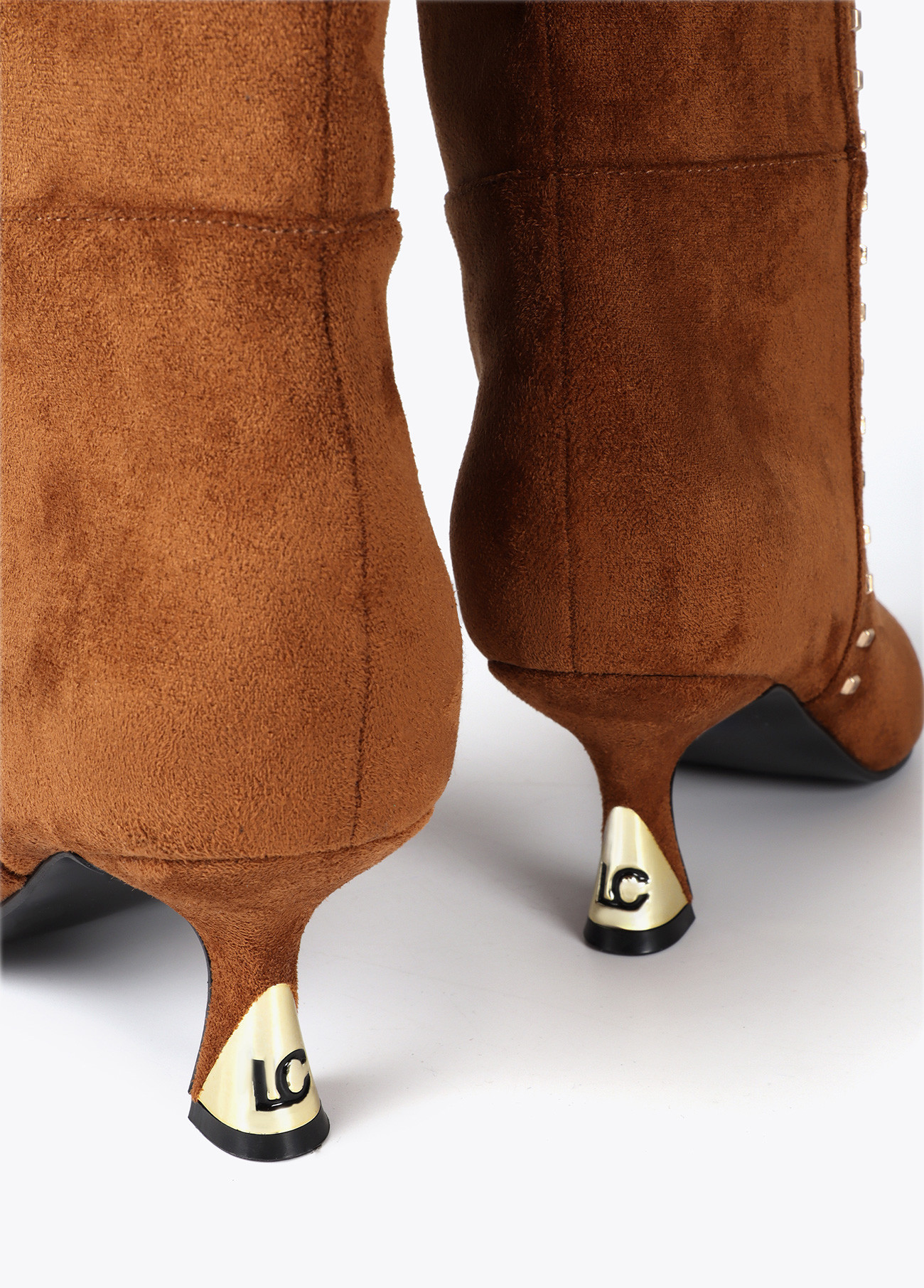 Bota alta en elegante material con tacón personalizado y detalle de tachas cuadradas. Incluye cierre de cremallera lateral. Diseño sofisticado que aporta un toque moderno a tu look.