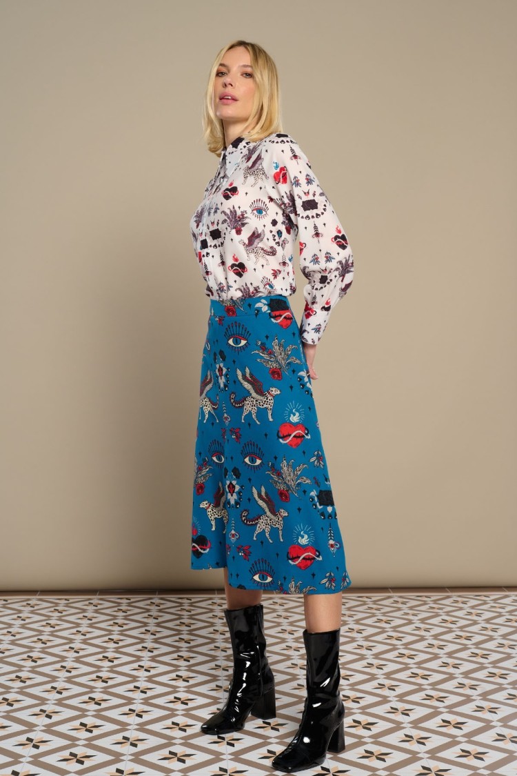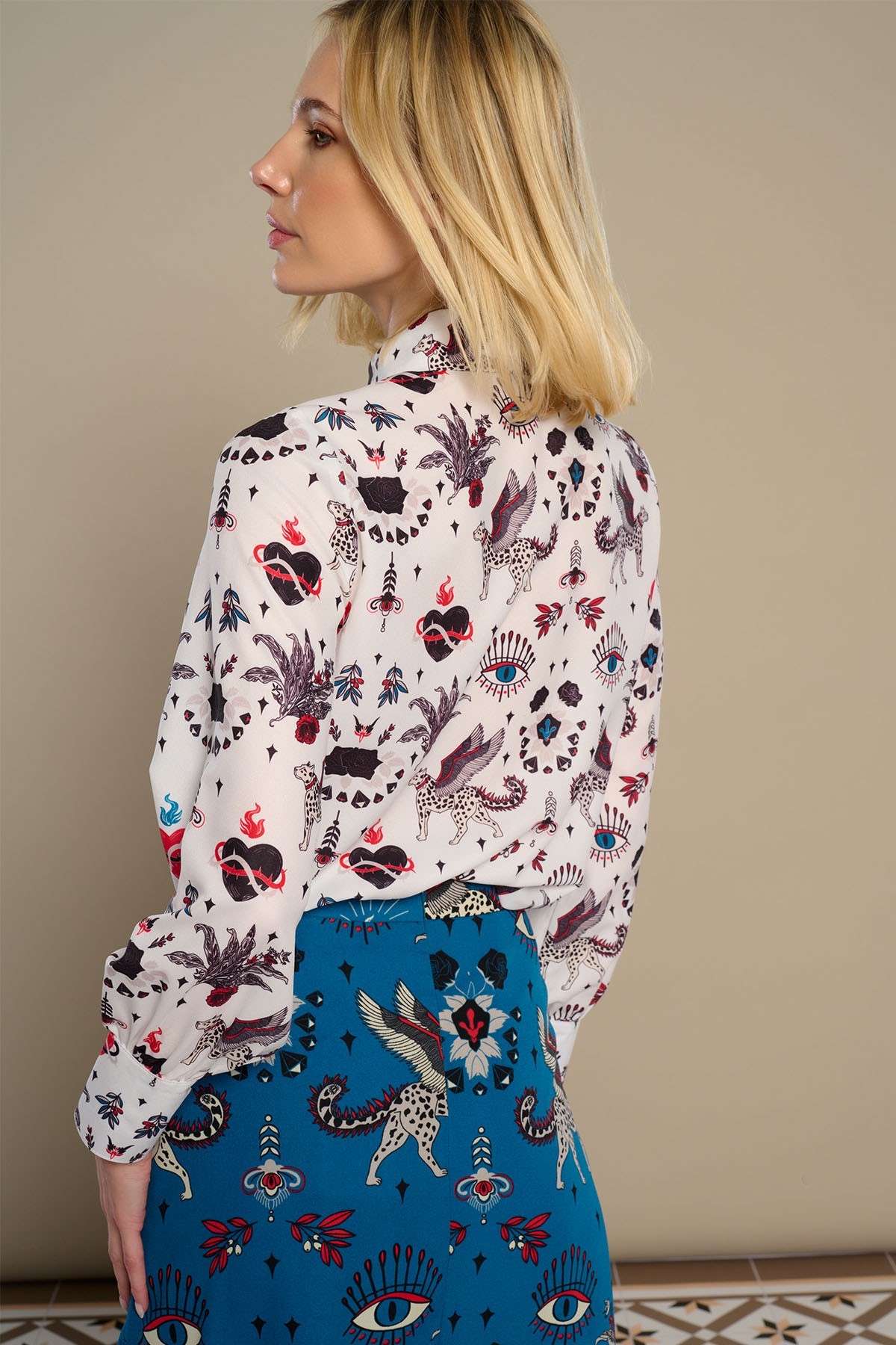 Camisa de cuello solapa 70s y manga larga. Ajustado en puños con botones. Cierre con botones frontales. Estampado místico de fatos alados.