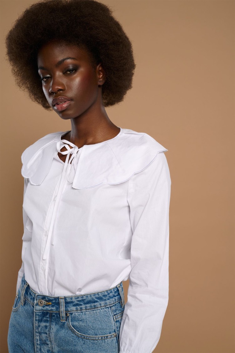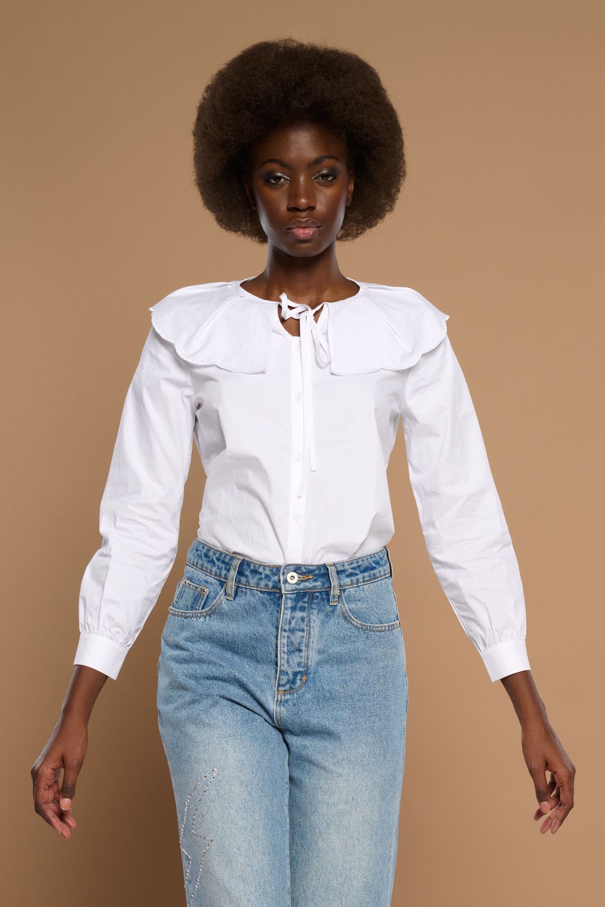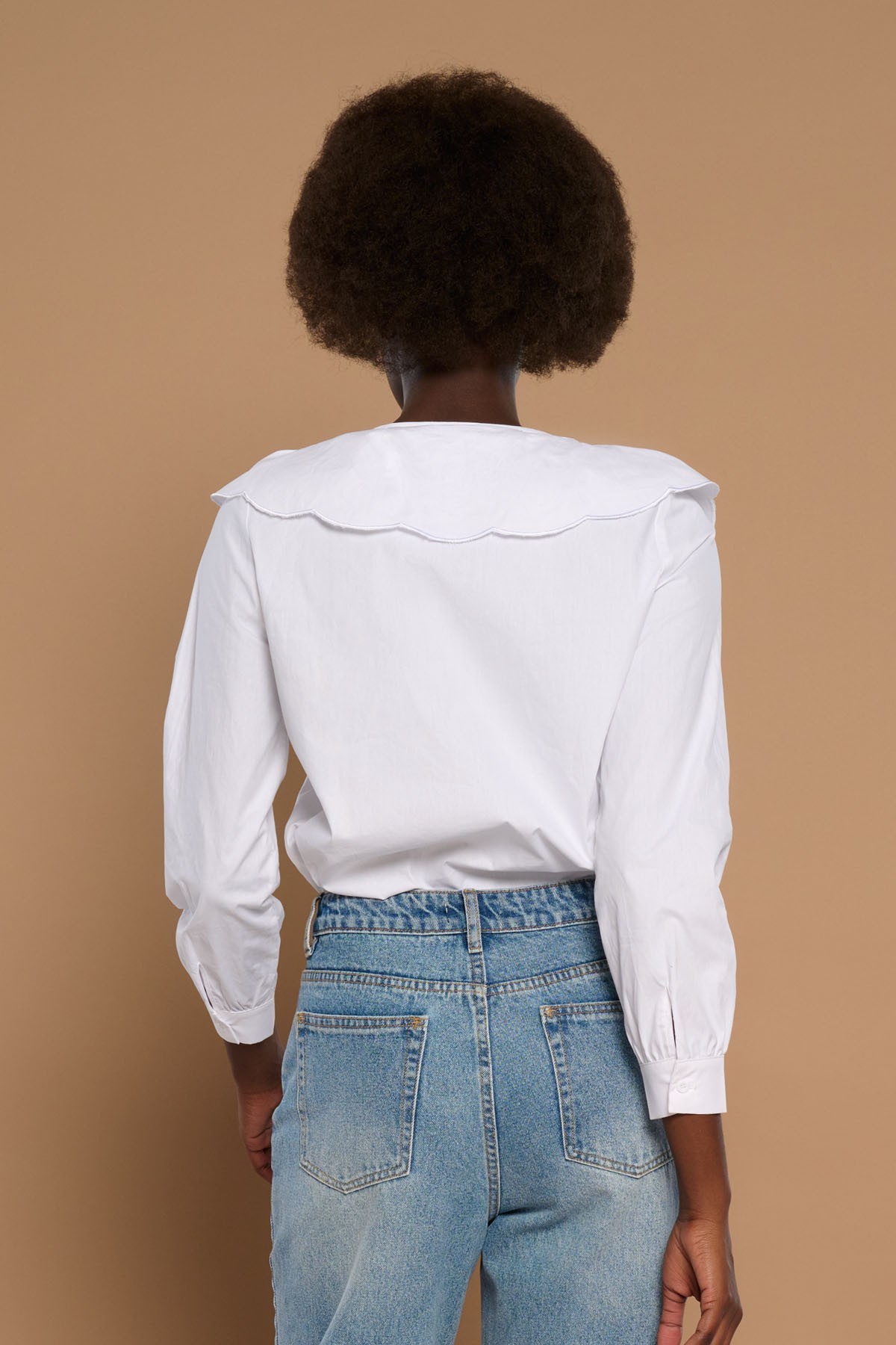 Blusa de cuello bobo. Manga larga acabada en puño. Cierre con botones frontales y lazada.