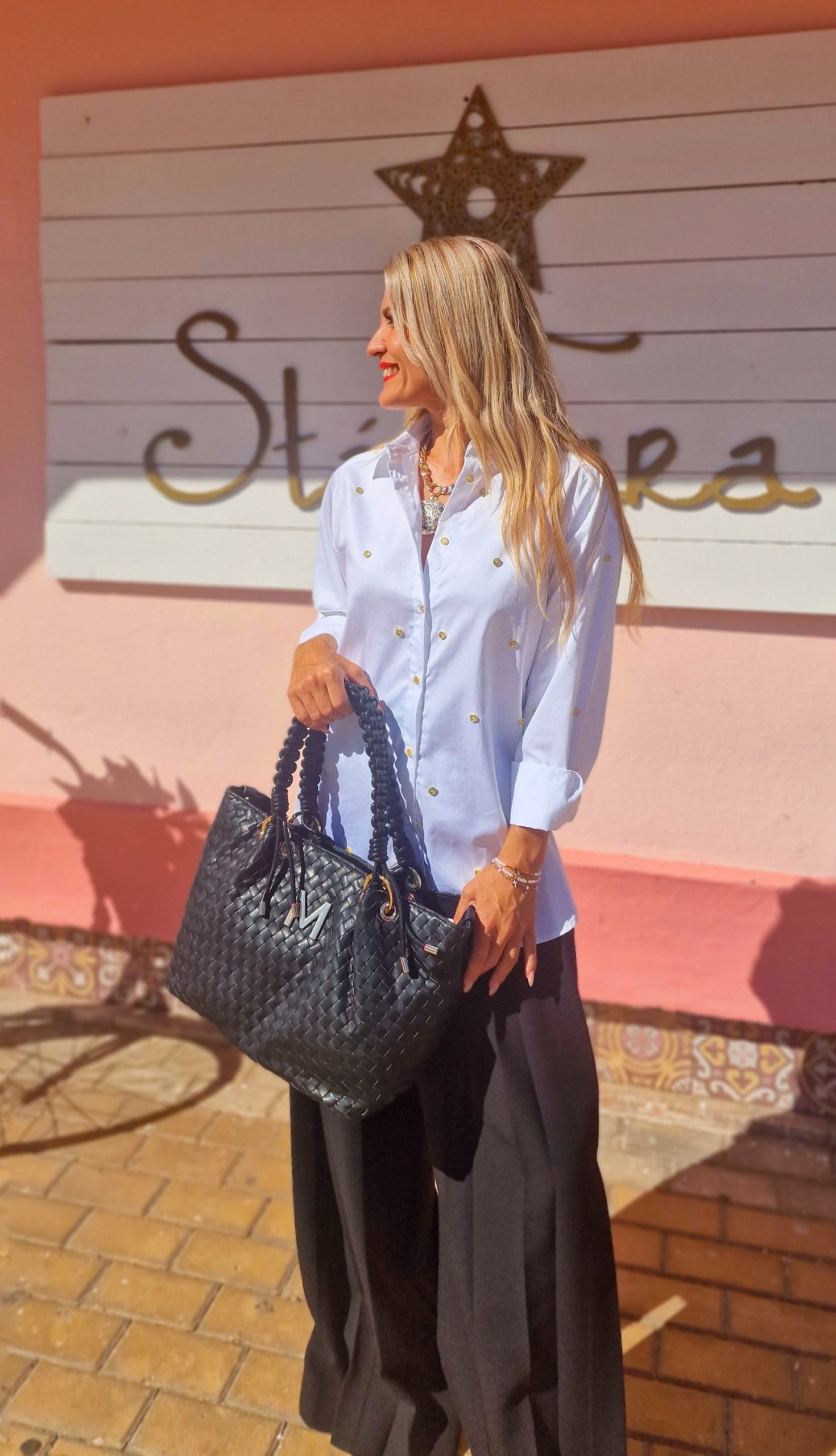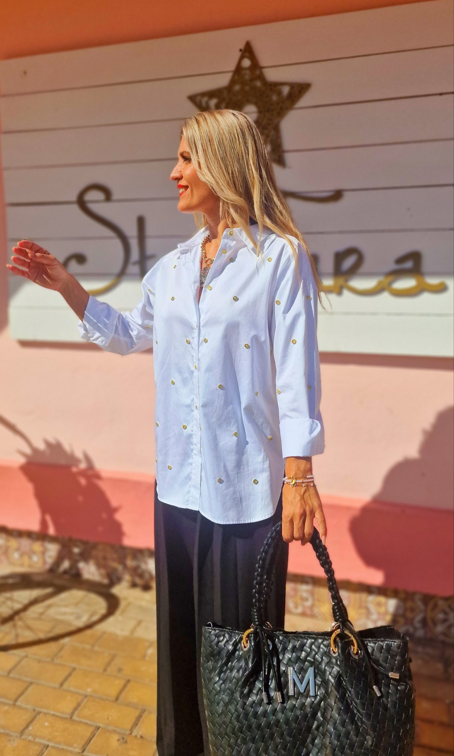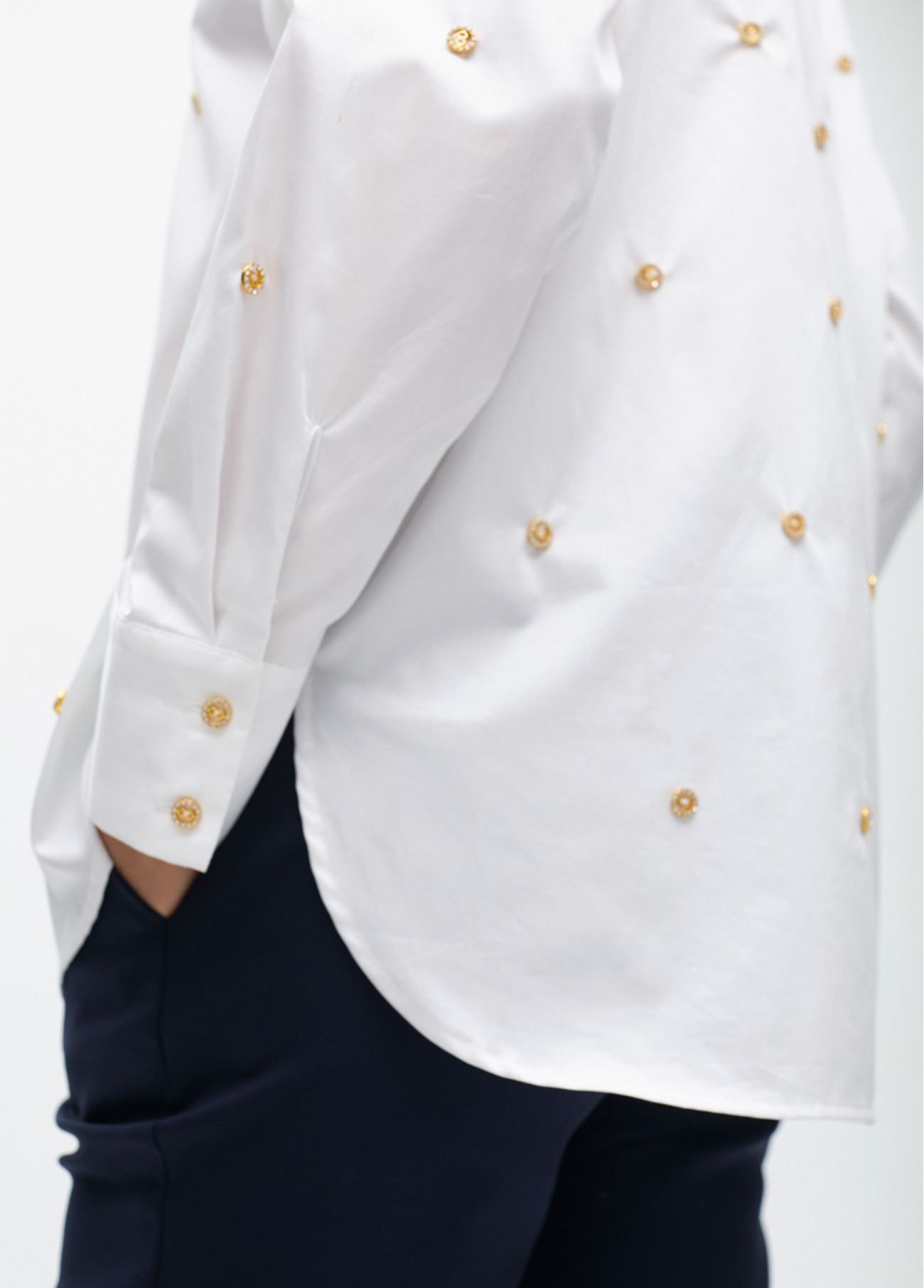 Camisa recta confeccionada en popelín suave, adornada con detalles de joya dorados. Cuello clásico y cierre de botones. Diseño elegante que combina sofisticación y estilo en cualquier ocasión.