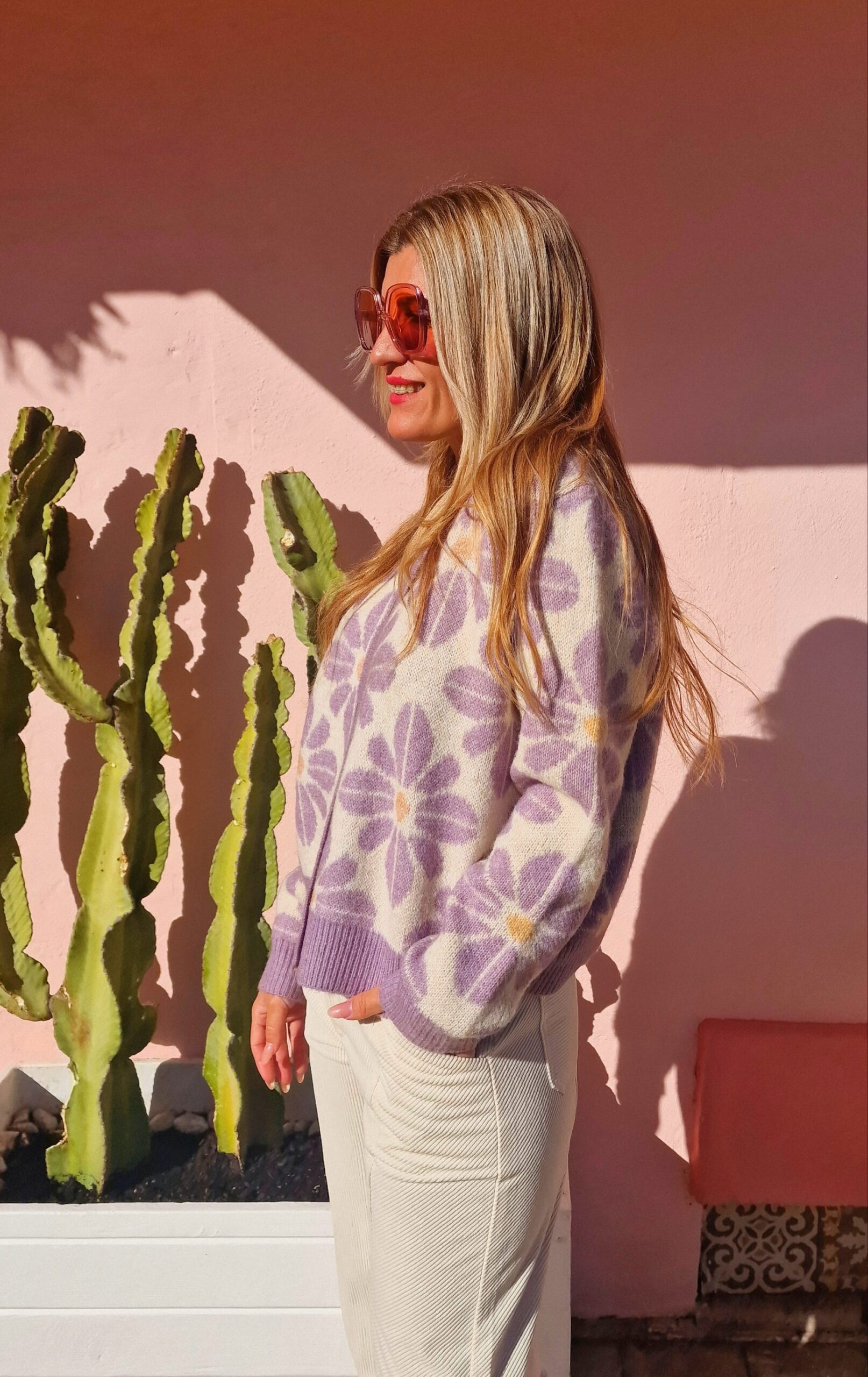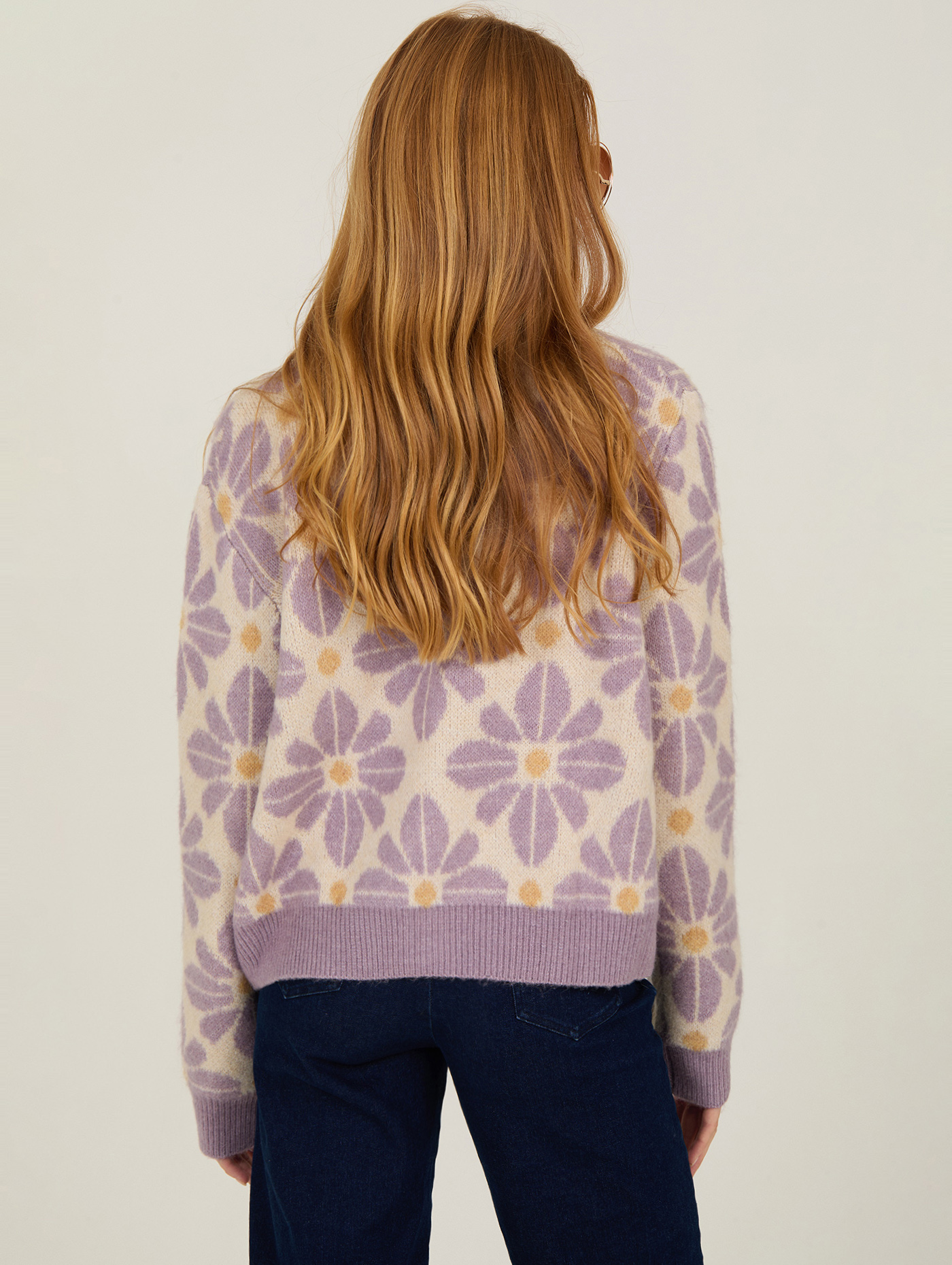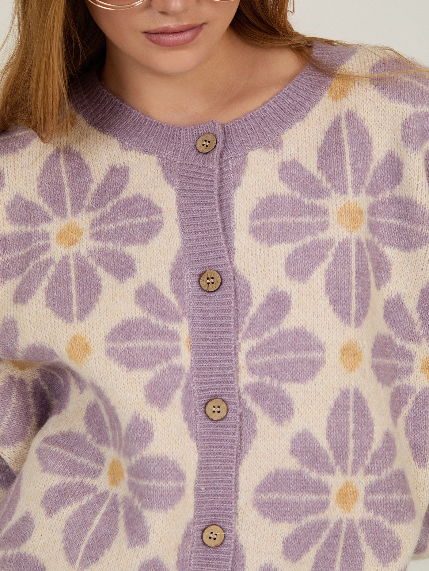 Cárdigan corto de mujer con manga larga, confeccionado en tejido jacquard floral de inspiración retro, ideal para looks femeninos y actuales. Elaborado con una cuidada mezcla de lana y poliéster reciclado, ofrece calidez, suavidad y sostenibilidad. Una prenda versátil y elegante, perfecta para completar outfits de entretiempo y aportar un toque vintage a tu armario.
