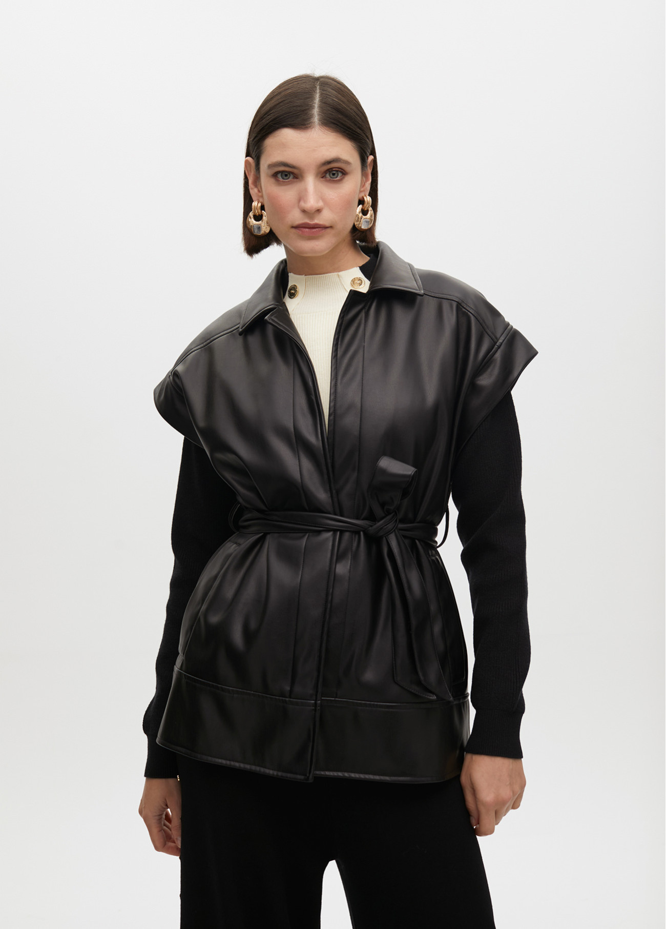 Chaleco de efecto cuero con elegante cinturón ajustable. Diseño sin mangas, cuello solapa y cierre frontal con botones ocultos. Versátil y moderno, ideal para crear looks con estilo. Costuras decorativas y acabado suave al tacto.
