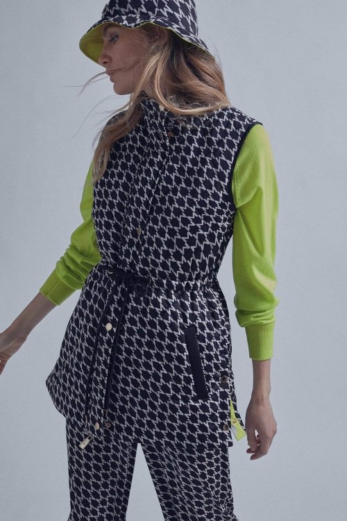 Chaleco bicolor, logotipado en M. Abrochado con cremallera y snaps dorados. Bolsillos laterales y cintura ajustable.