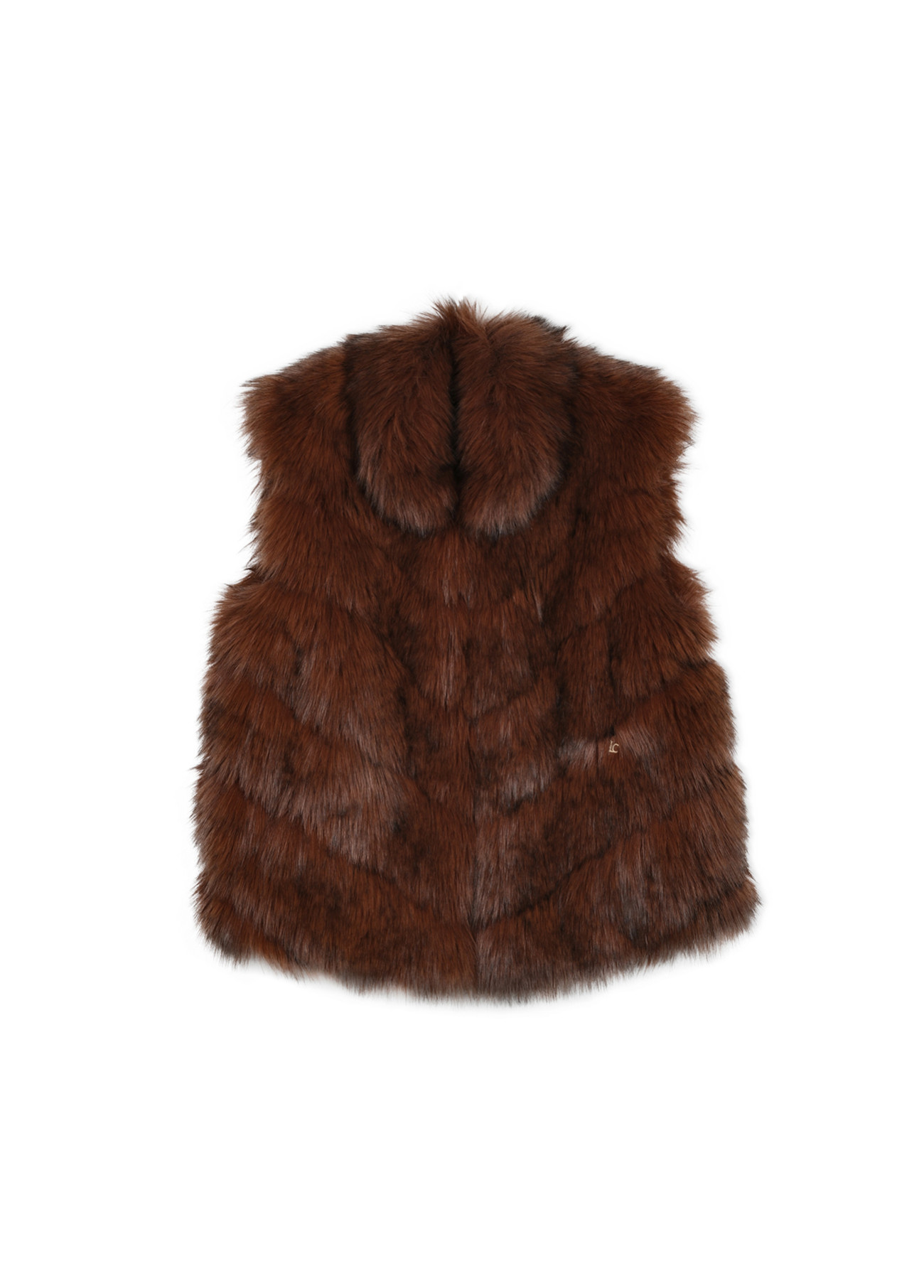Chaleco de pelo suave con interior estampado. Color marrón cálido, sin cierre, ideal para capas. Diseño cómodo y elegante, perfecto para realzar cualquier conjunto de temporada.