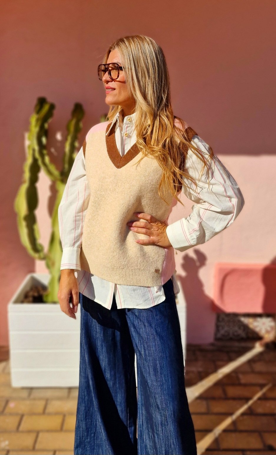 Chaleco de punto de lana, beige, espalda rosa y filo en marron.