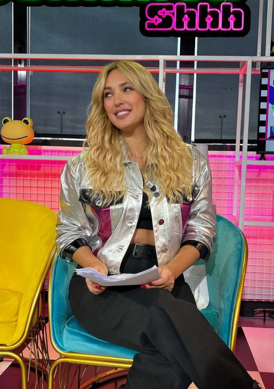 Chaqueta crop efecto metalizado. Cuello solapa y cierre frontal con botones. Bolsillos de plastón delanteros. Forro interior. La modelo mide 1,81 m y lleva la talla S.