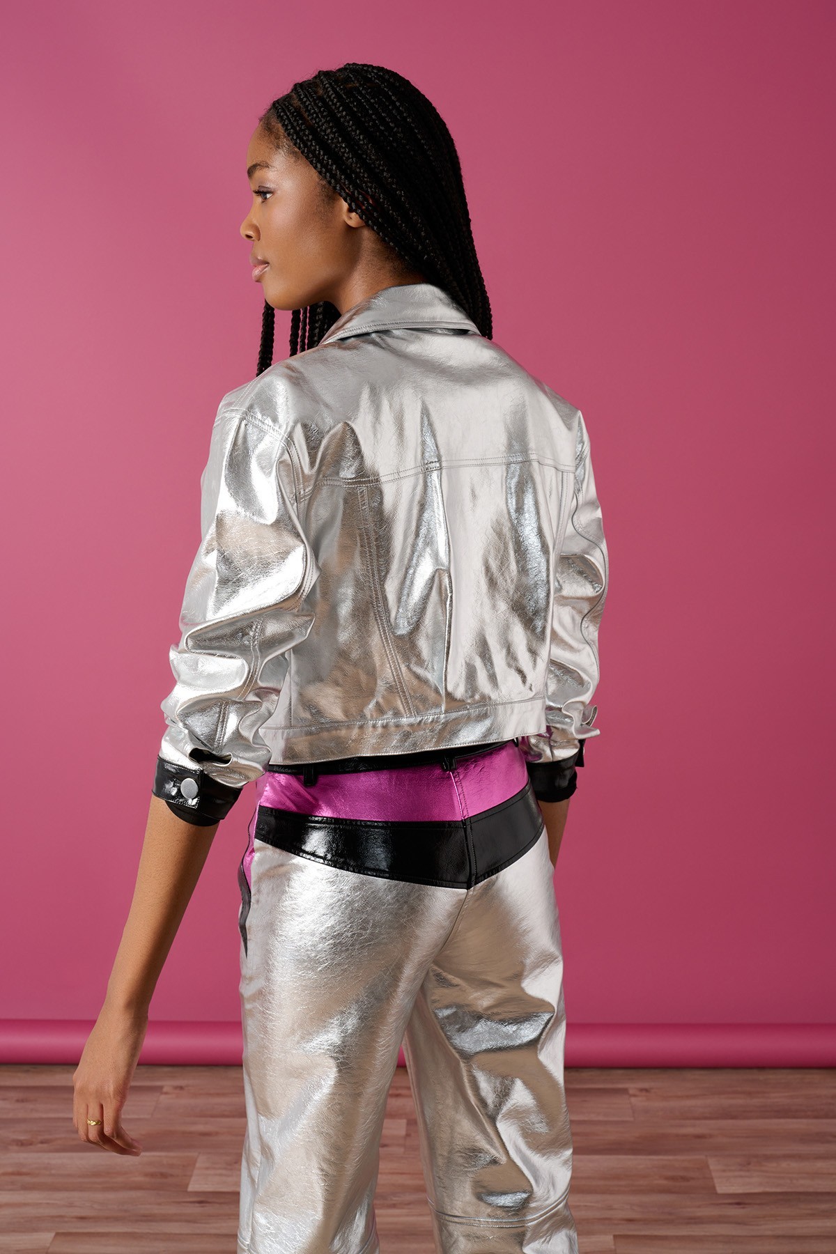Chaqueta crop efecto metalizado. Cuello solapa y cierre frontal con botones. Bolsillos de plastón delanteros. Forro interior.