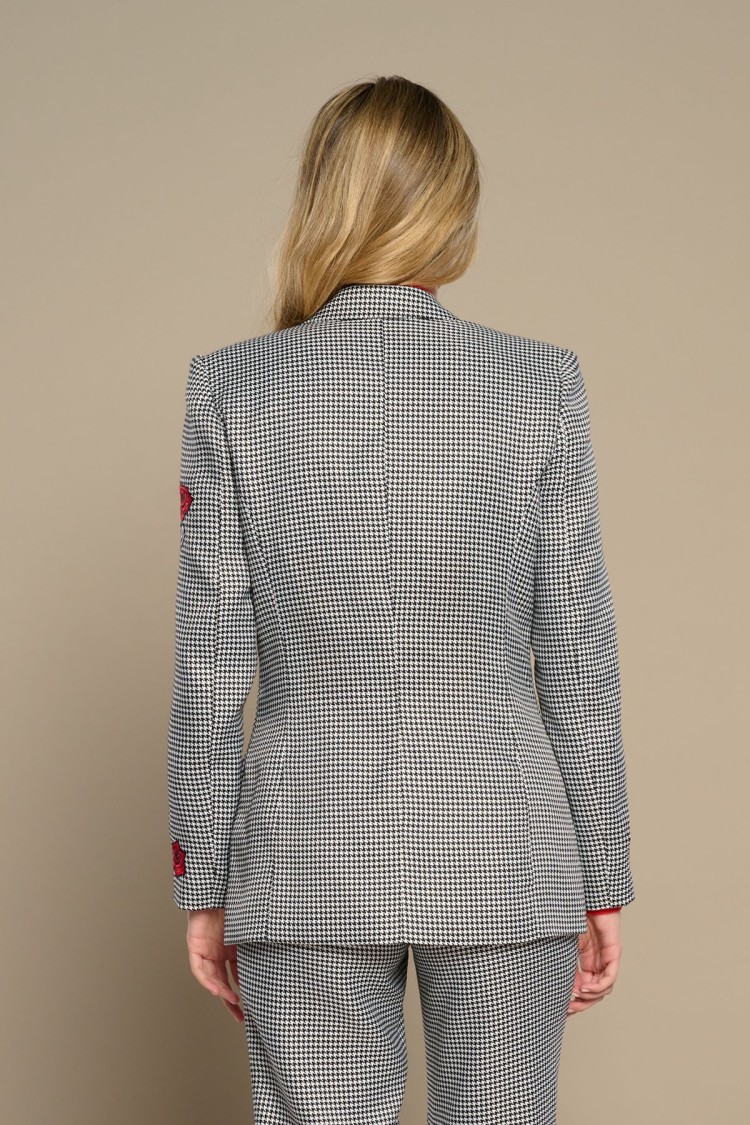 Chaqueta blazer de estampado pata de gallo y bordados de rosas. Bolsillos laterales. Cierre con botones frontales.