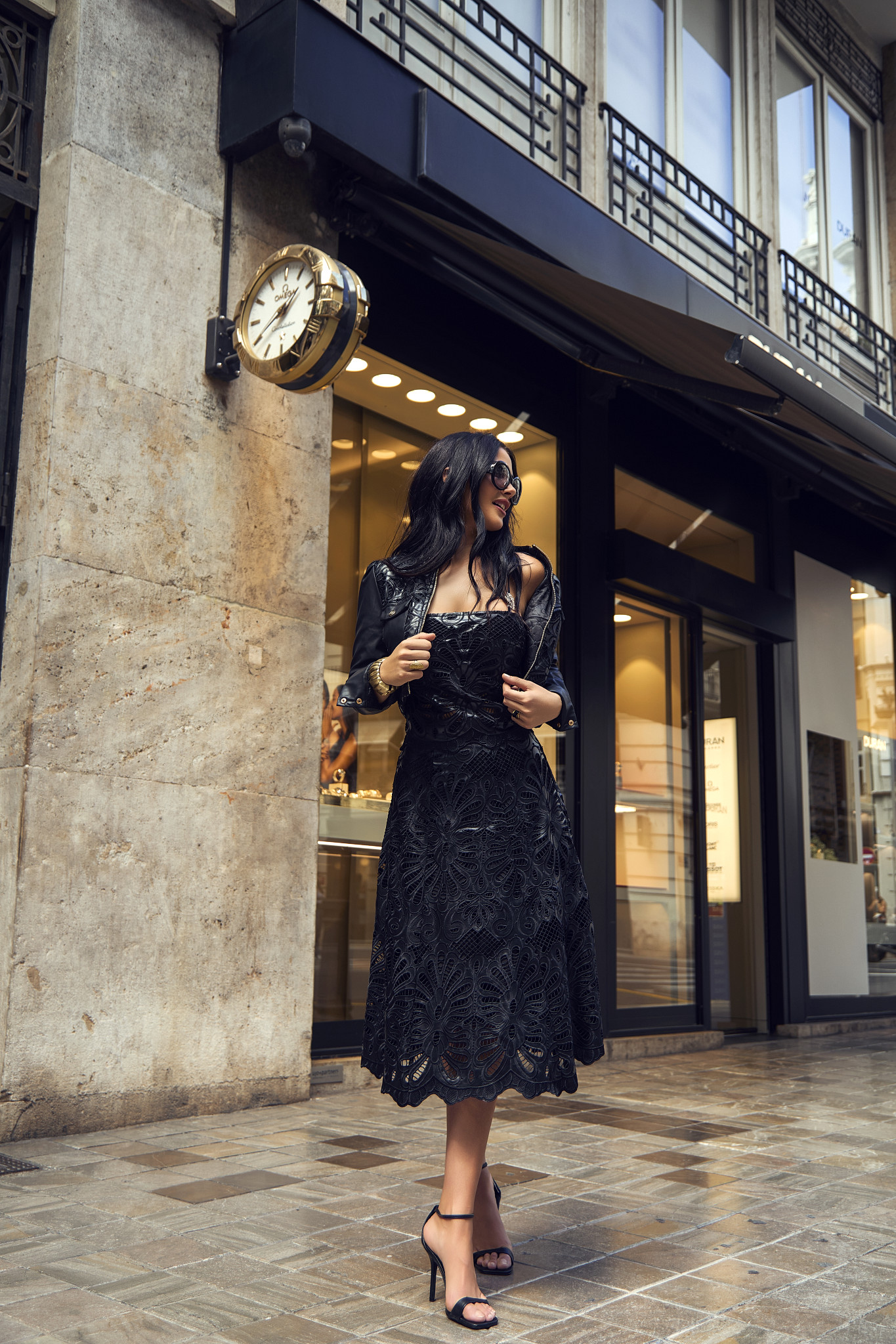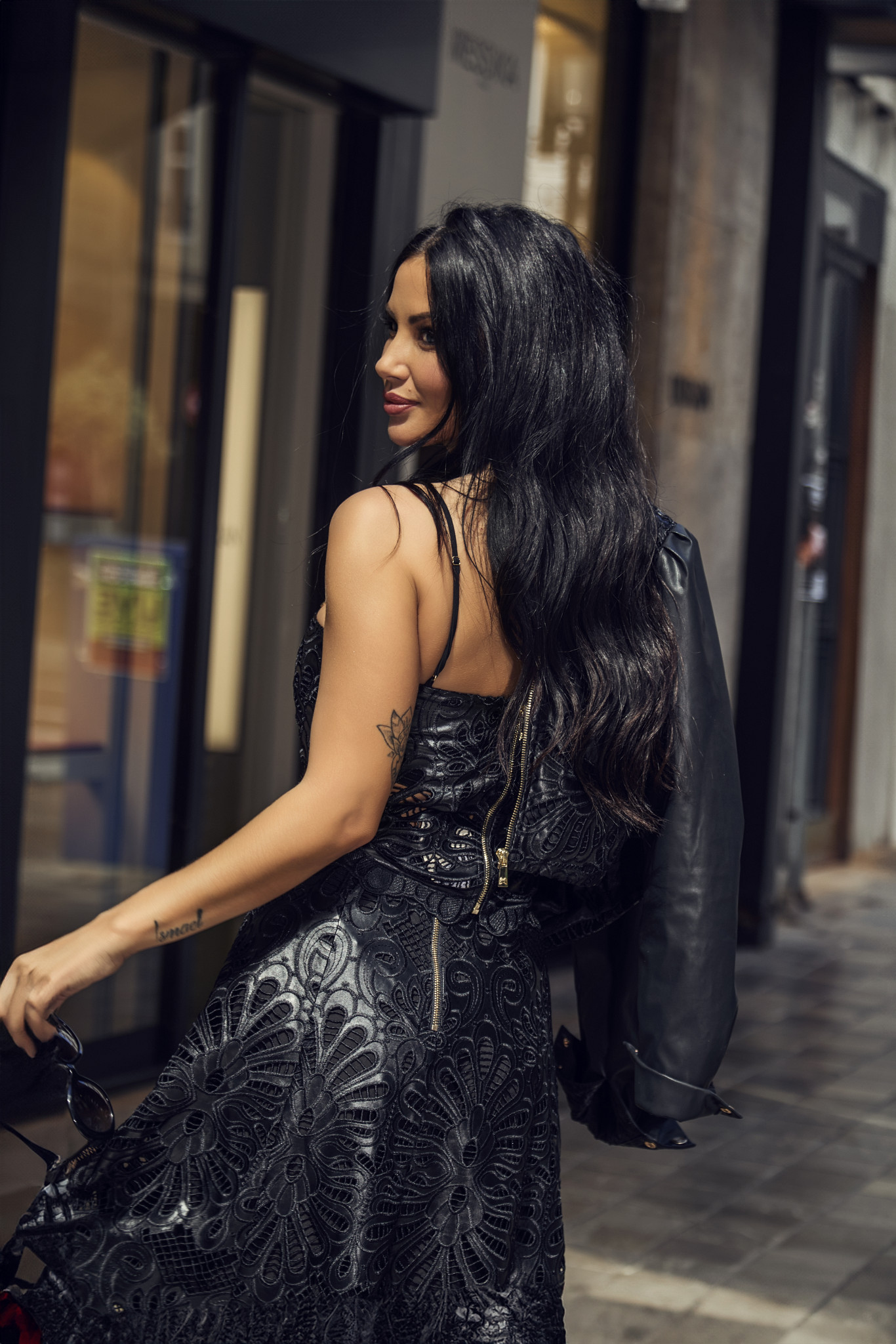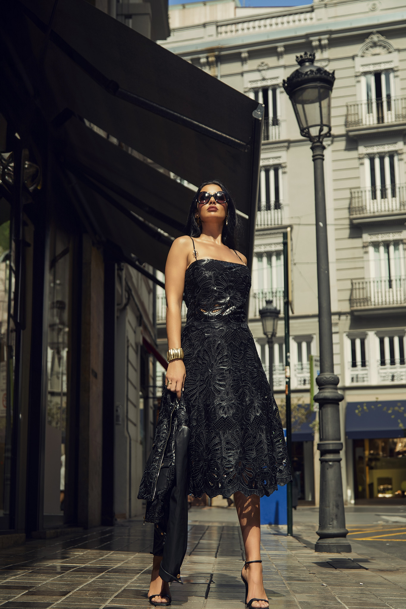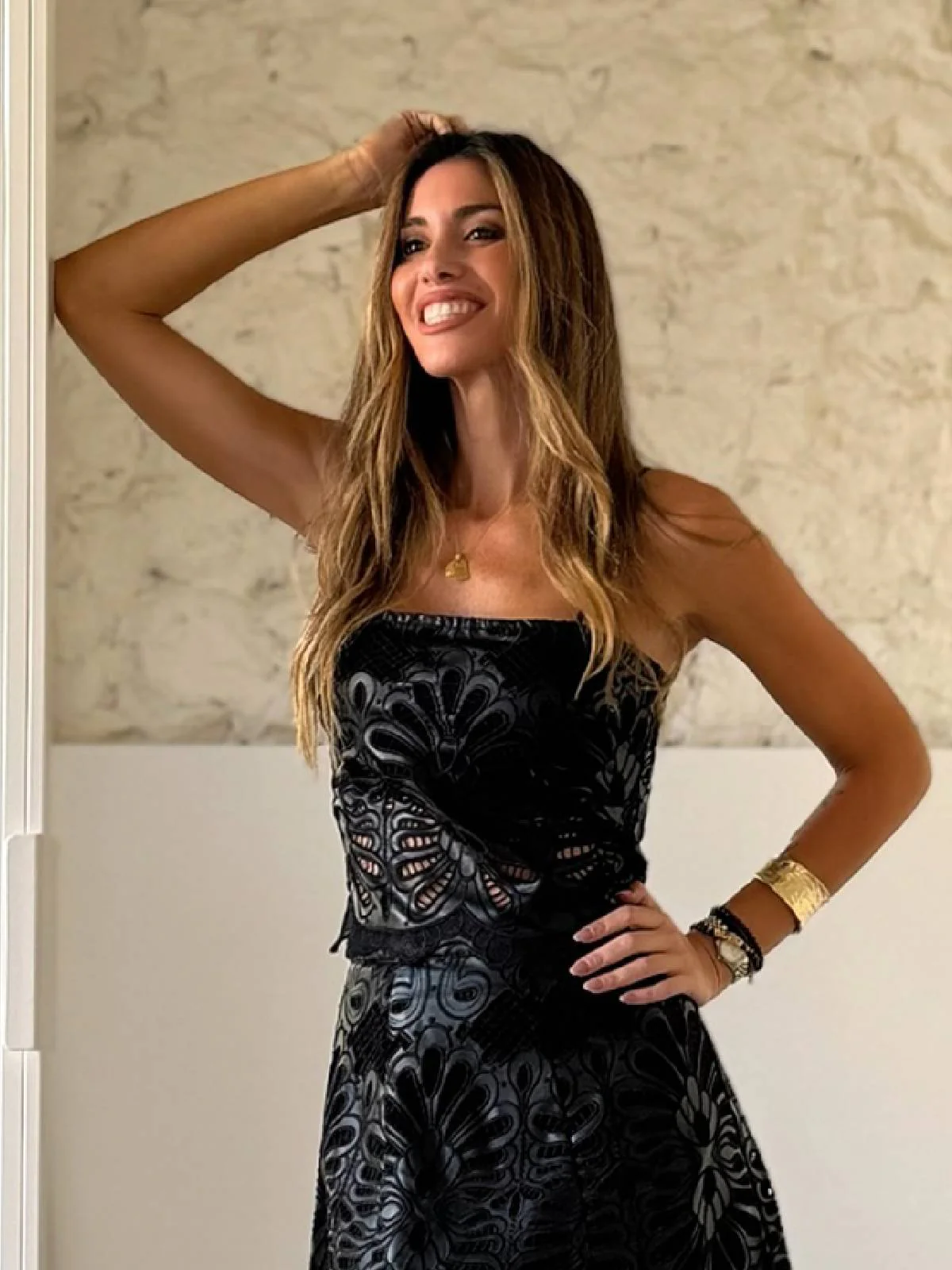 Top de ecopiel negro con detalle de encaje semitransparente. Tirantes regulables con detalle de ala dorada. Escote recto. Cremallera en la parte de la espalda.