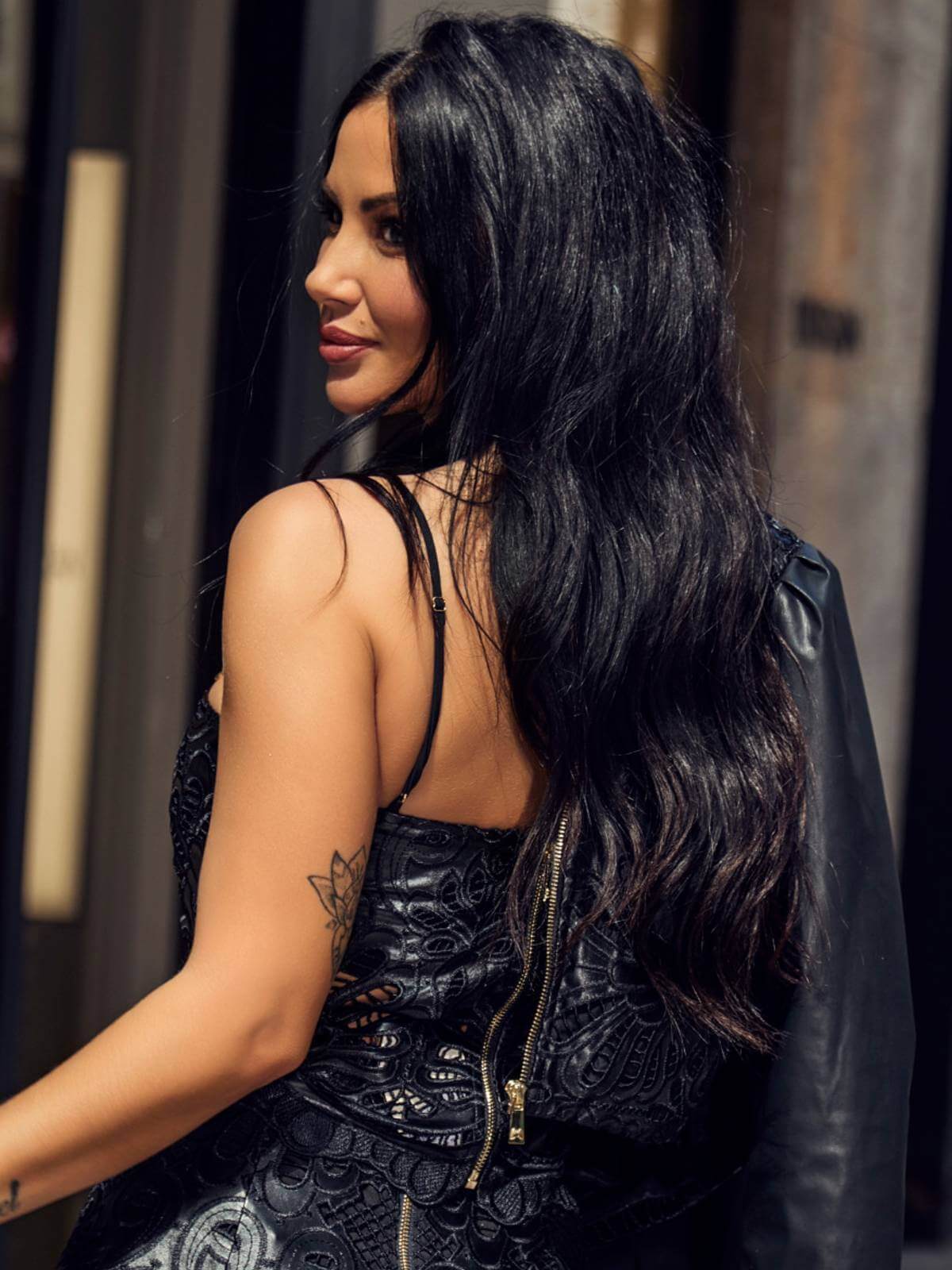 Top de ecopiel negro con detalle de encaje semitransparente. Tirantes regulables con detalle de ala dorada. Escote recto. Cremallera en la parte de la espalda. Composición: 55% poliéster, 45% poliuretano.
