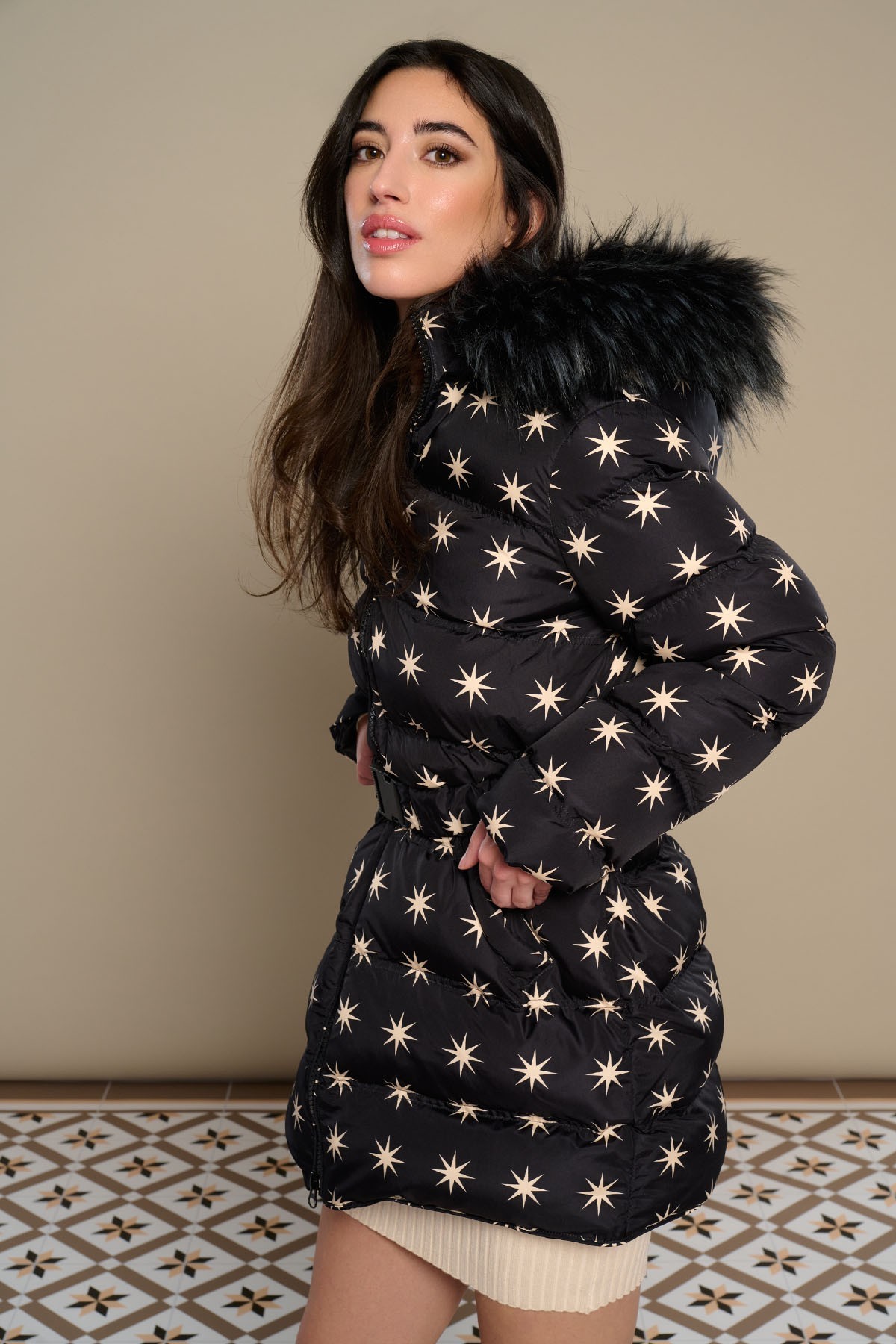 Abrigo acolchado con estampado de estrellas blancas. Cierre con cremallera frontal. Chaqueta tiene una capucha con ribete de piel sintética y un cinturón que realza la cintura (incluido). Forro interior.