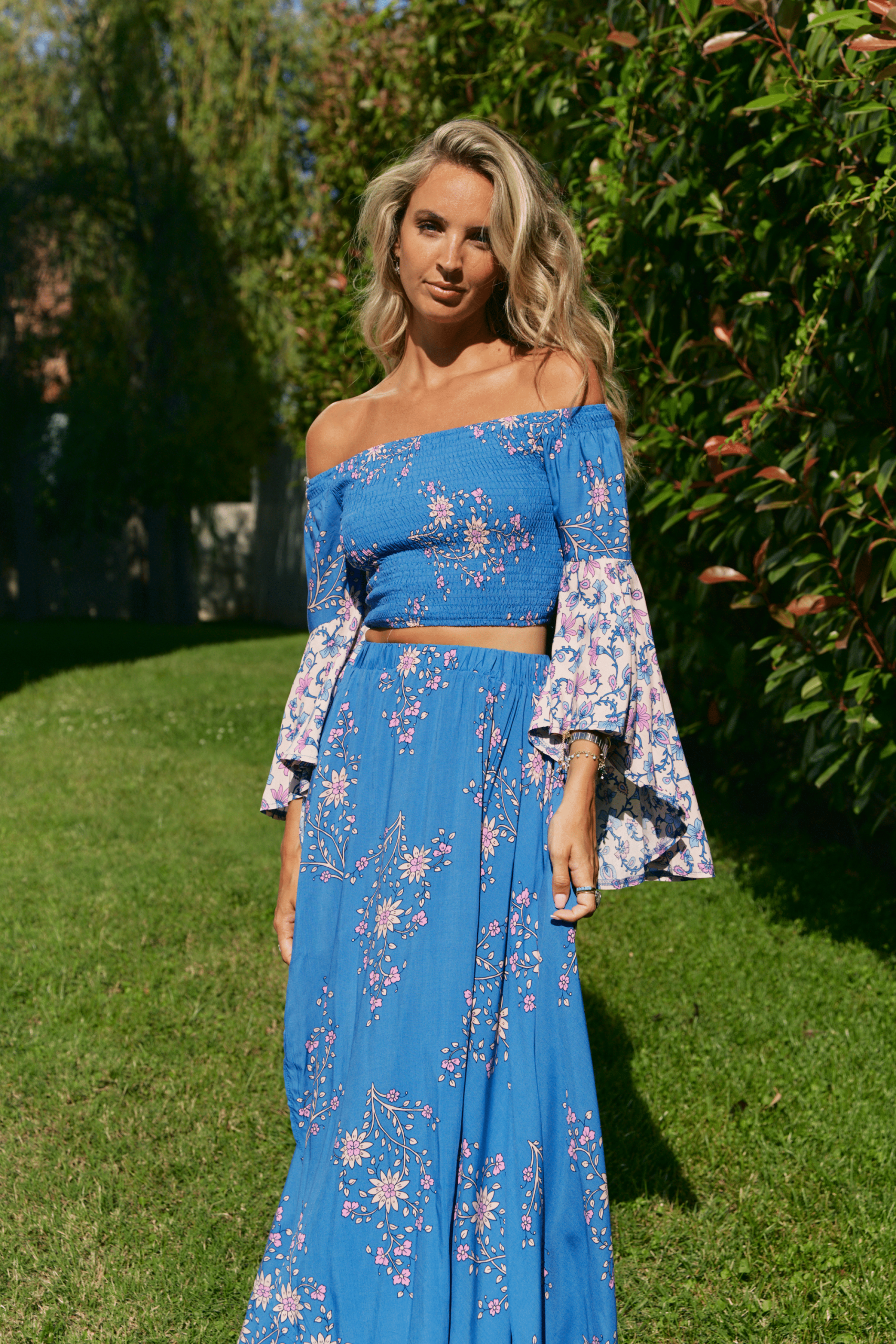 100% RAYÓN conjunto de falda y top con cintura y cuerpo engomado, en tonos azules estampados
