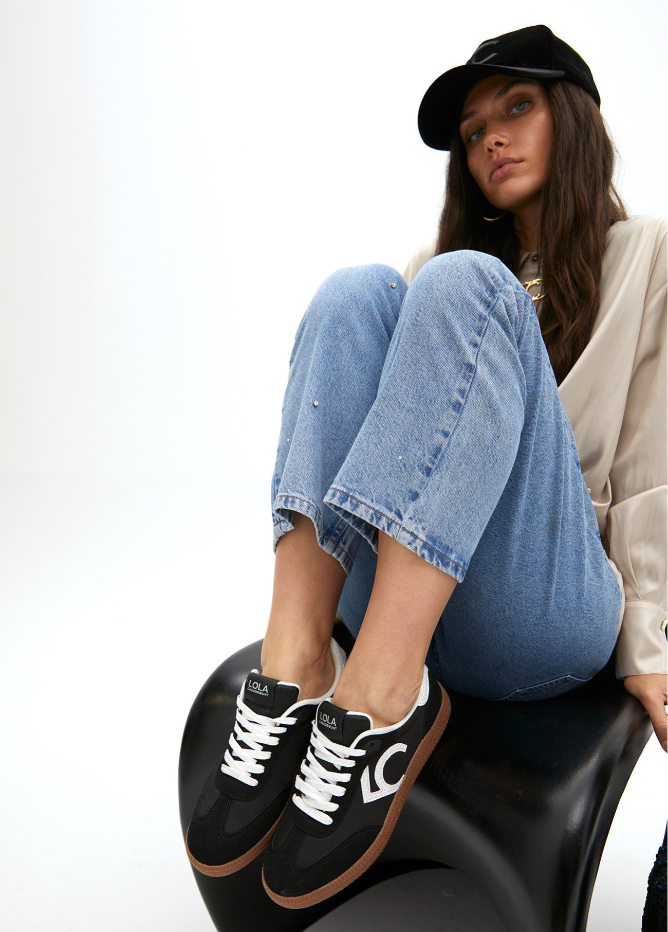 Zapatillas deportivas en tejido tipo nylon con detalles de strass brillantes. Diseño ligero y cómodo con suela de goma resistente y cierre de cordones. Logo en el lateral.