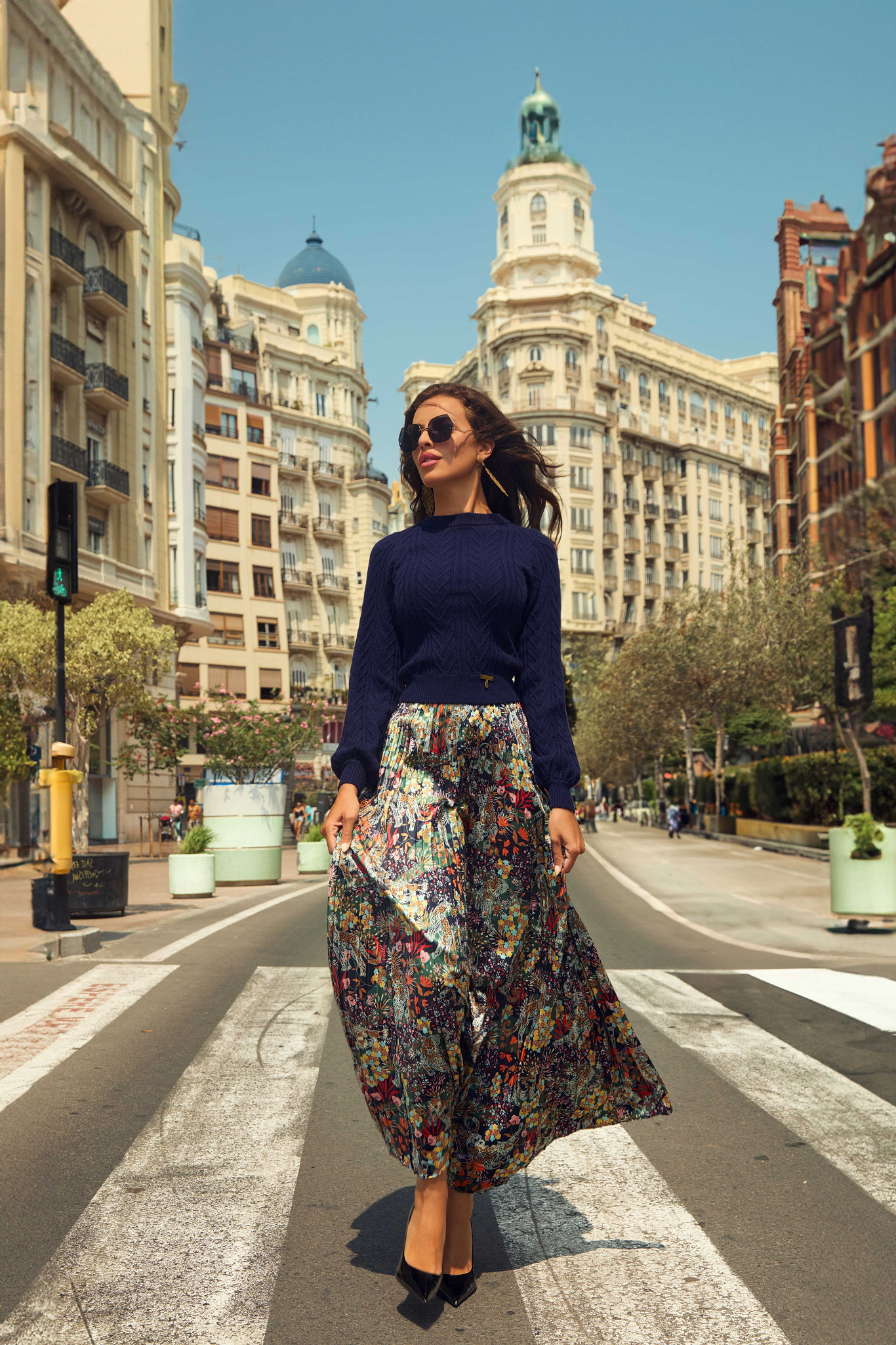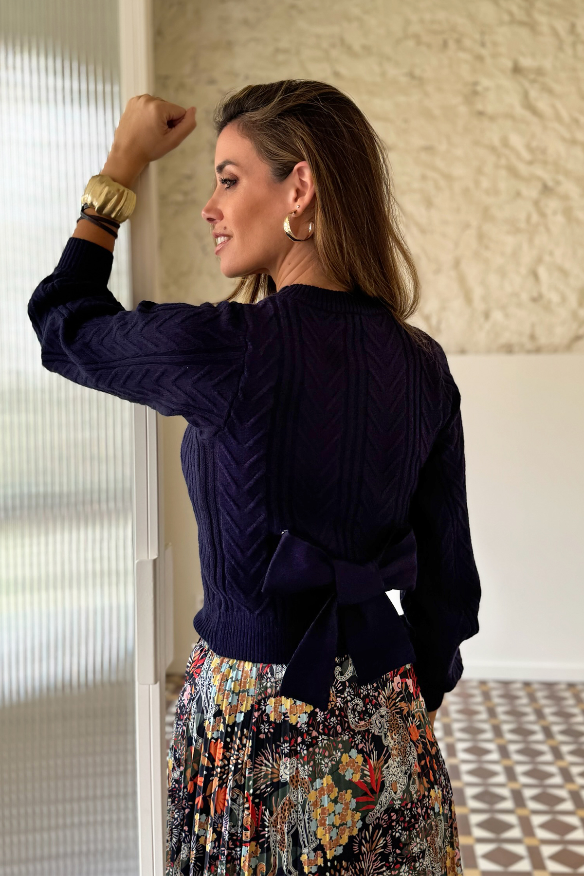 Jersey de punto en color azul, de manga larga y cuello redondo. En la parte trasera lleva un lazo, con clips para poder quitar y poner.