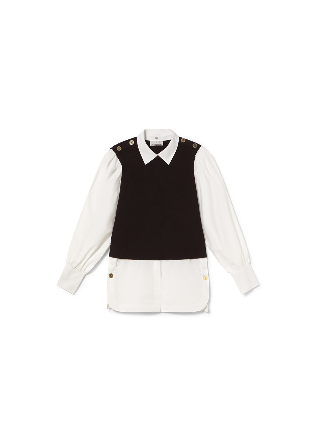 Jersey de diseño elegante con manga larga y cuello en tejido de popelín. Combinación de colores en contraste y botones dorados decorativos en los hombros. Ideal para un look sofisticado.