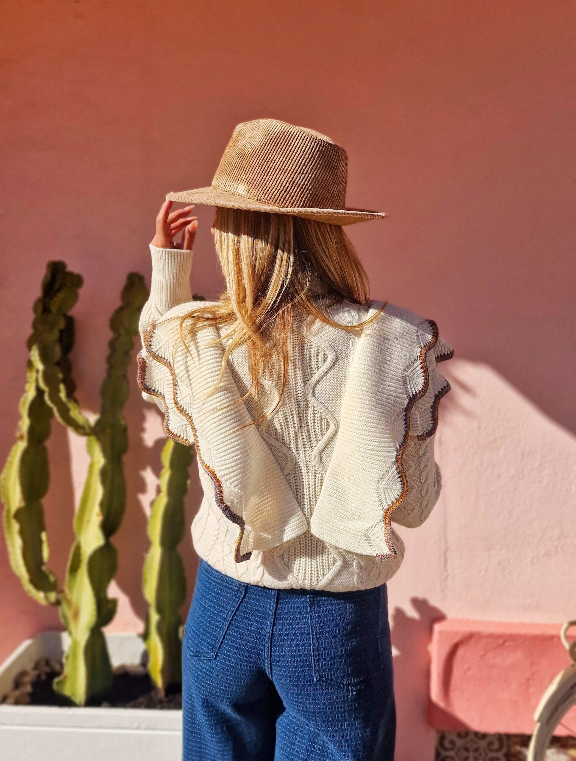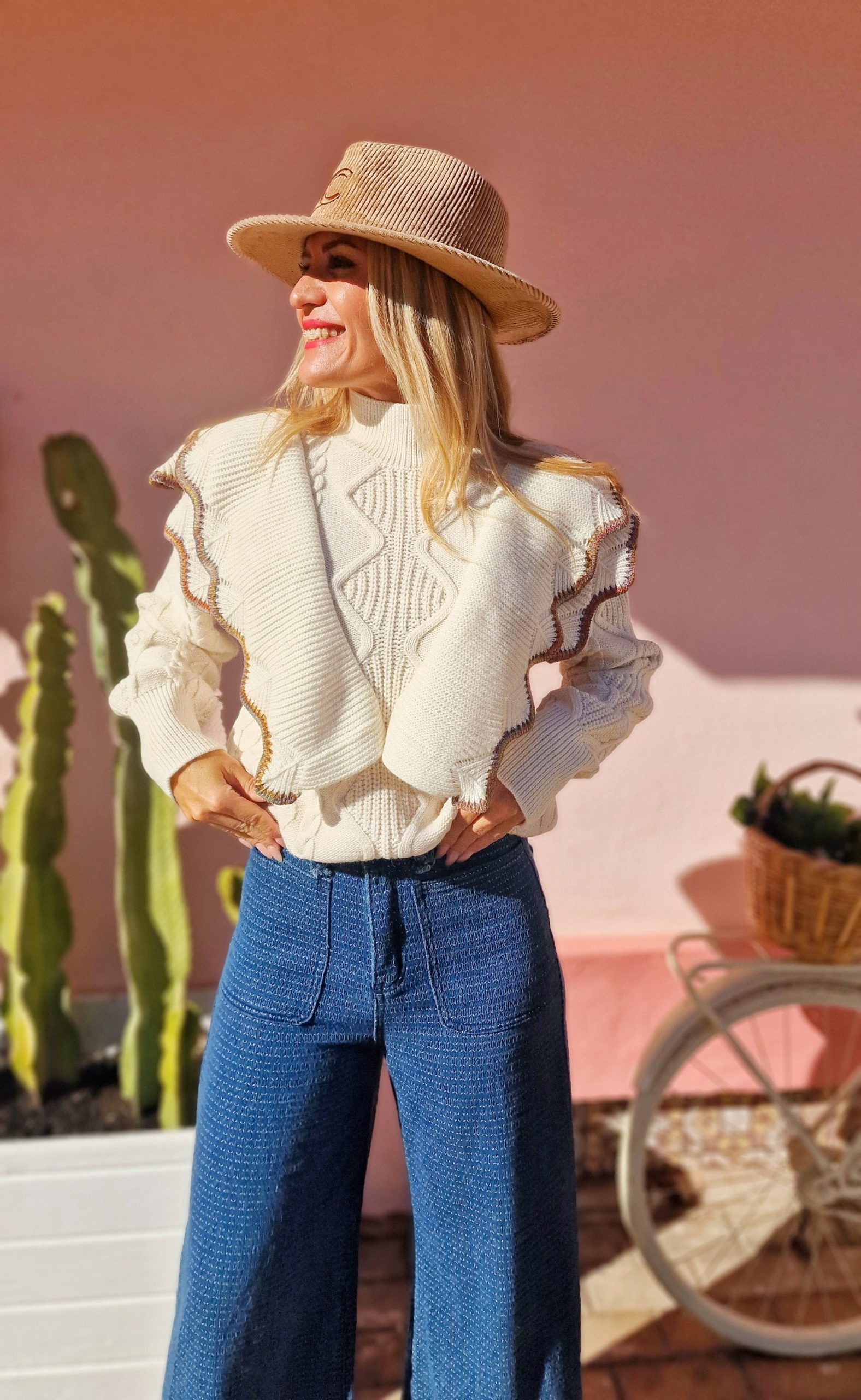 Jersey color beige con volantes, con lana, alpaca y viscosa, acabado en tonos marrones.