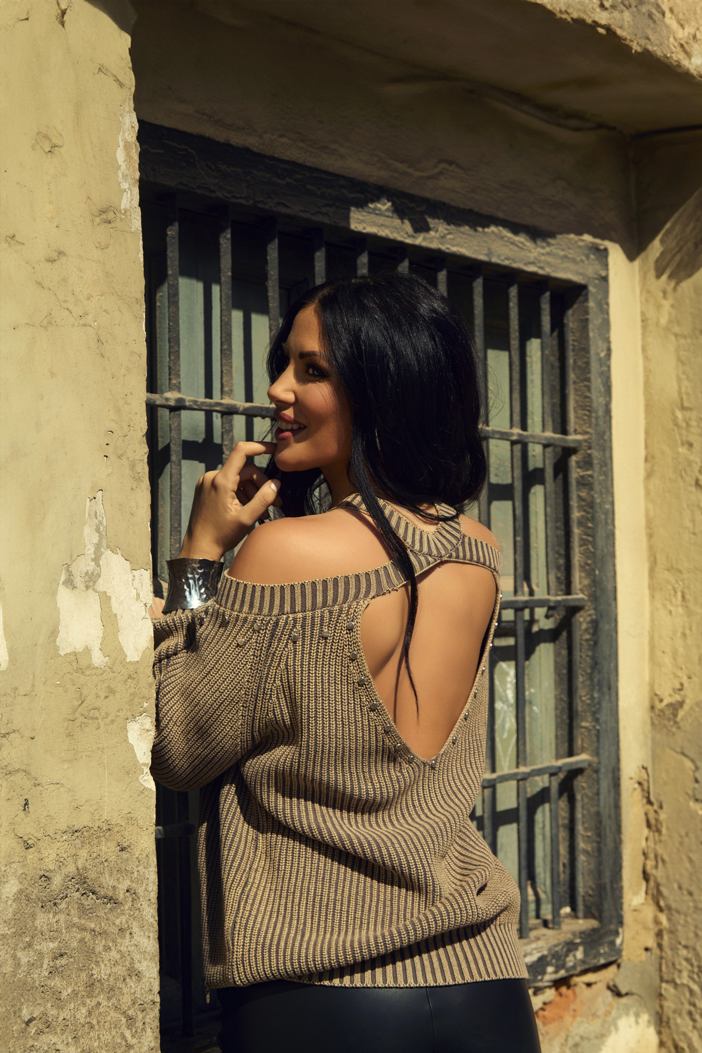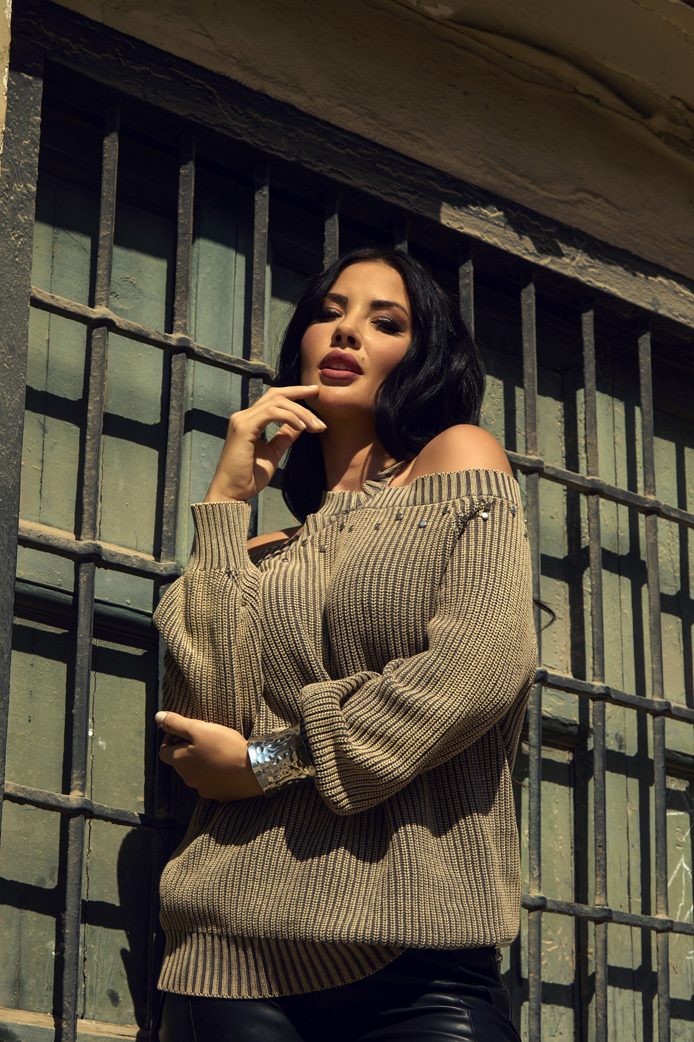 Jersey de punto oversize cut out taupe atado al cuello, hombros y espalda descubierto con detalles de tachuelas en plata.
