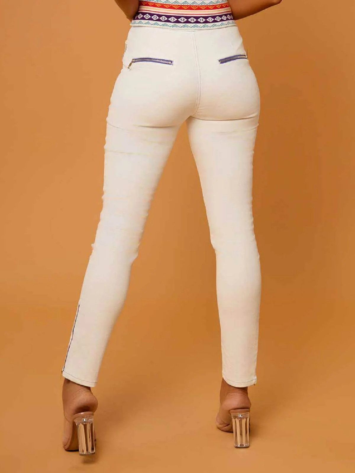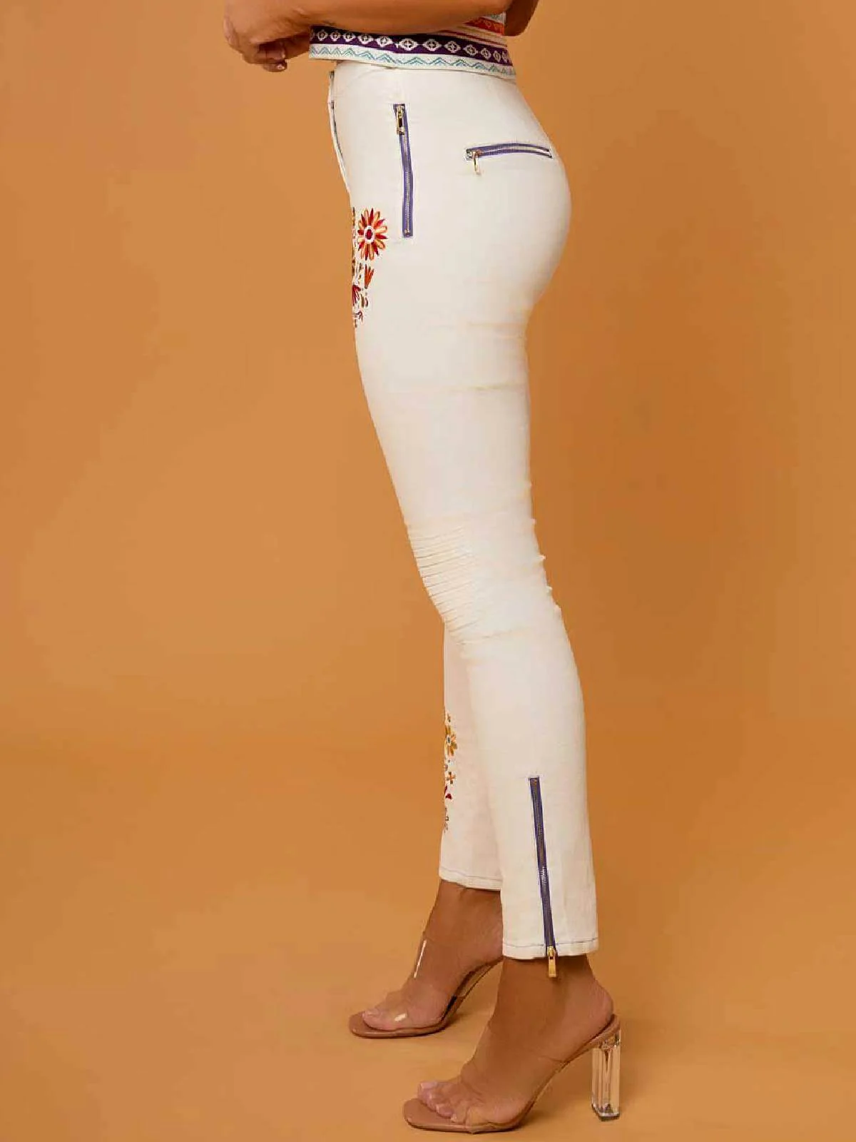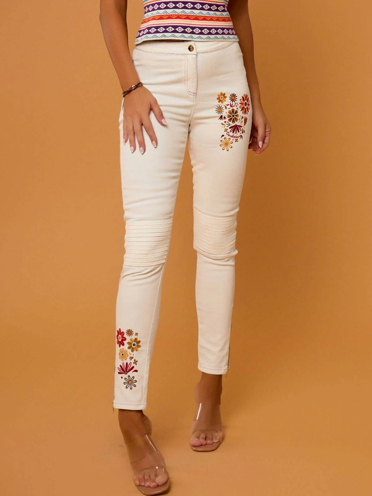 Pantalón de tejido vaquero en blanco con bordados en la parte delantera y en el camal. Lleva detalle de cremallera azul y falsos bolsillos laterales y en la parte trasera. Composición: 97% Algodón, 3% Elastano.