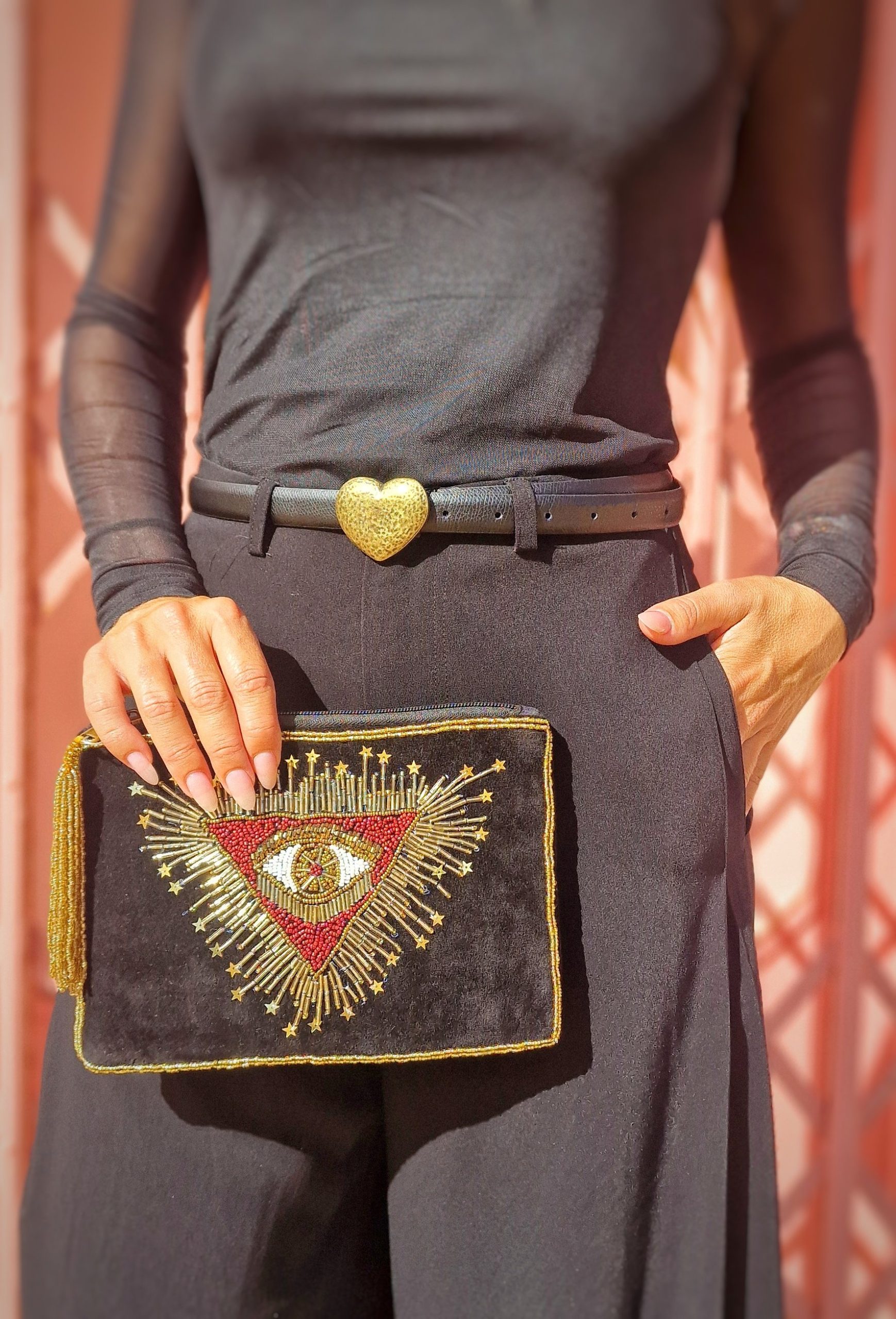 Pantalón campana color marrón tejido fluido con bolsillos.