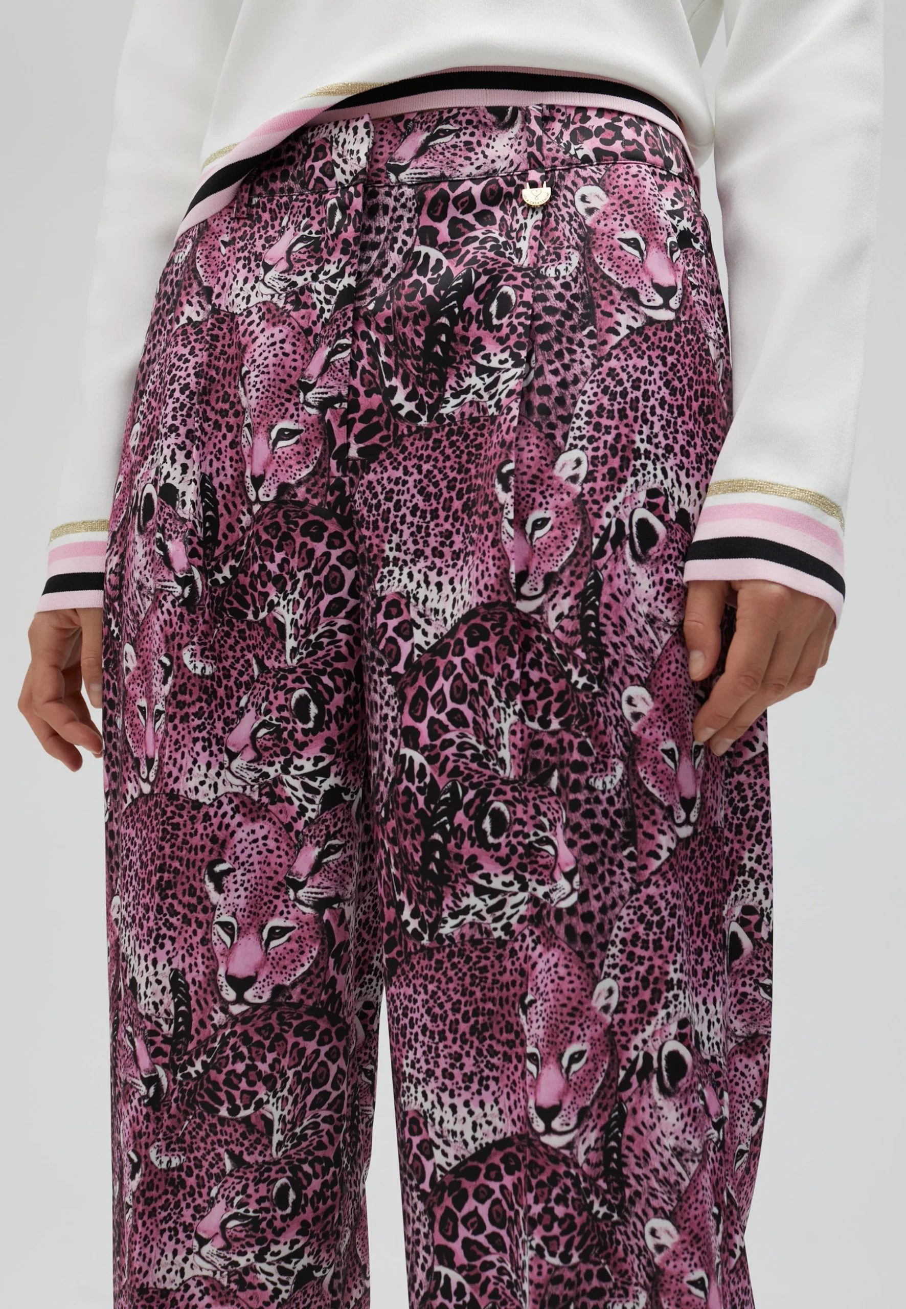 Pantalón recto y fluido con estampado animal en color rosa y negro combinados.