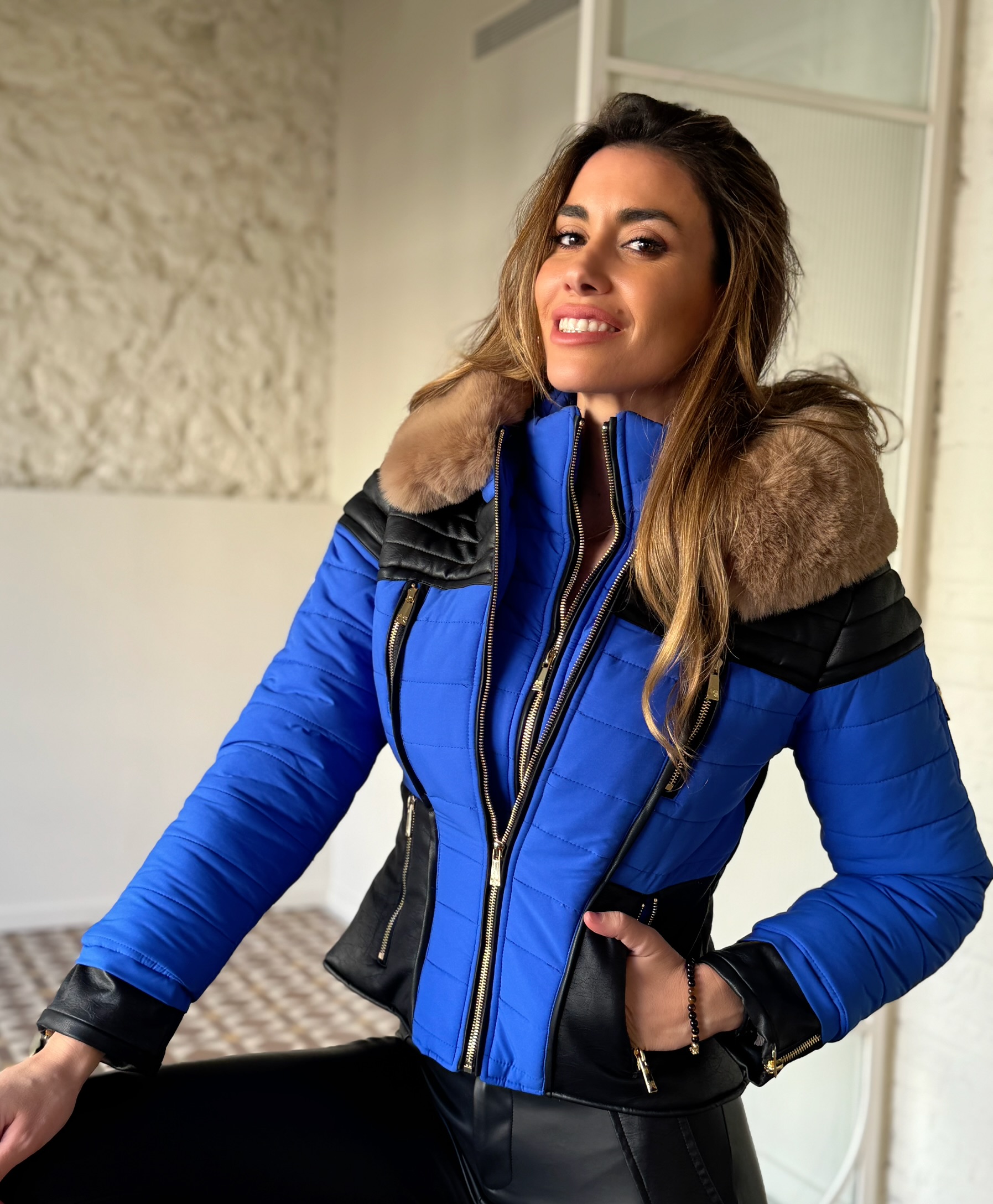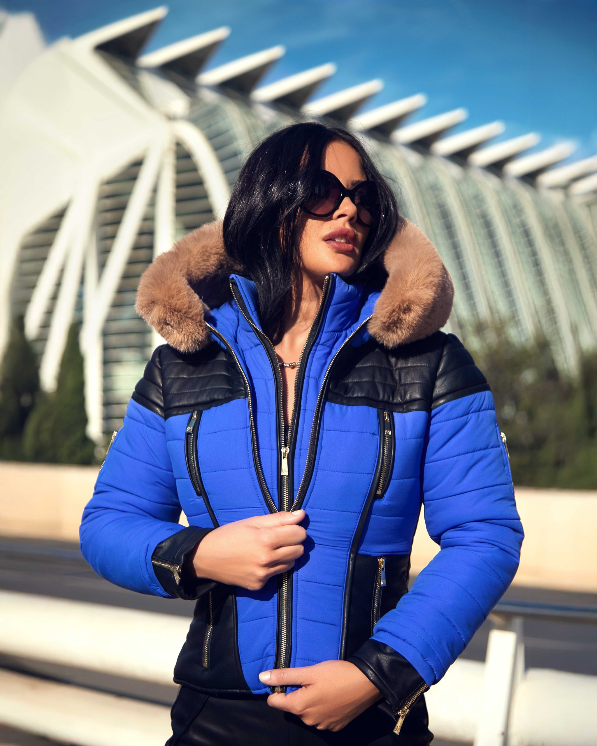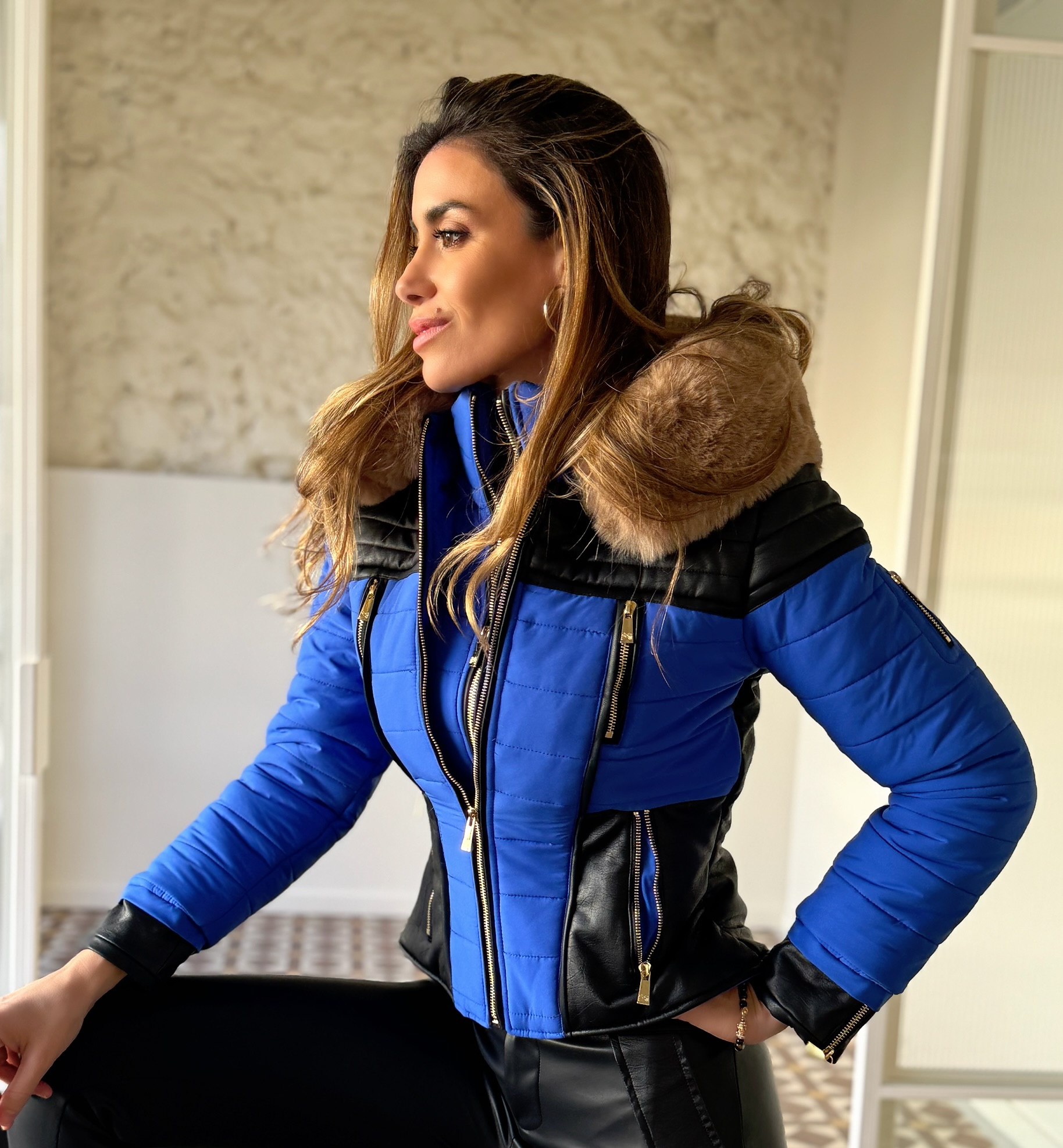 Abrigo plumas azul eléctrico con detalles de ecopiel negra. Capucha con pelo extraíble. Doble cremallera en la parte central. Dos bolsillos delanteros con cremallera dorada.
