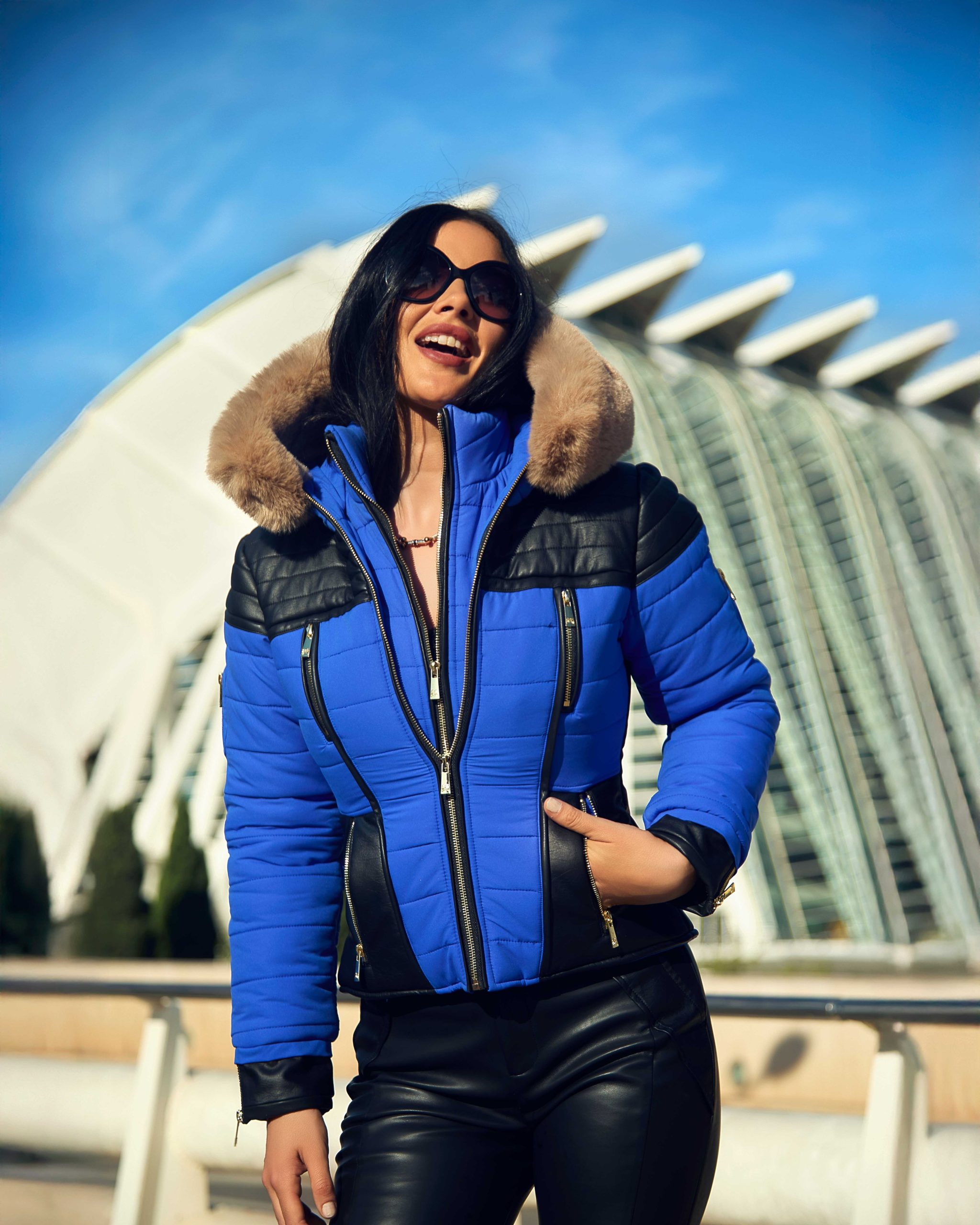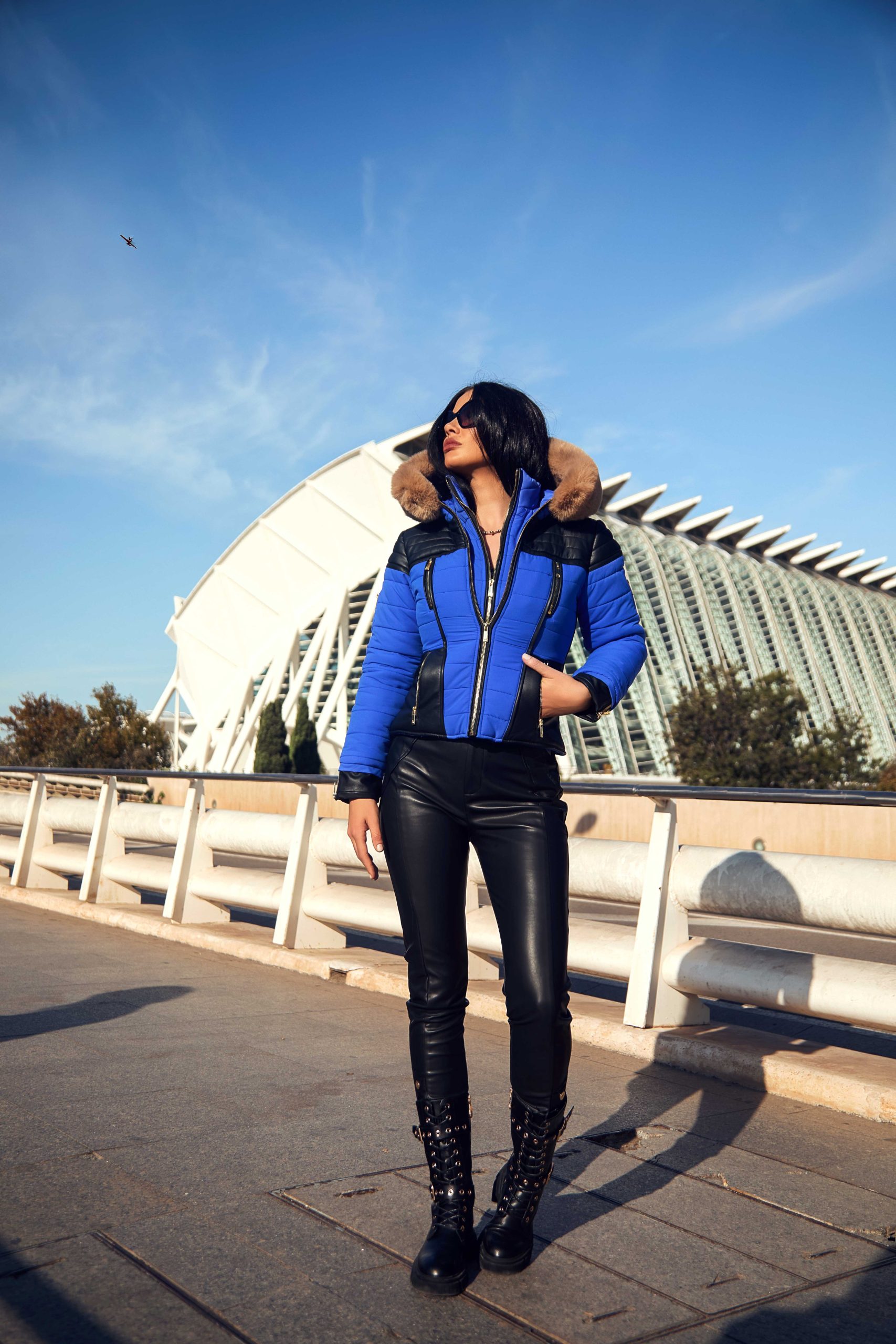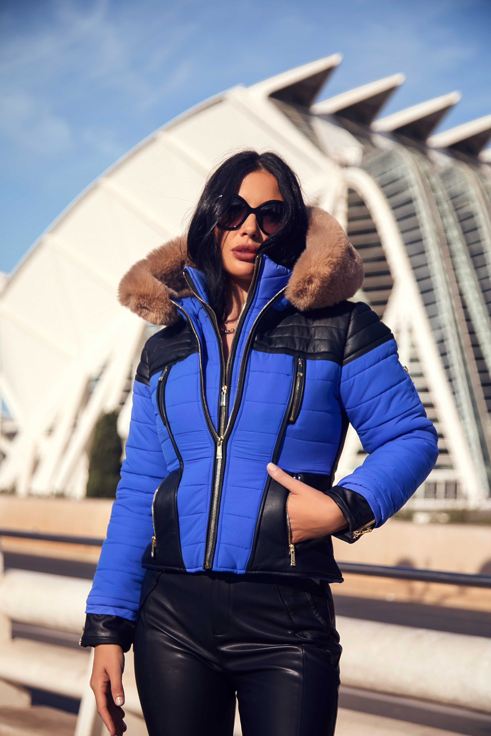Abrigo plumas azul eléctrico con detalles de ecopiel negra. Capucha con pelo extraíble. Doble cremallera en la parte central. Dos bolsillos delanteros con cremallera dorada.
