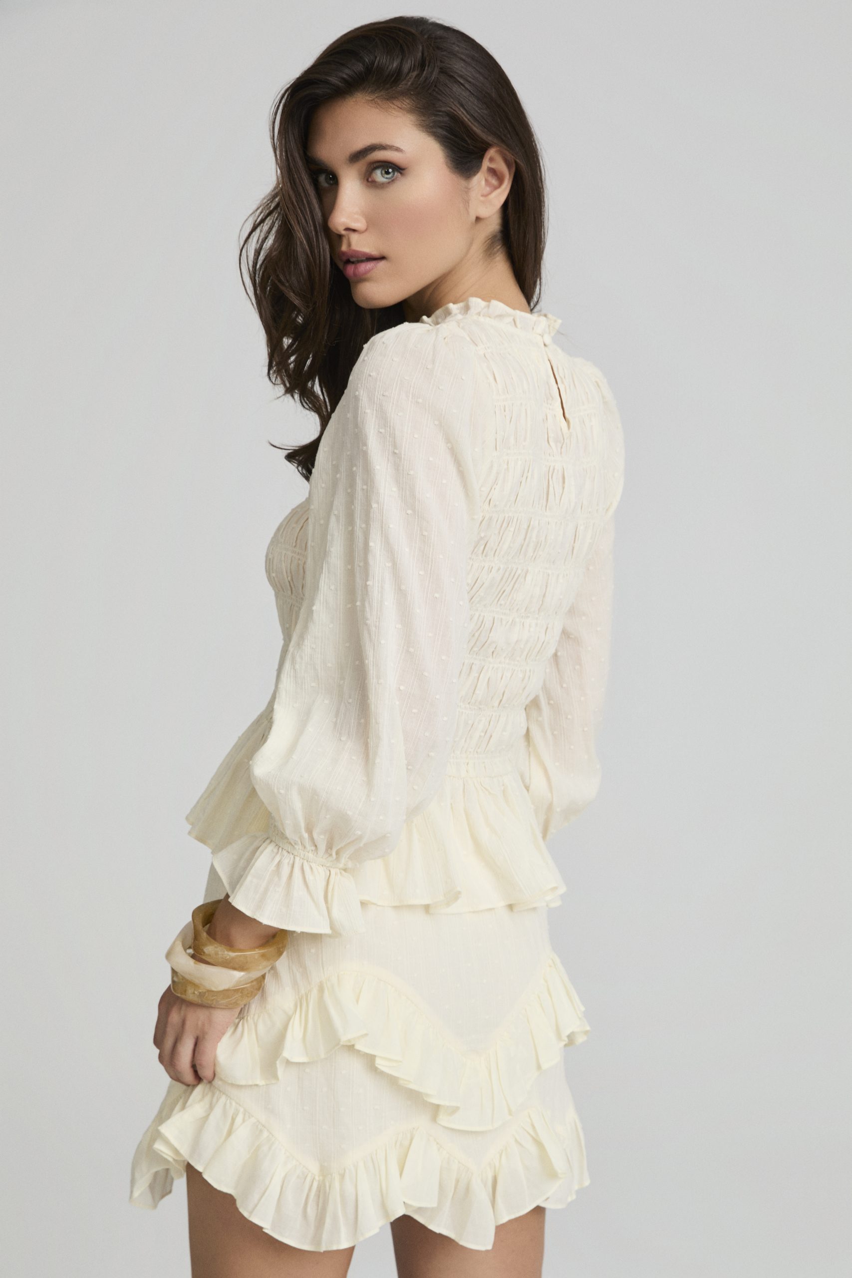 La falda, con sus volantes en cascada, aporta movimiento y ligereza, logrando el equilibrio perfecto entre sofisticación y sencillez que caracteriza a Fetiche Suances.