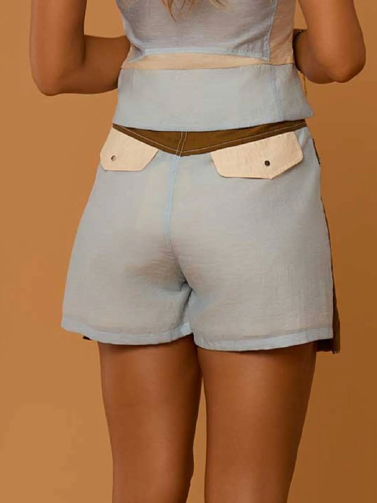 Pantalón corto, en tono azul claro, con detalles marrones. Lleva unos bolsillos grandes laterales, con el logo de la marca bordado y cremallera plateada. Se cierra con cremallera y botón en la parte delantera. En la parte trasera lleva dos bolsillos y detalle marrón en la parte de la cintura. Composición: 37% Loycell, 26% Viscosa , 21% Poliamida ,16% Algodón.