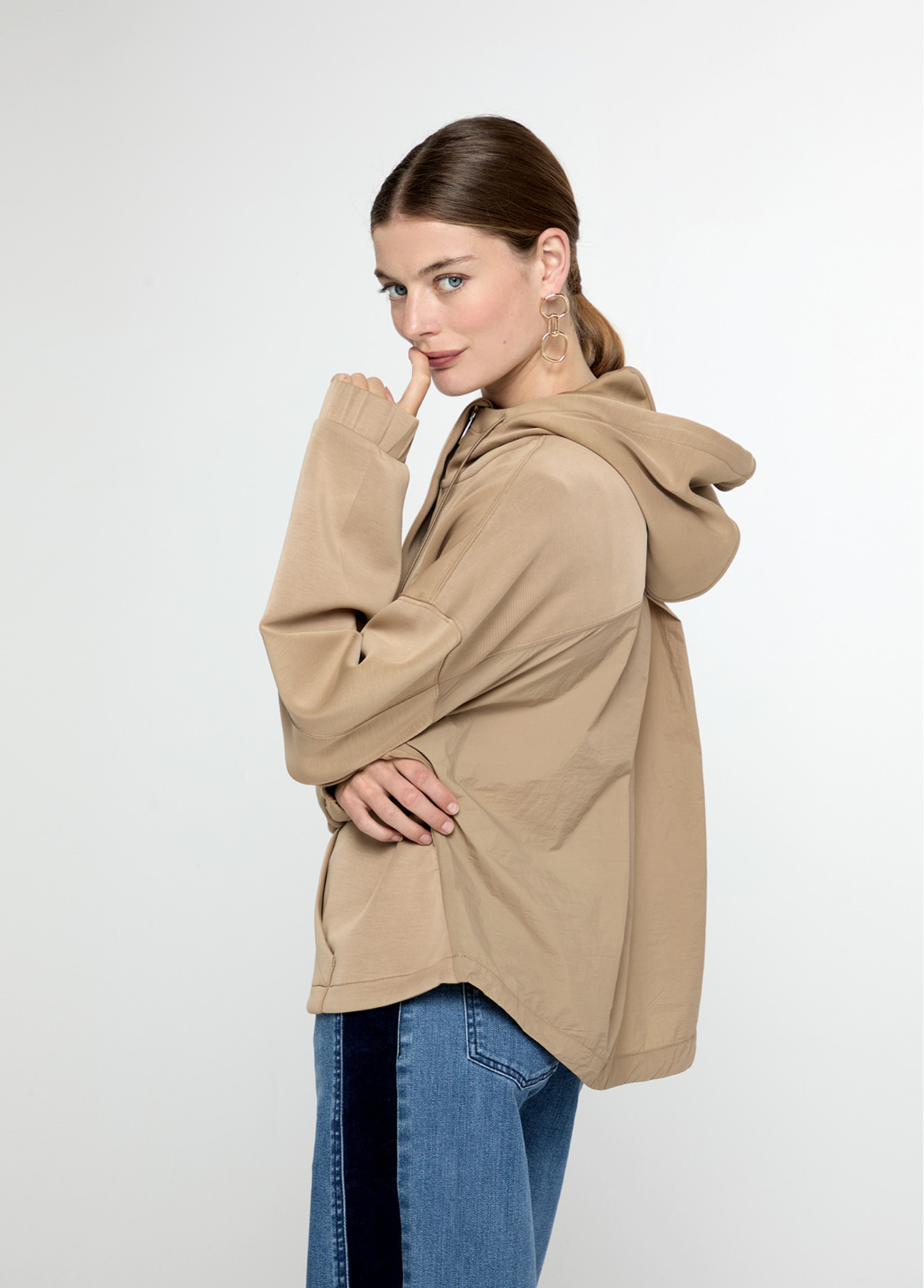 Sudadera en color camel con bolsillo delantero y logo frontal. Cremallera en tapeta y cordón ajustable en la capucha. Detalle espalda con tejido y corte voluminoso.