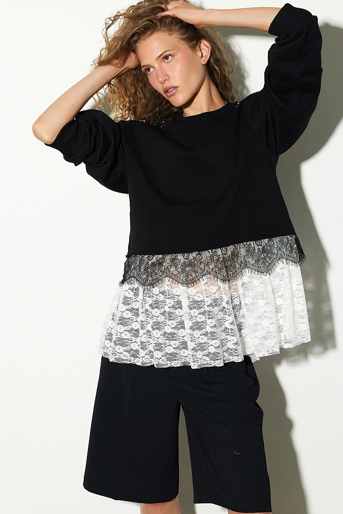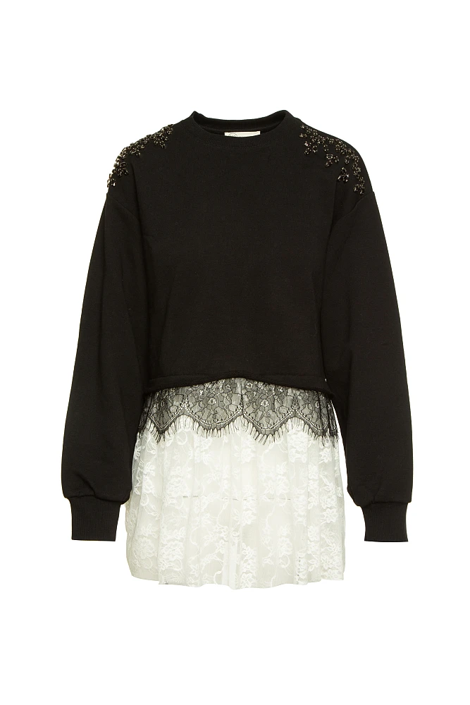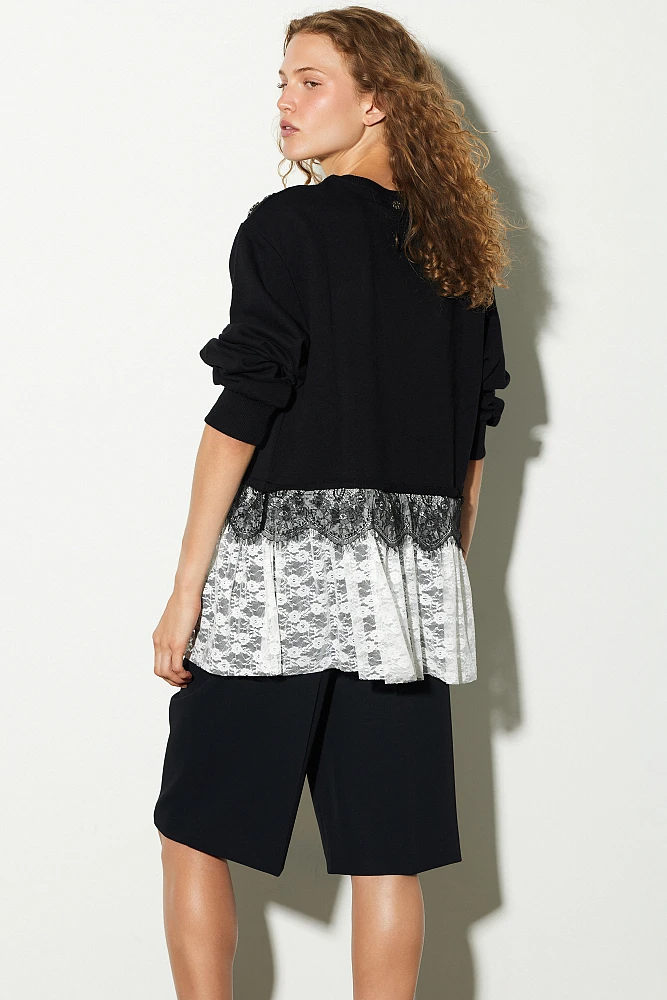 Sudadera, manga larga, escote redondo, con encaje, con aplicación de pedrería en los hombros, corte regular, algodón.