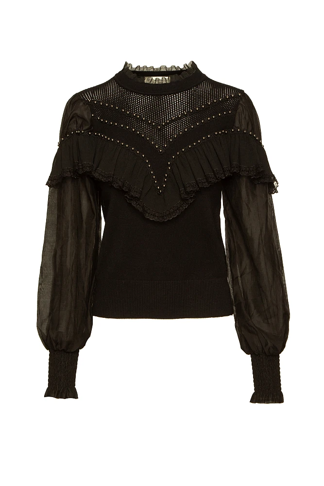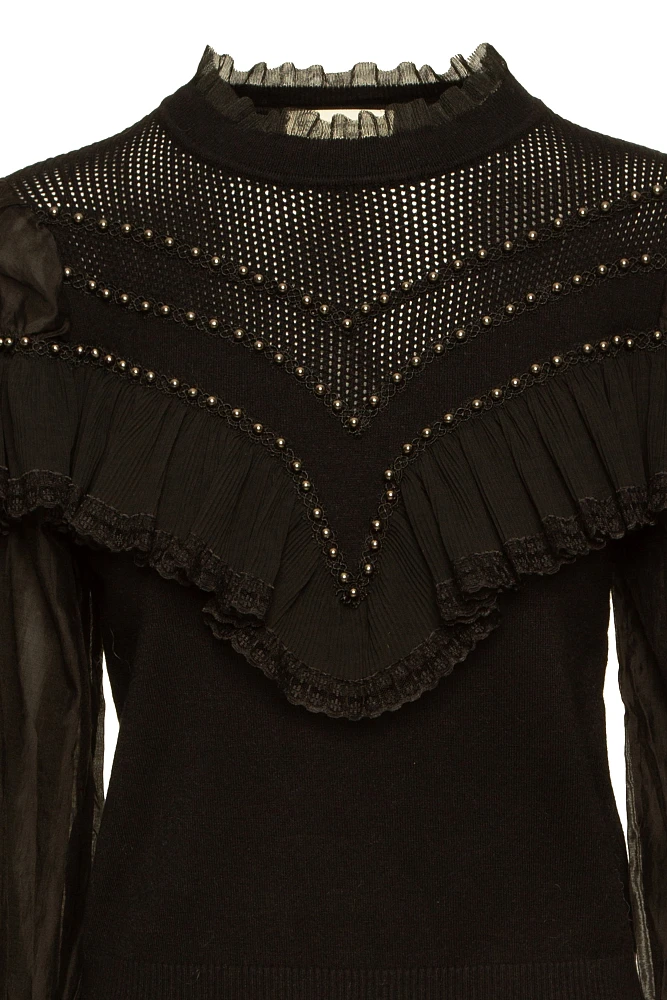 Suéter con mangas de tul y cuentas, manga larga, tejido elástico, con detalles de bordado y calados, con cuello alto, tejido acanalado en los puños, corte regular.