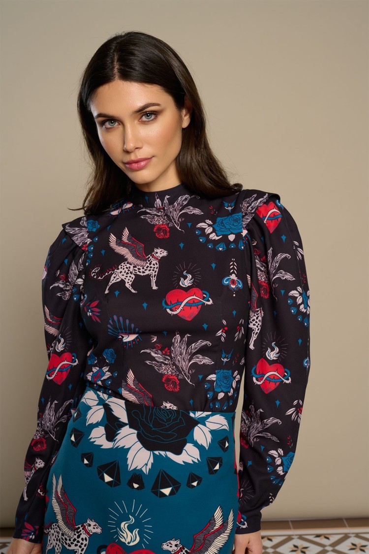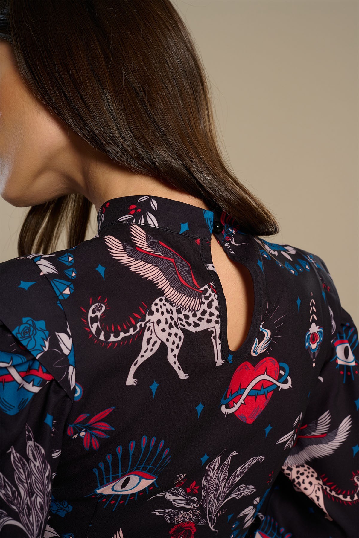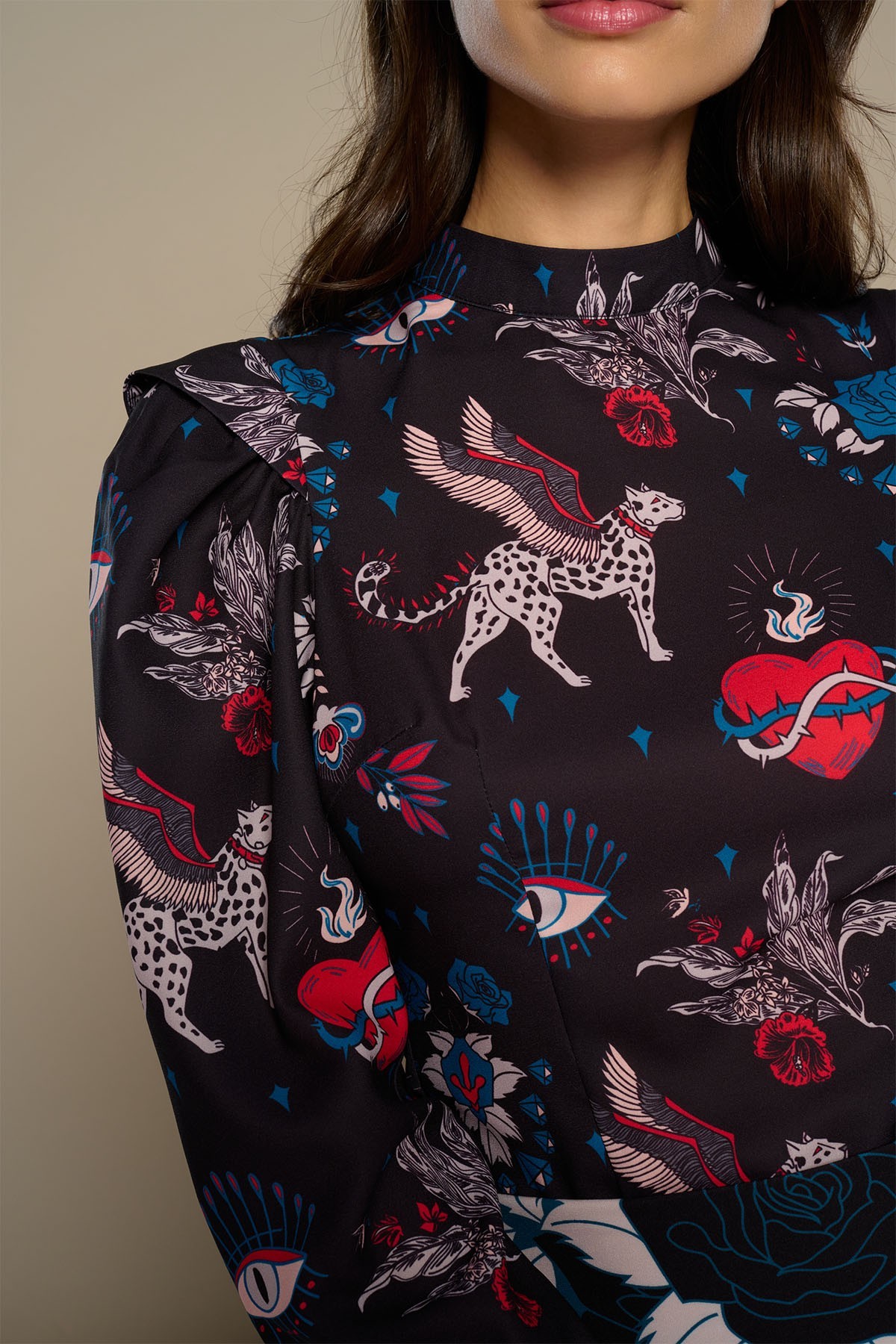 Top de cuello Perkins y manga larga. Estampado místico gatos alados y corazones. Cierre en espalda con abertura y botón. La modelo mide 1,78 m y lleva la talla S.